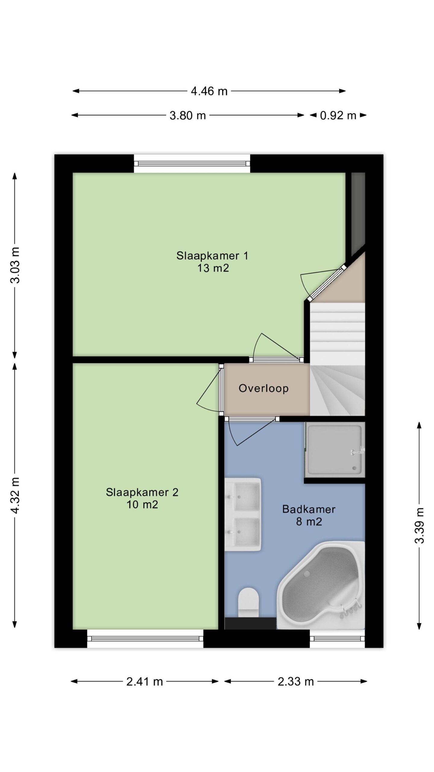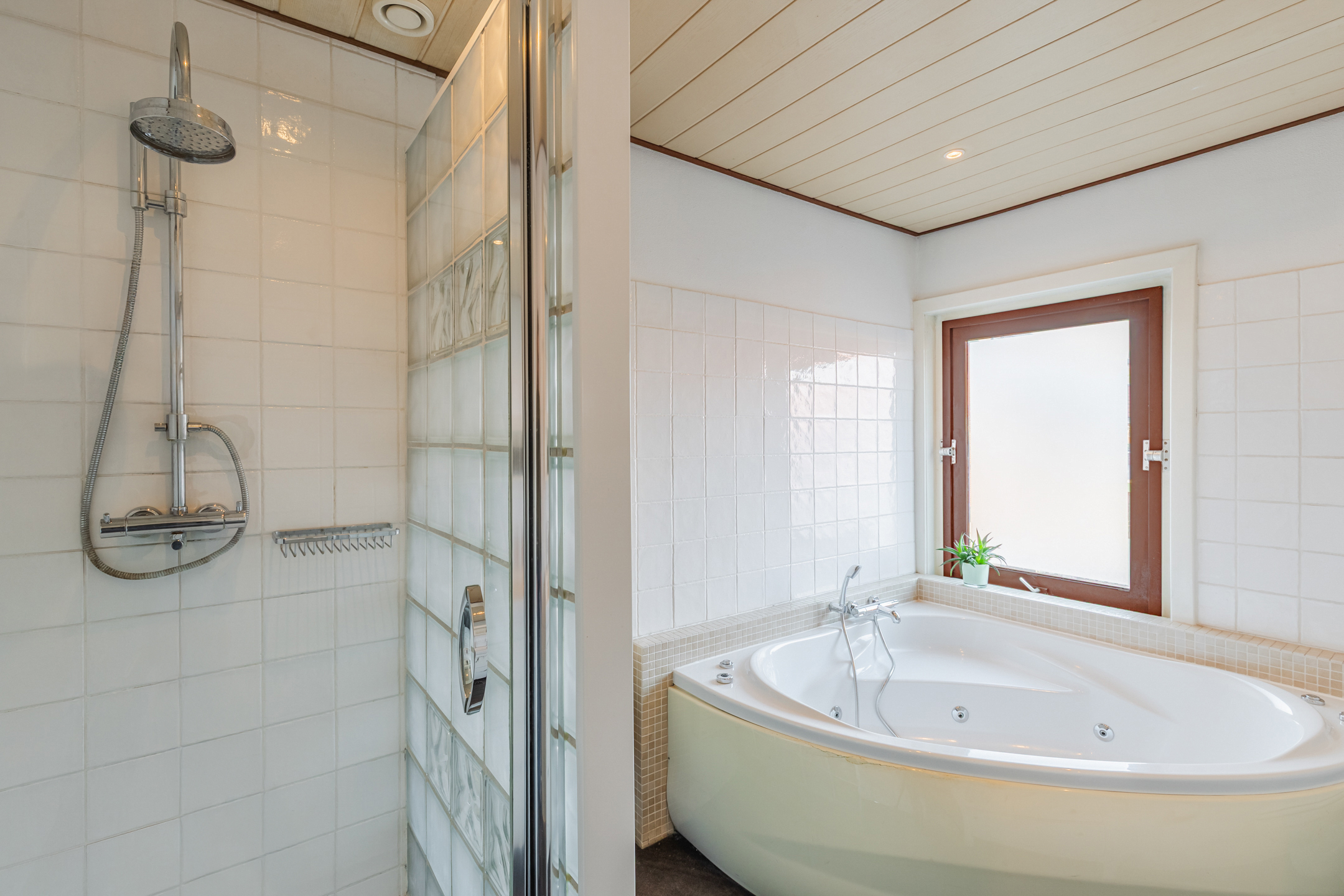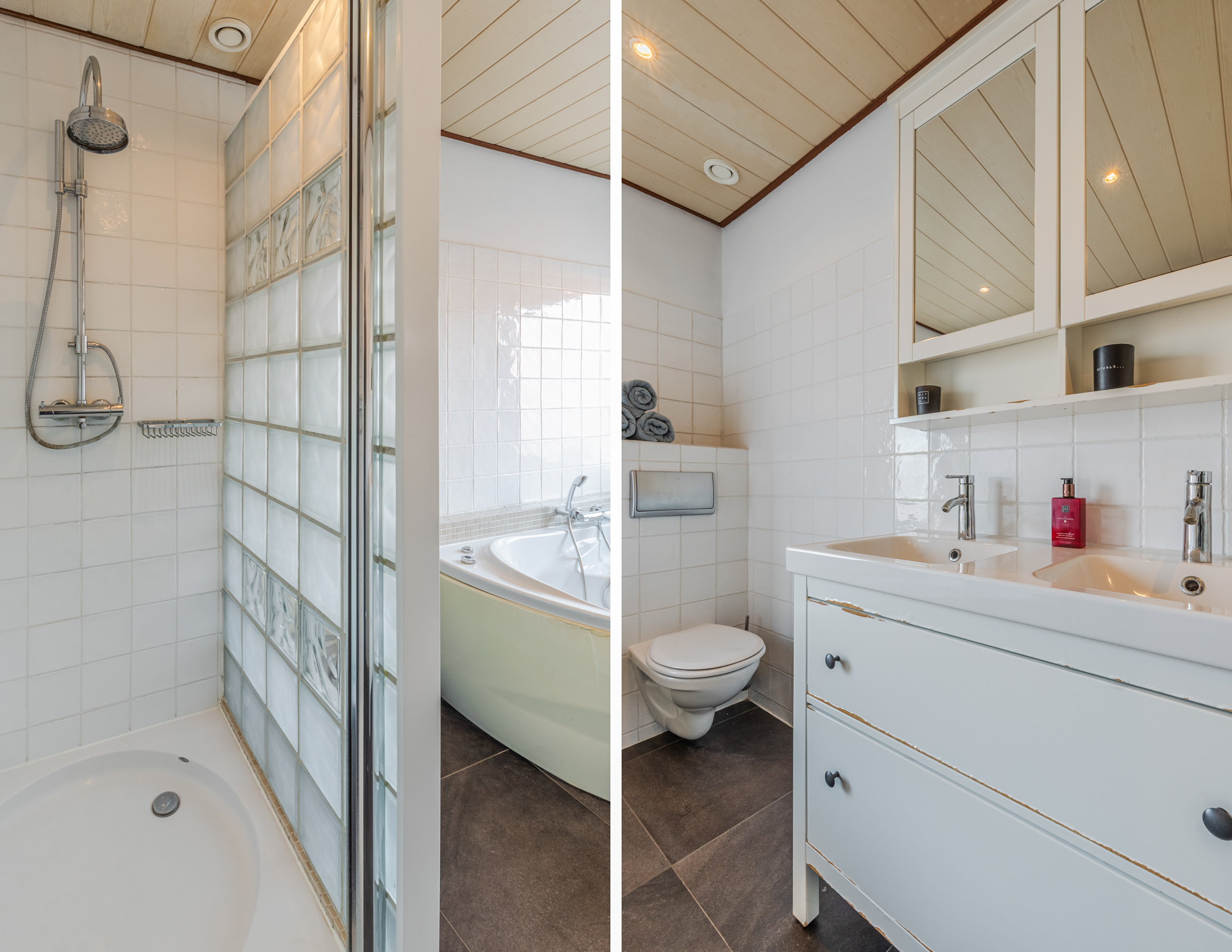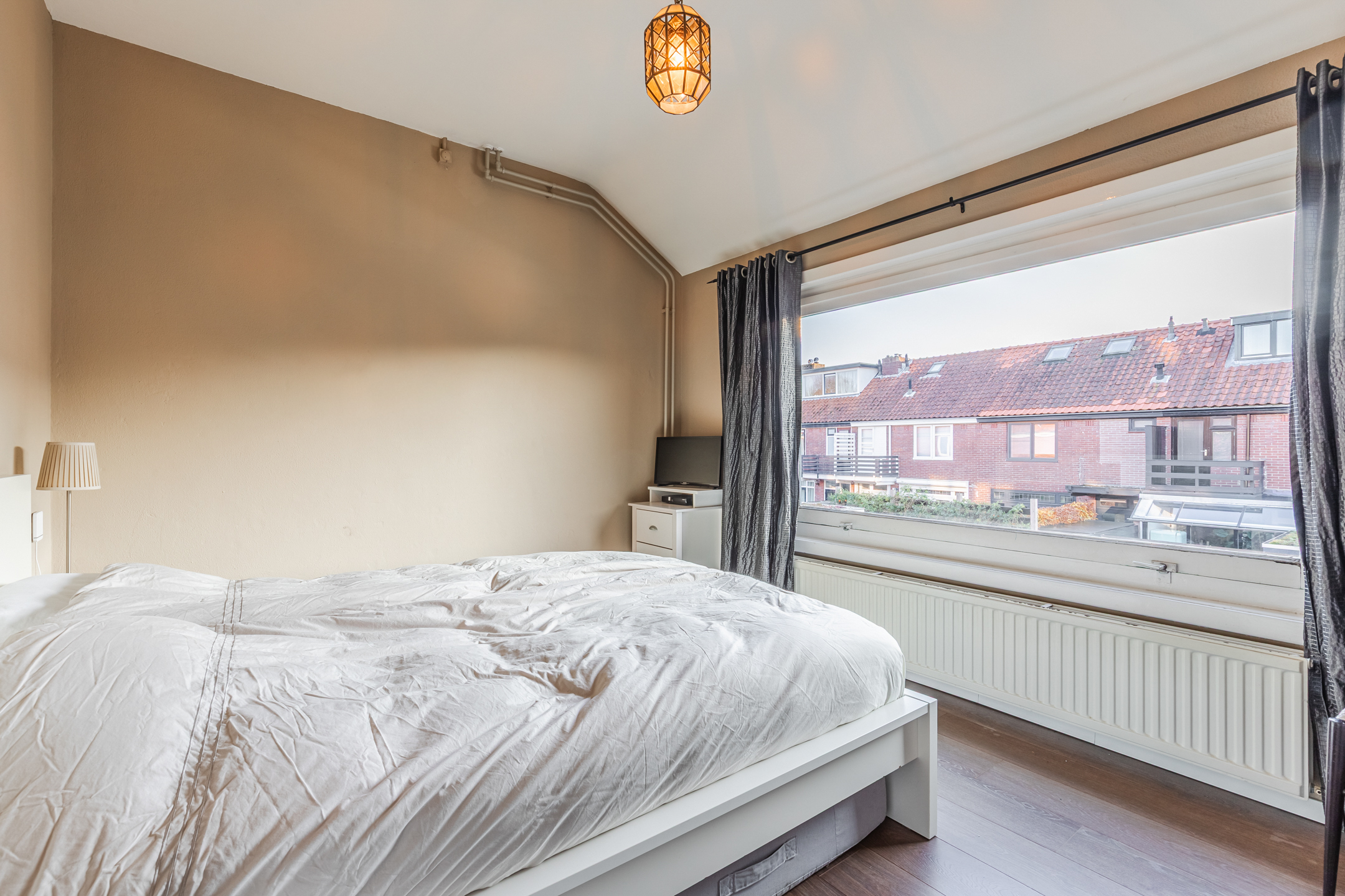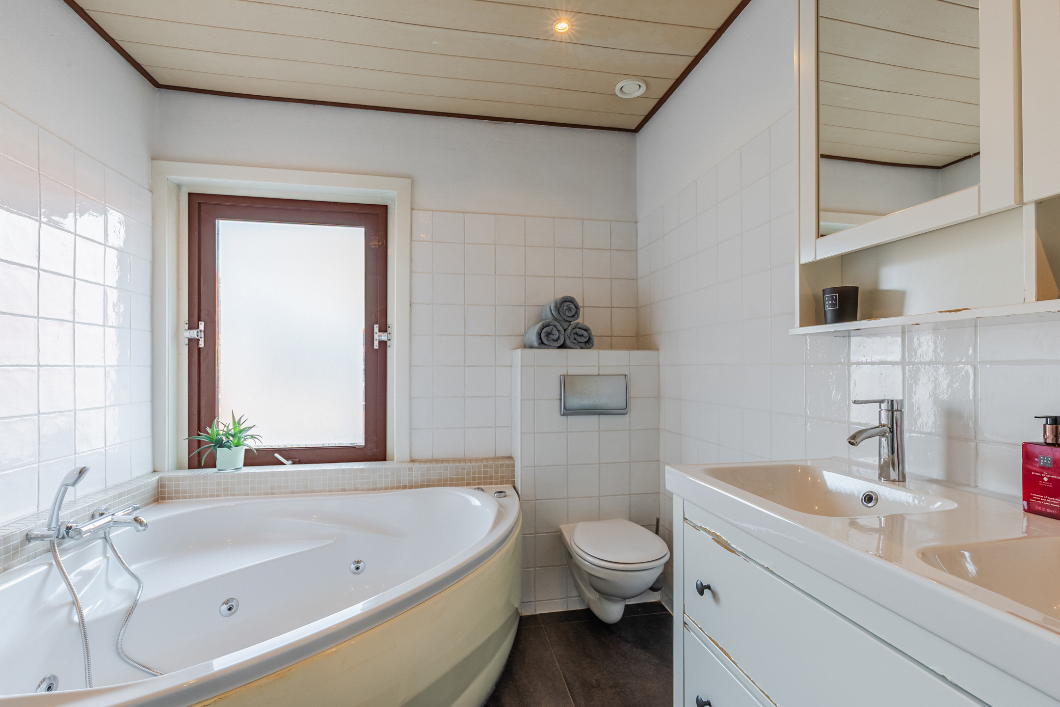 Overloop; slaapkamer achterzijde (ca. 3.00x4.50 m.) met laminaat vloer en airconditioning; slaapkamer voorzijde (ca. 2.40x4.30 m.) met parket vloer en een gedeeltelijk betegelde royale badkamer (ca. 2.30x3.40 m.) voorzien van ligbad met whirlpool installatie, separate douche, wastafel in meubel en wandcloset voorzien van inbouwreservoir.