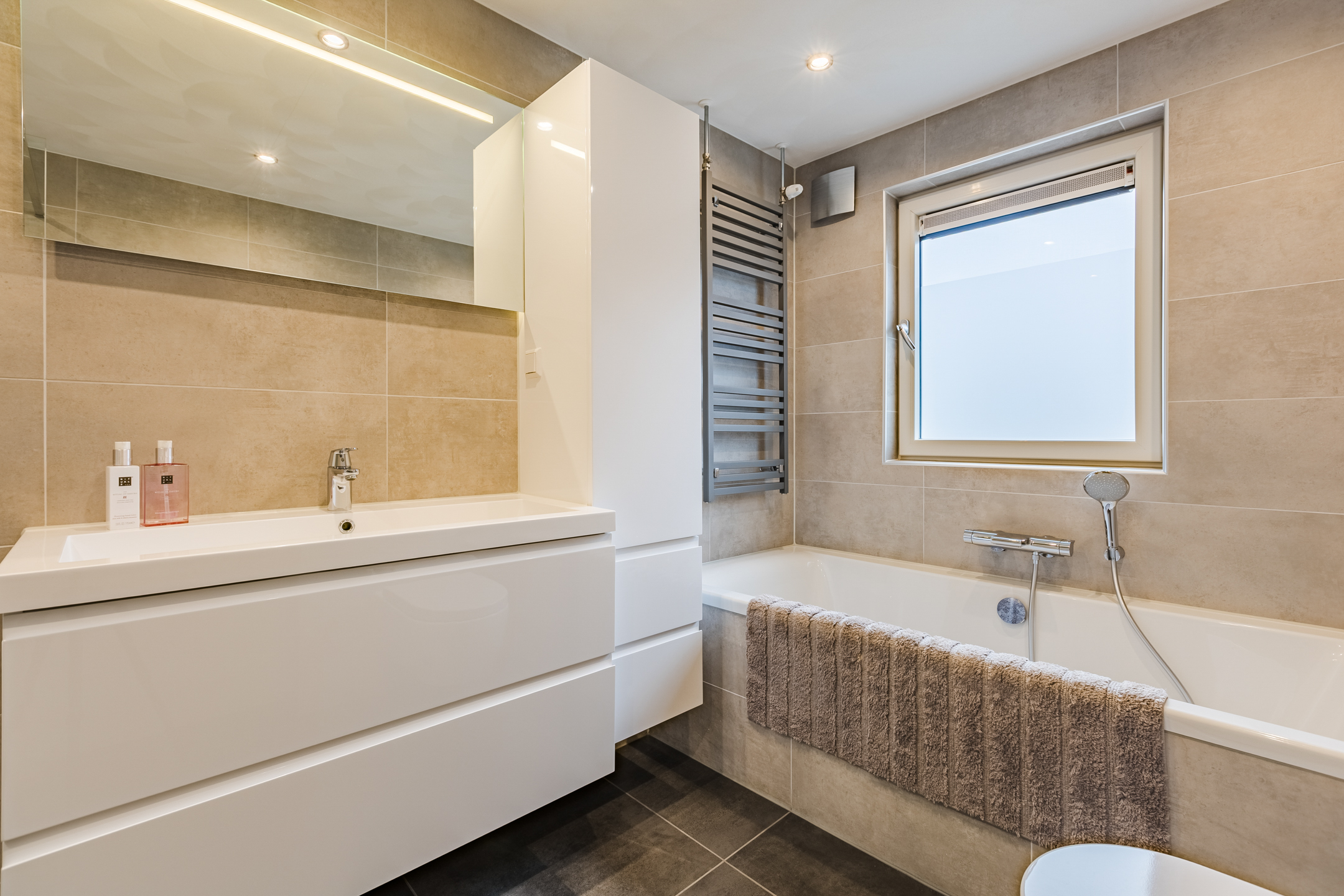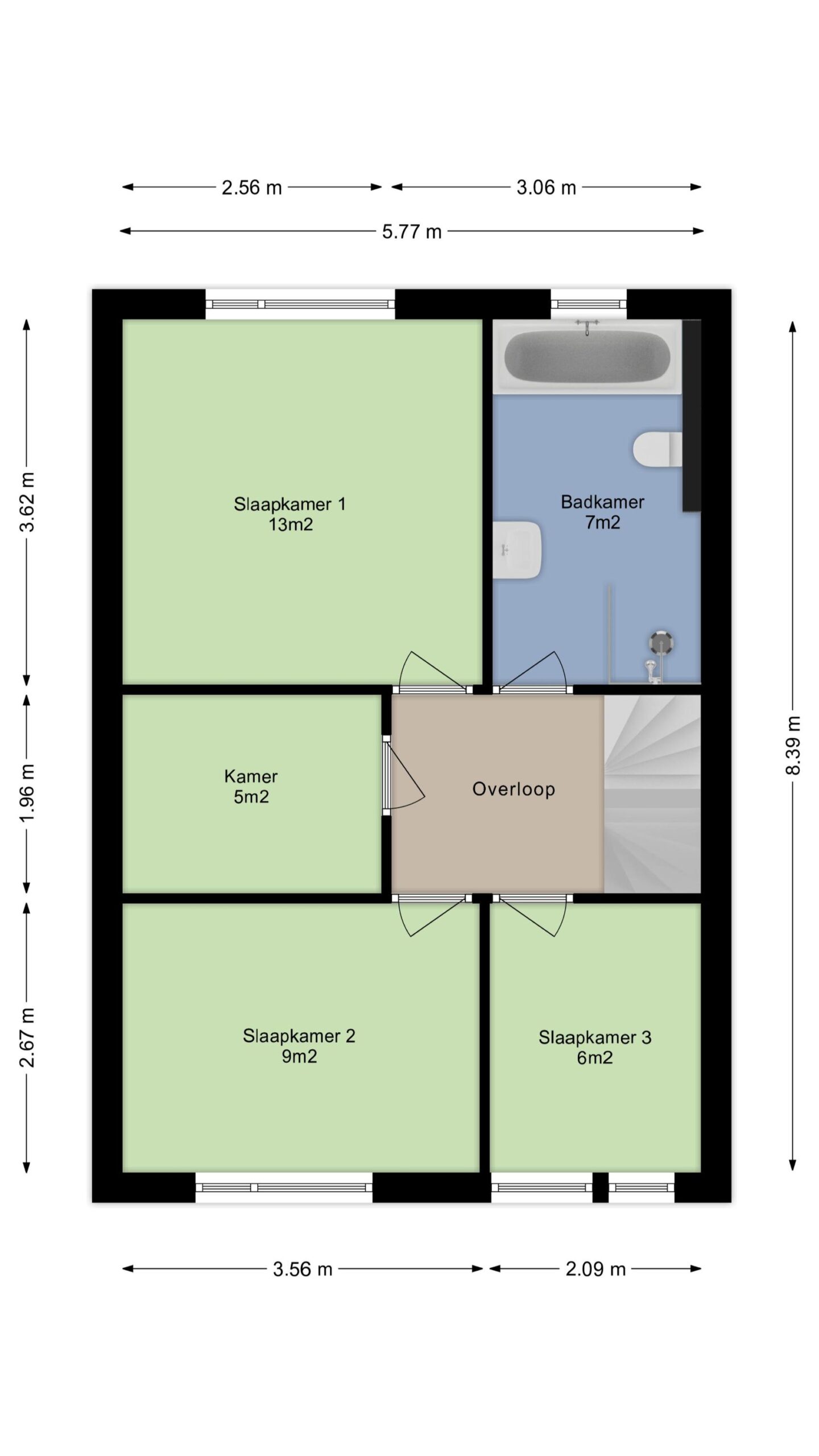 Slaapkamer I (ca. 2.10 x 2.65 m.) aan de voorzijde; slaapkamer II (ca. 3.55 x 2.65 m.) aan de voorzijde; slaapkamer III (ca. 3.60 x 3.60 m.) aan de achterzijde; praktische inloopkast (ca. 2.00 x 2.55 m.); geheel betegelde luxe badkamer (ca. 2.10 x 3.60 m.) met ligbad, inloopdouche, extra brede wastafel in meubel, wandcloset voorzien van inbouw reservoir en een design radiator.