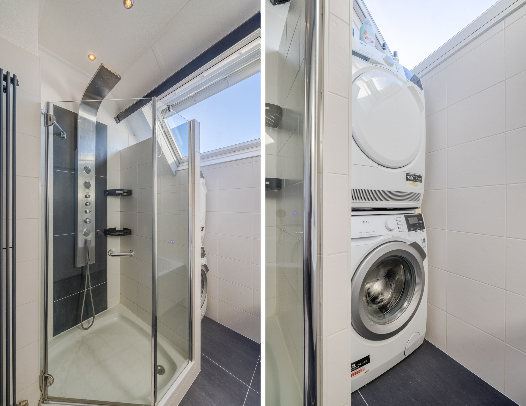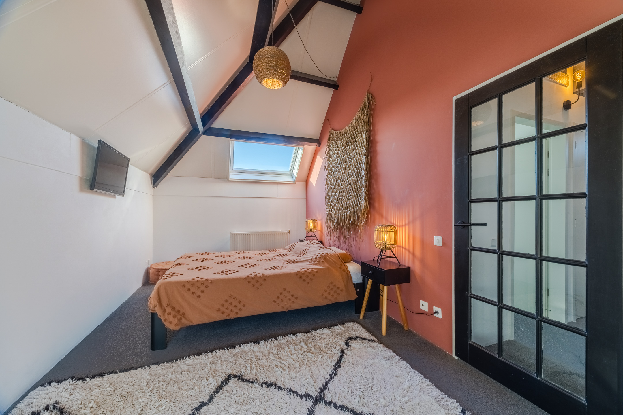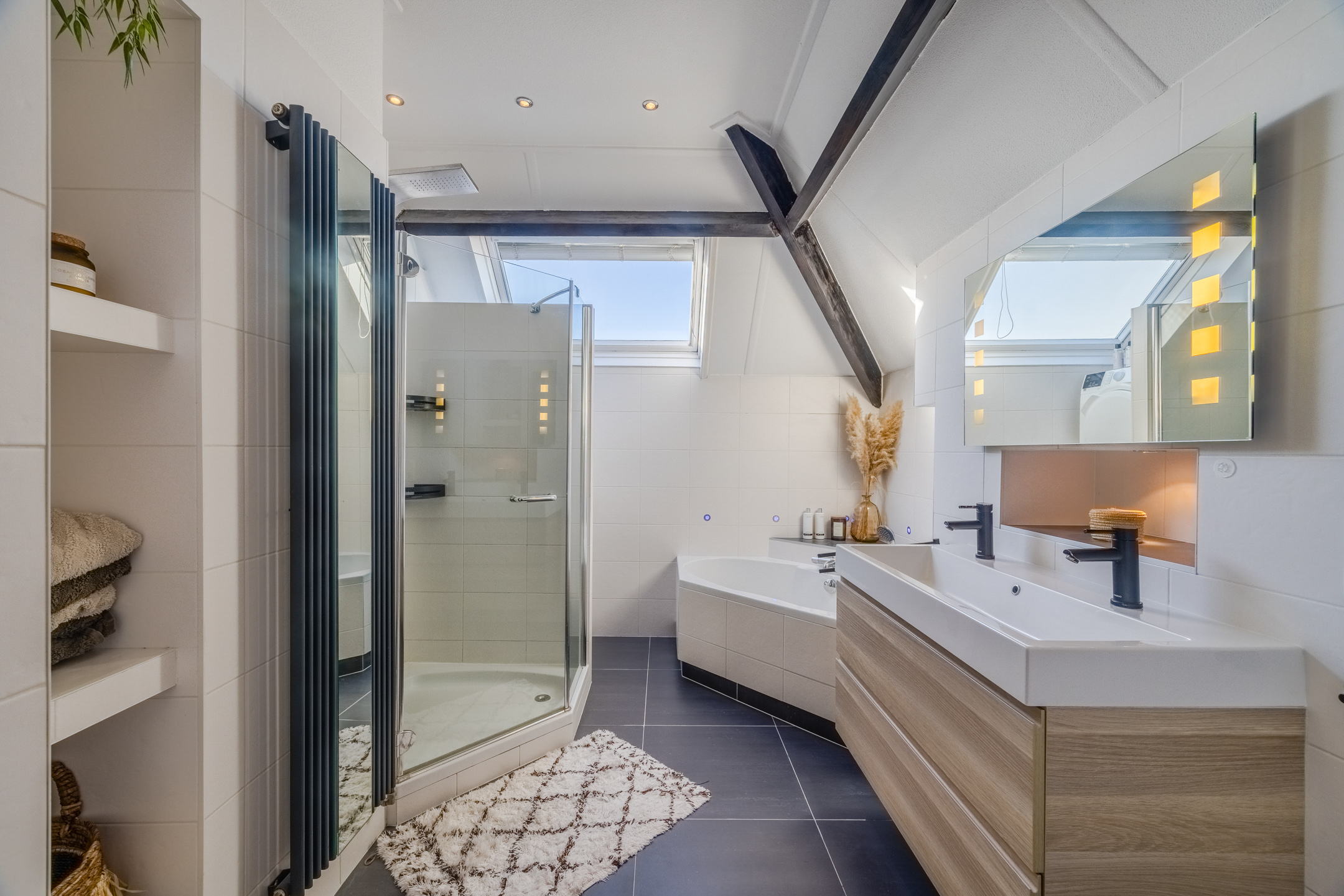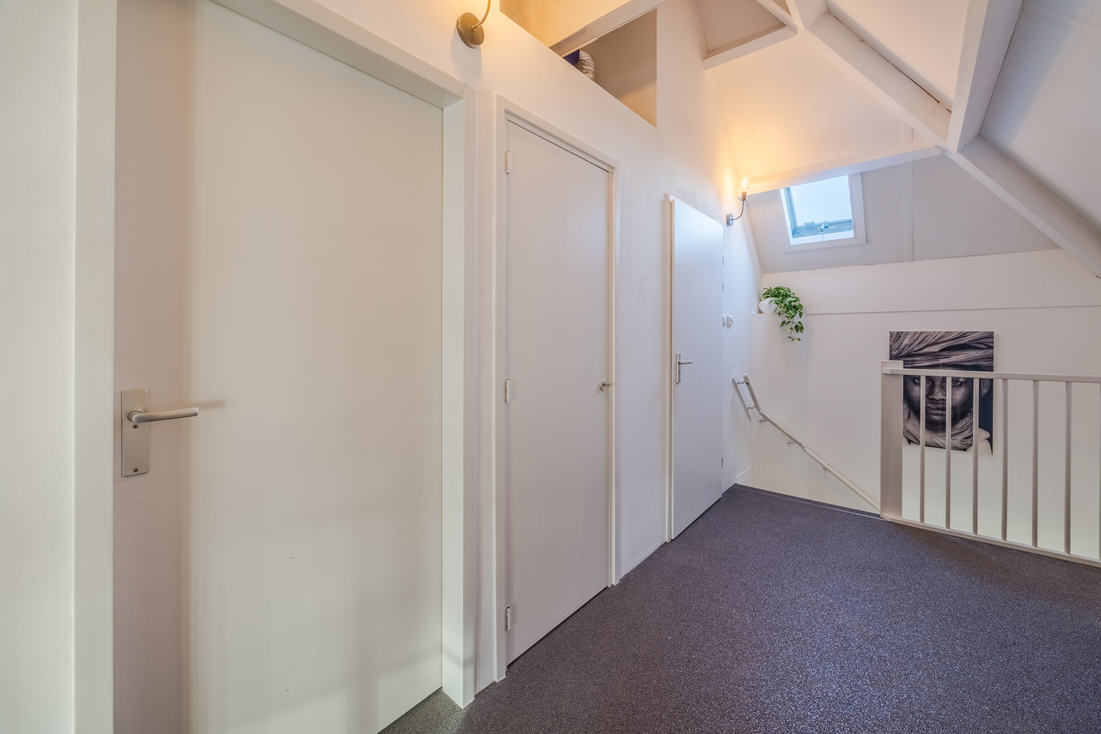 Deze verdieping heeft twee slaapkamers van resp. 16m² en 7m², een ruime overloop en een goed ingedeelde, moderne badkamer. De grootste slaapkamer (ca. 16m²) heeft een prachtig hoekraam en veel hoogte. De luxe badkamer heeft een hoekbad, separate douchecabine en dubbele wastafel. Ook is hier ruimte gecreëerd voor de wasmachine en droger. De overloop heeft een gangkast met opstelplaats van de CV-combiketel (ca. 2013) en biedt extra ruimte voor kasten of een werkruimte. Vanuit deze verdieping is de bergzolder bereikbaar. De overloop en de slaapkamers zijn voorzien van een 'korreltapijt' vloer.