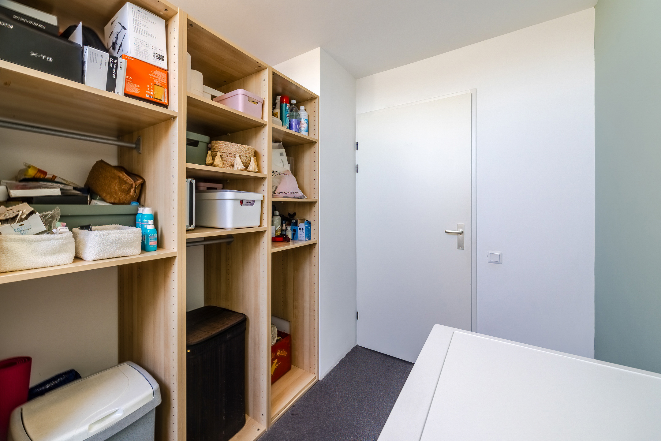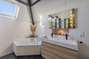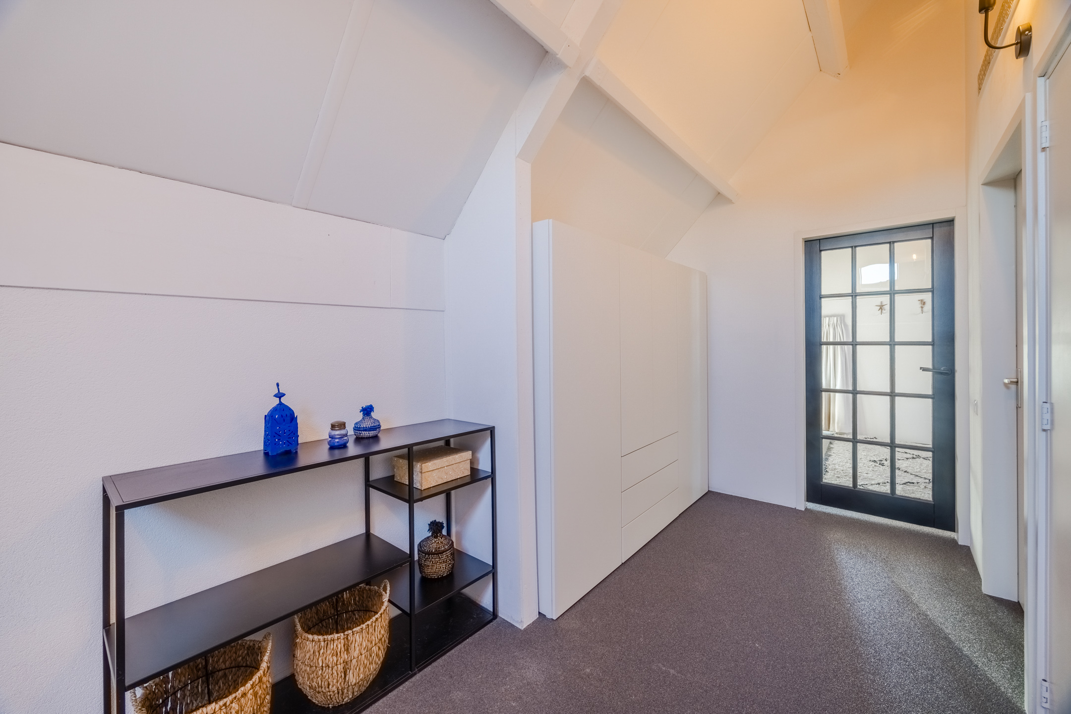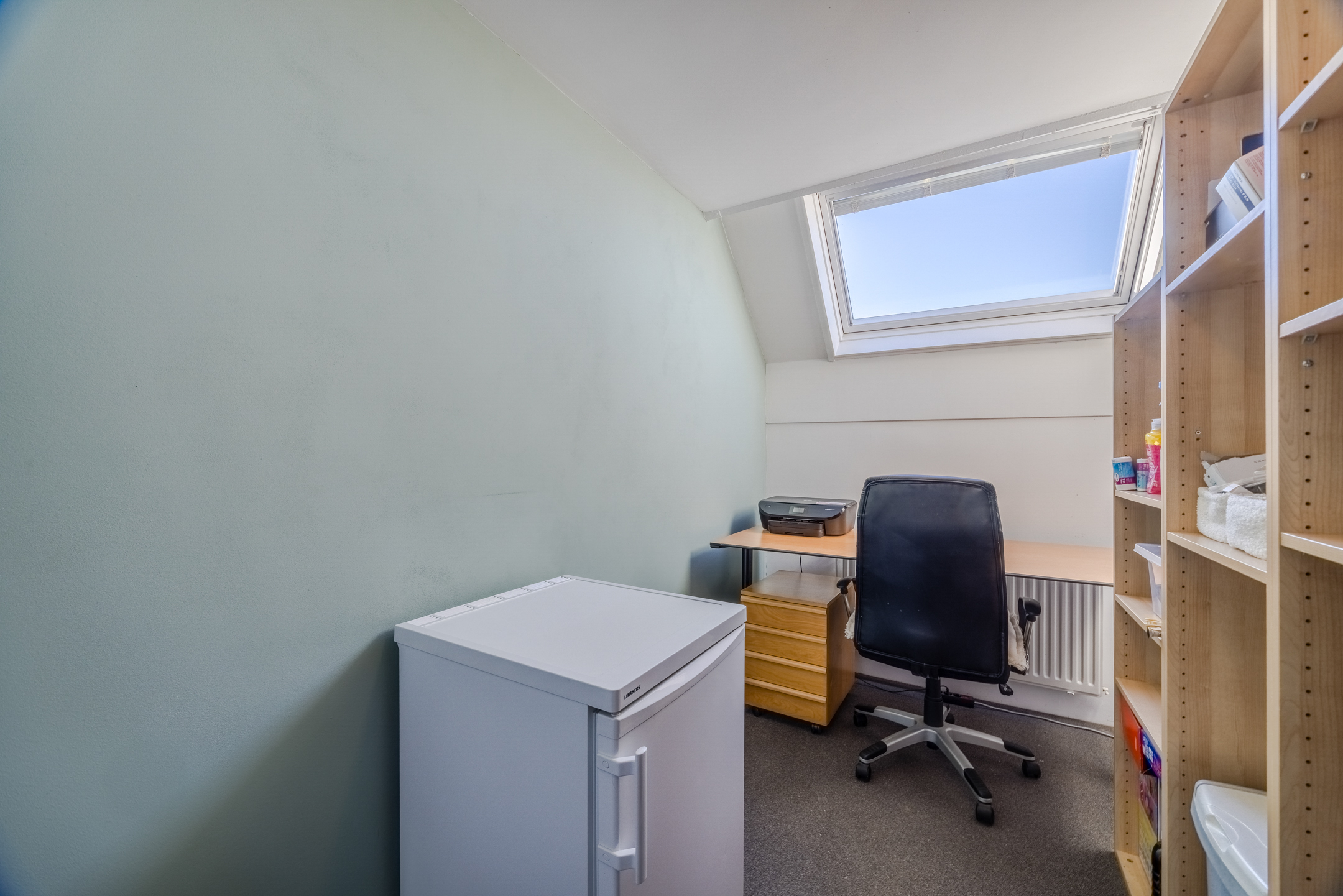Deze verdieping heeft twee slaapkamers van resp. 16m² en 7m², een ruime overloop en een goed ingedeelde, moderne badkamer. De grootste slaapkamer (ca. 16m²) heeft een prachtig hoekraam en veel hoogte. De luxe badkamer heeft een hoekbad, separate douchecabine en dubbele wastafel. Ook is hier ruimte gecreëerd voor de wasmachine en droger. De overloop heeft een gangkast met opstelplaats van de CV-combiketel (ca. 2013) en biedt extra ruimte voor kasten of een werkruimte. Vanuit deze verdieping is de bergzolder bereikbaar. De overloop en de slaapkamers zijn voorzien van een 'korreltapijt' vloer.