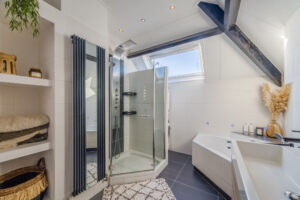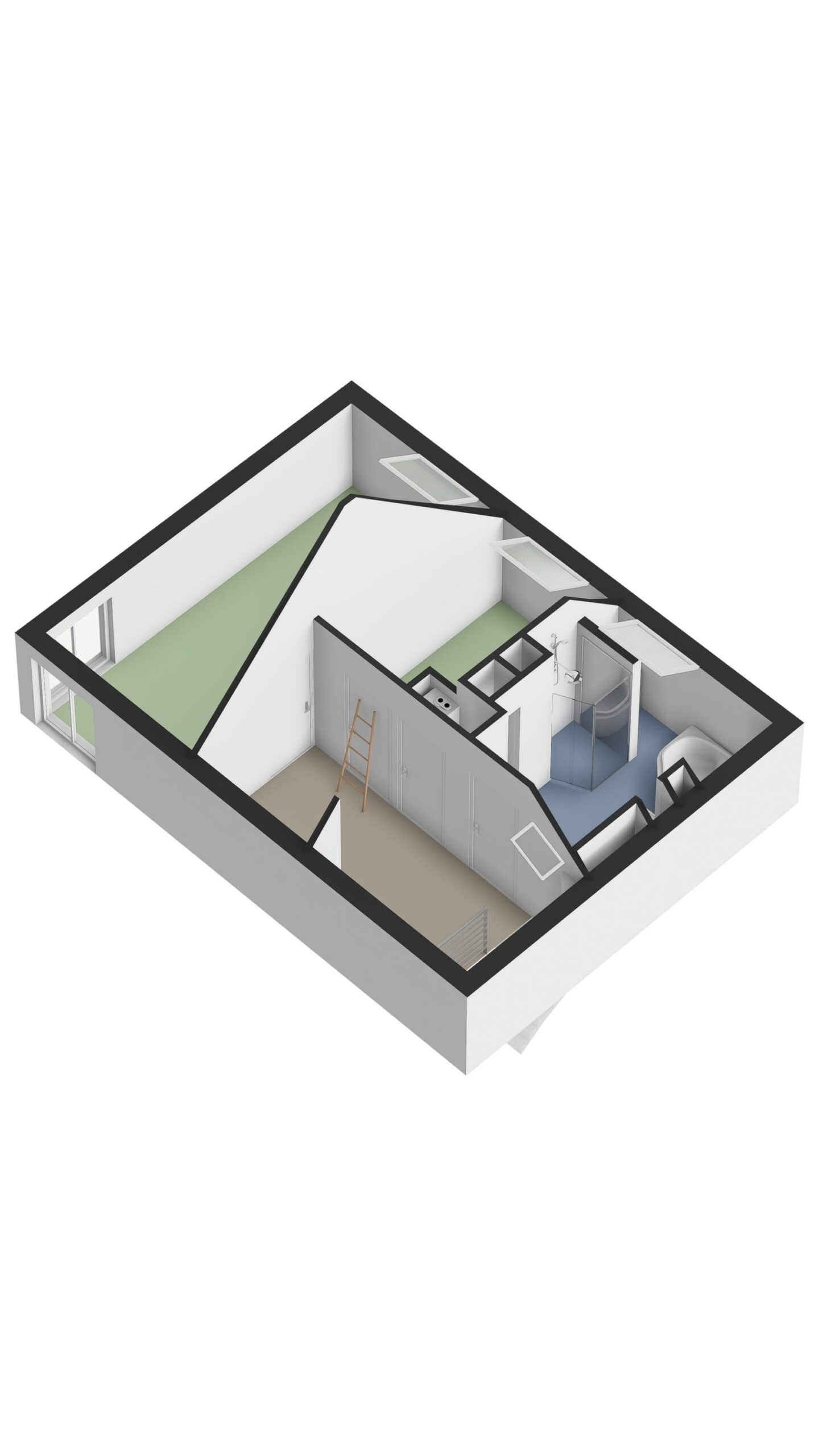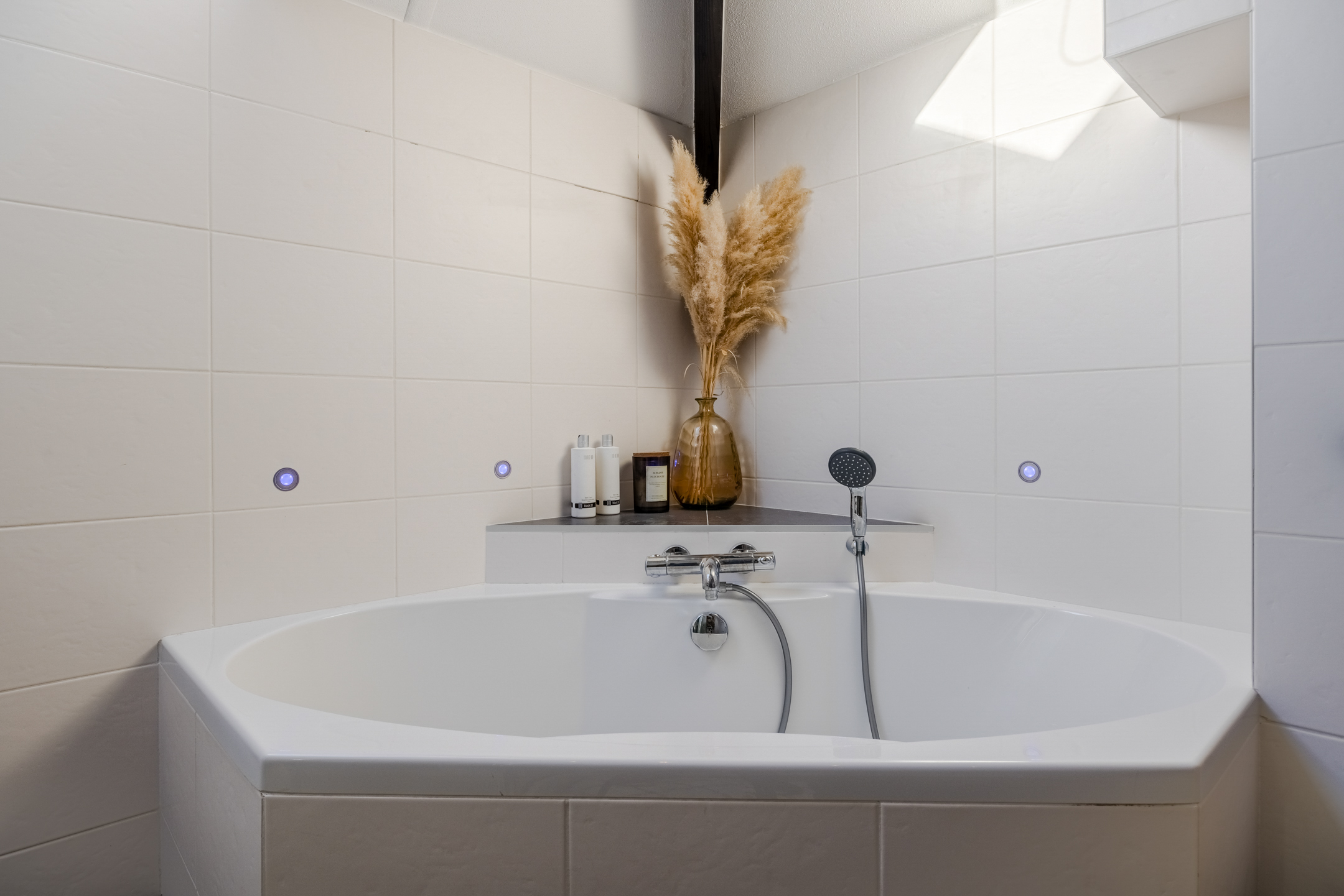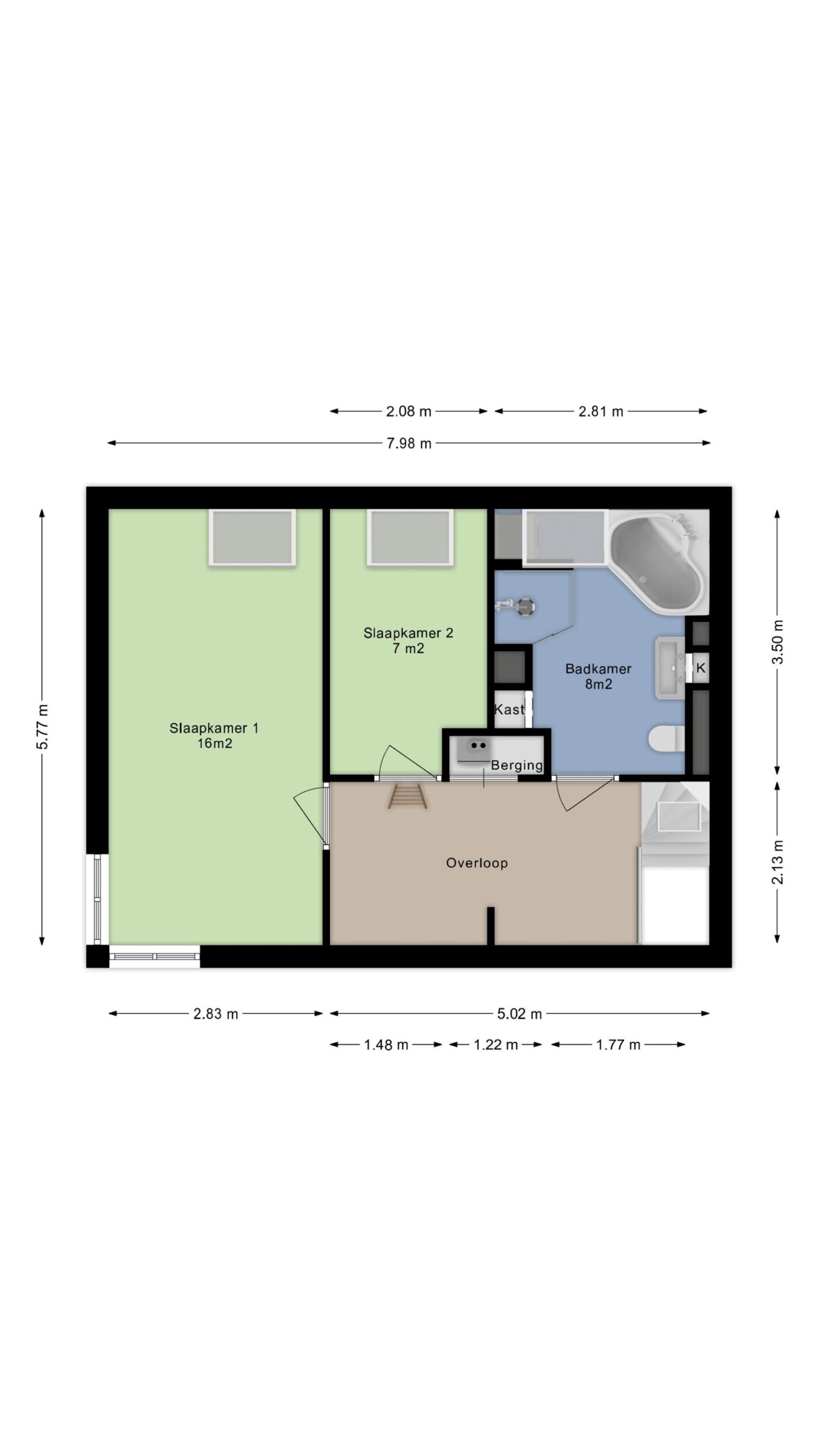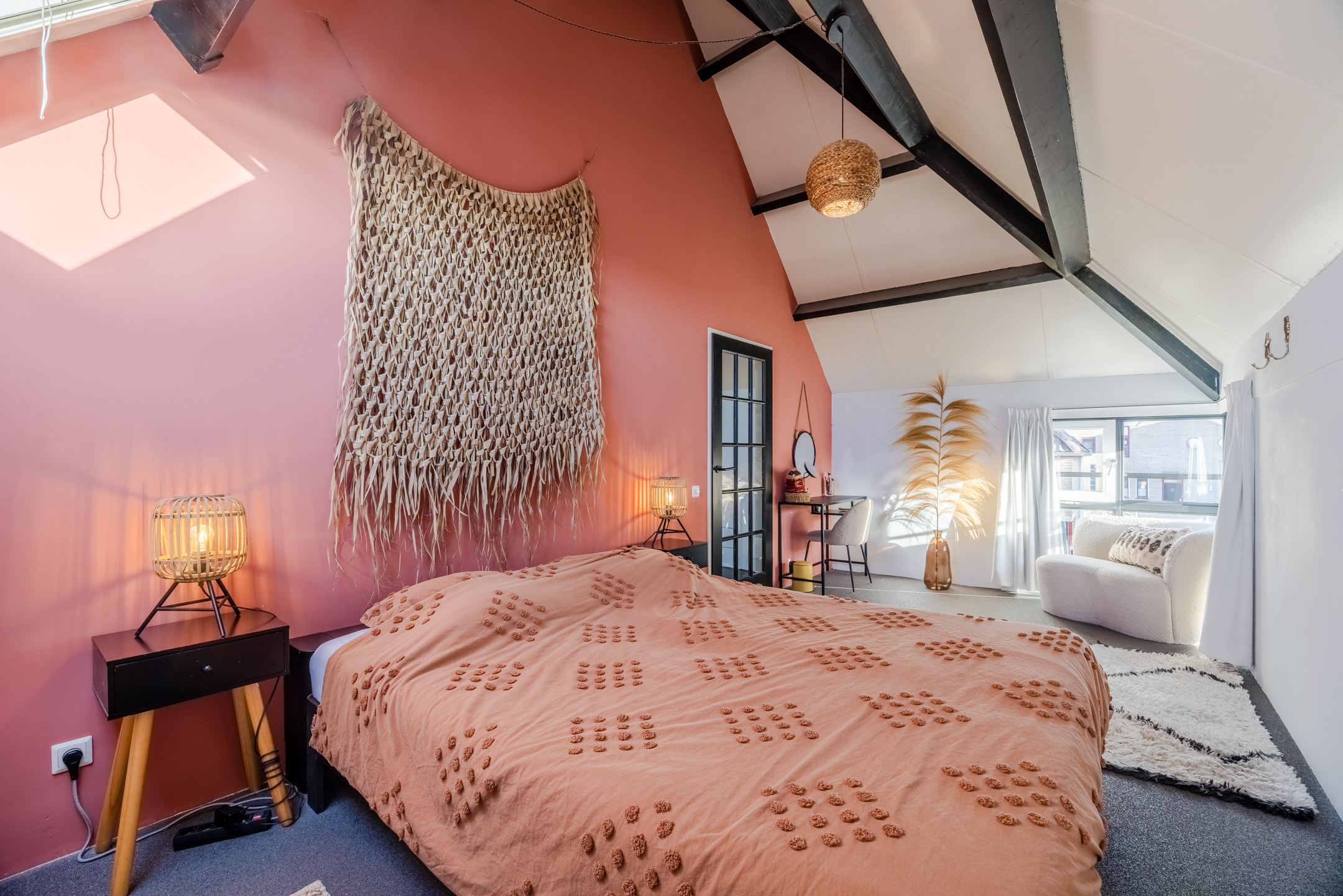 Deze verdieping heeft twee slaapkamers van resp. 16m² en 7m², een ruime overloop en een goed ingedeelde, moderne badkamer. De grootste slaapkamer (ca. 16m²) heeft een prachtig hoekraam en veel hoogte. De luxe badkamer heeft een hoekbad, separate douchecabine en dubbele wastafel. Ook is hier ruimte gecreëerd voor de wasmachine en droger. De overloop heeft een gangkast met opstelplaats van de CV-combiketel (ca. 2013) en biedt extra ruimte voor kasten of een werkruimte. Vanuit deze verdieping is de bergzolder bereikbaar. De overloop en de slaapkamers zijn voorzien van een 'korreltapijt' vloer.