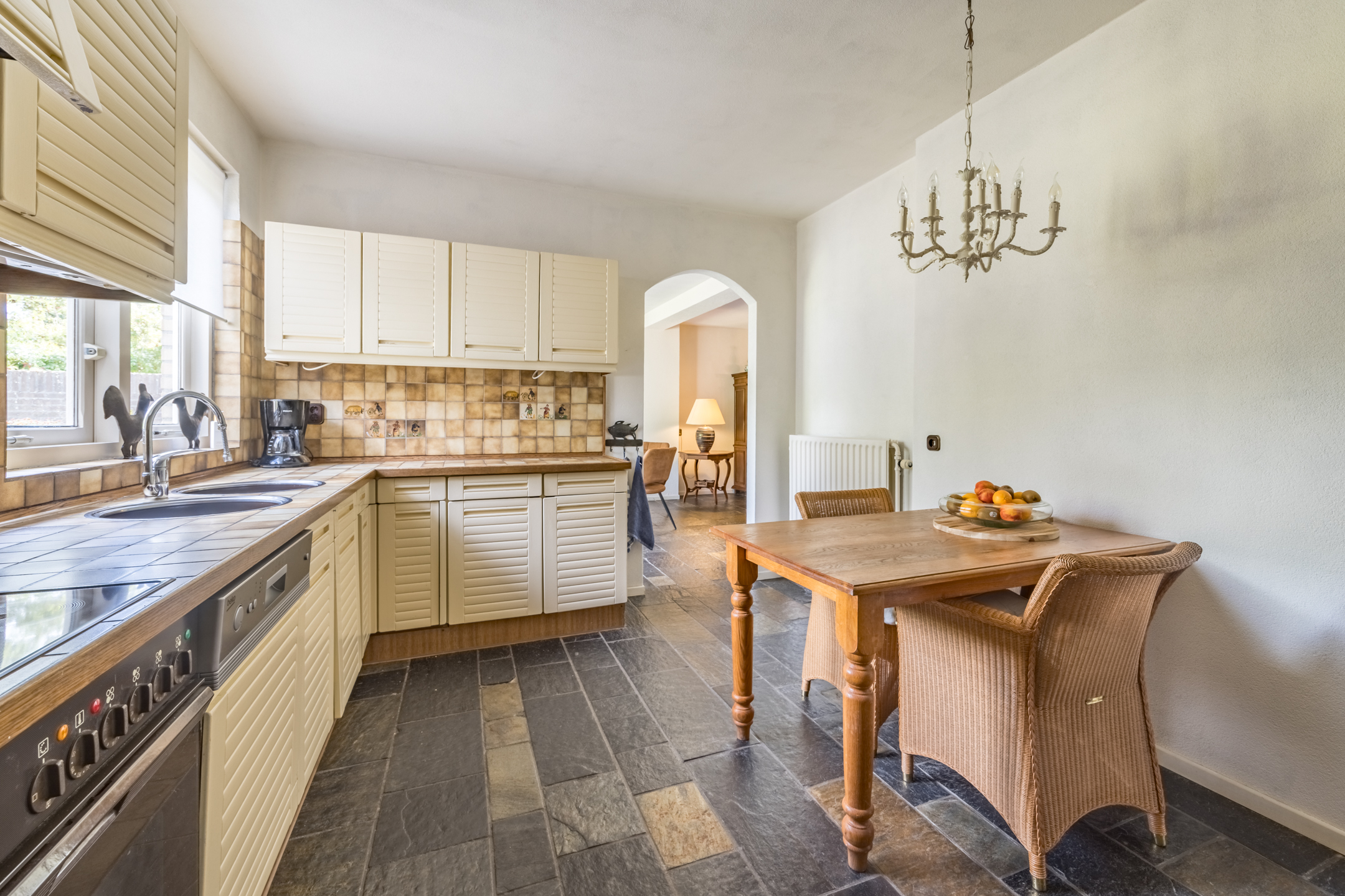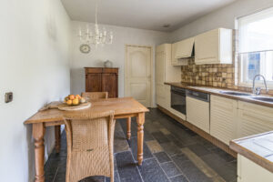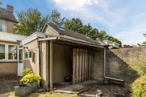 Vanuit de keuken is er toegang tot een praktische en ruime bijkeuken van circa 12m². In de bijkeuken bevindt zich een extra keukenblok, de aansluitingen voor de wasapparatuur en een deur naar de achtertuin.