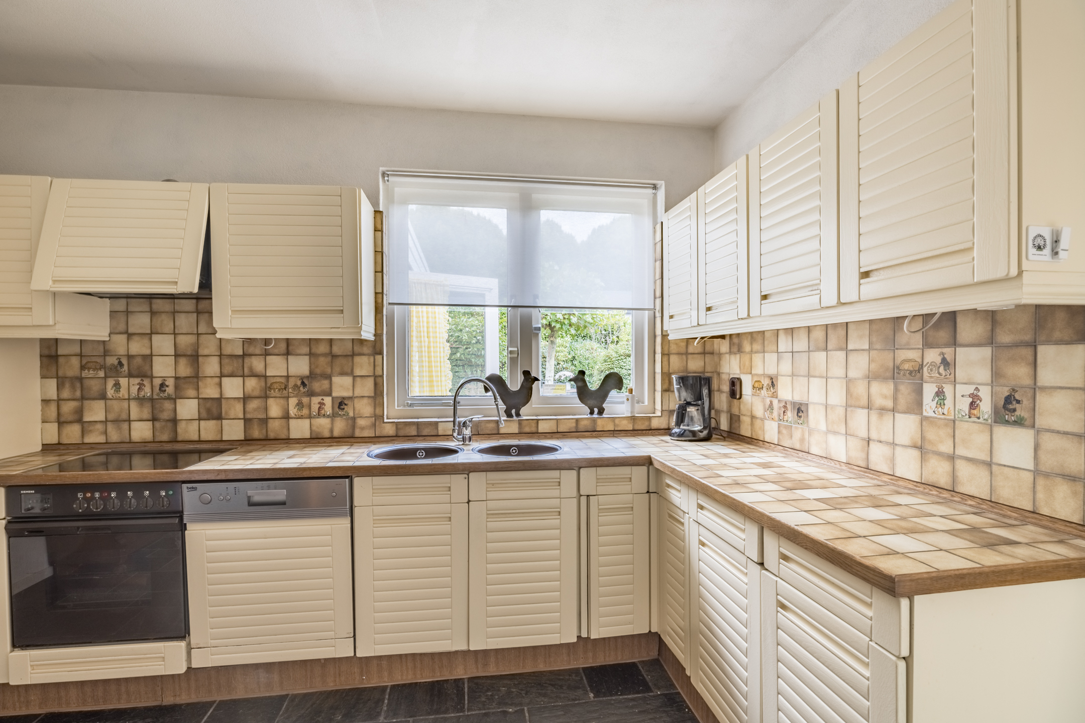 De woonkeuken circa 12m² met nette, doch eenvoudige keukeninrichting in hoekopstelling. De keukeninrichting is voorzien van een keramische kookplaat, afzuigkap, koelkast, oven en een vaatwasser.