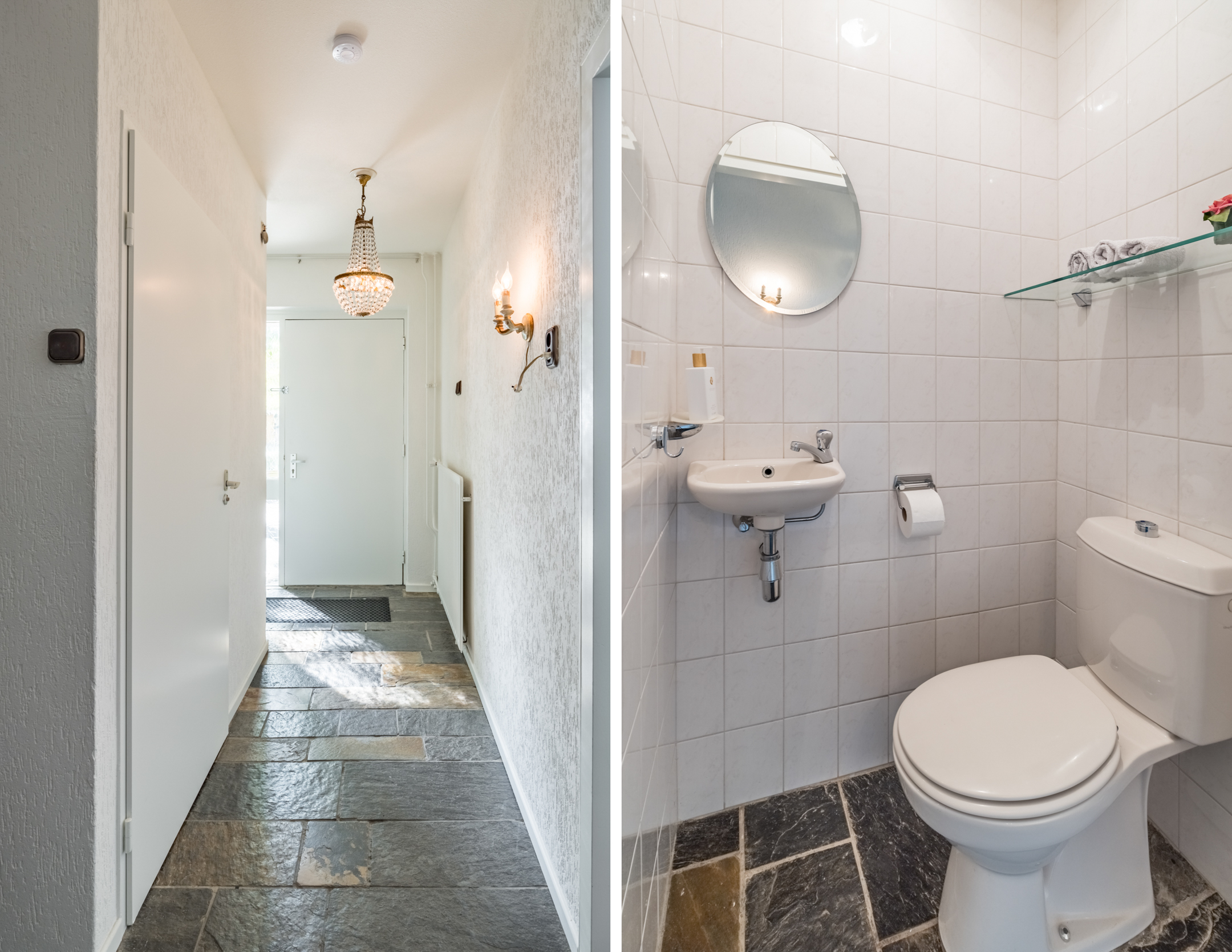 Entree, hal met leistenen vloer, uitgebreide meterkast en een licht betegeld toilet met fontein.