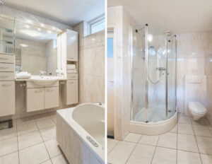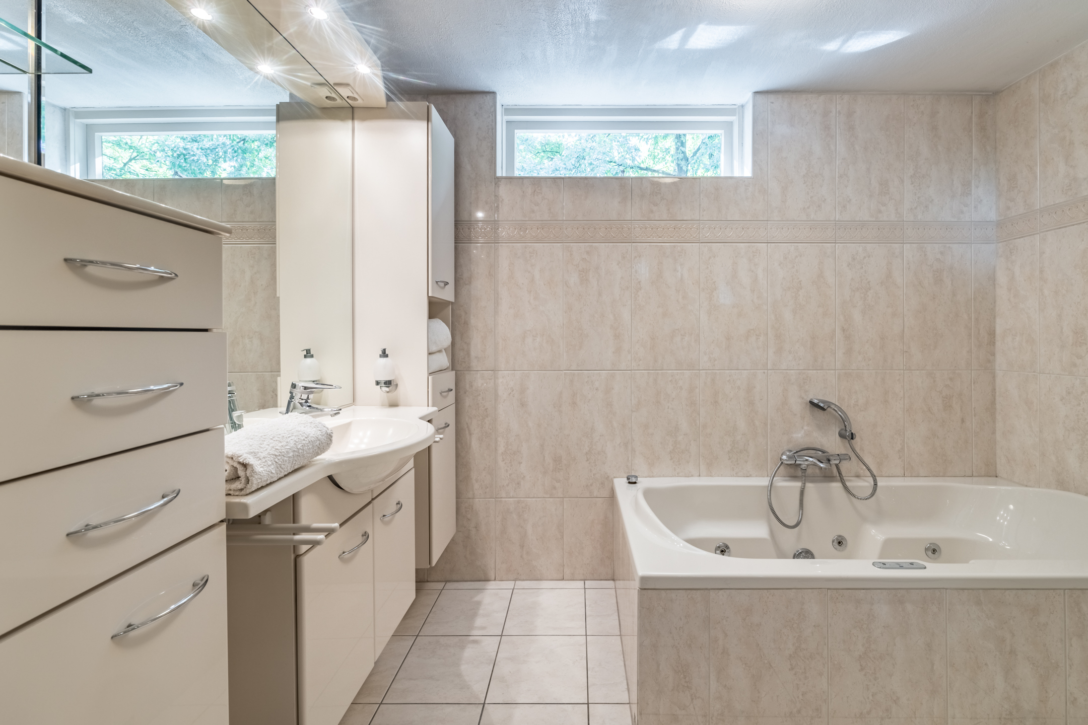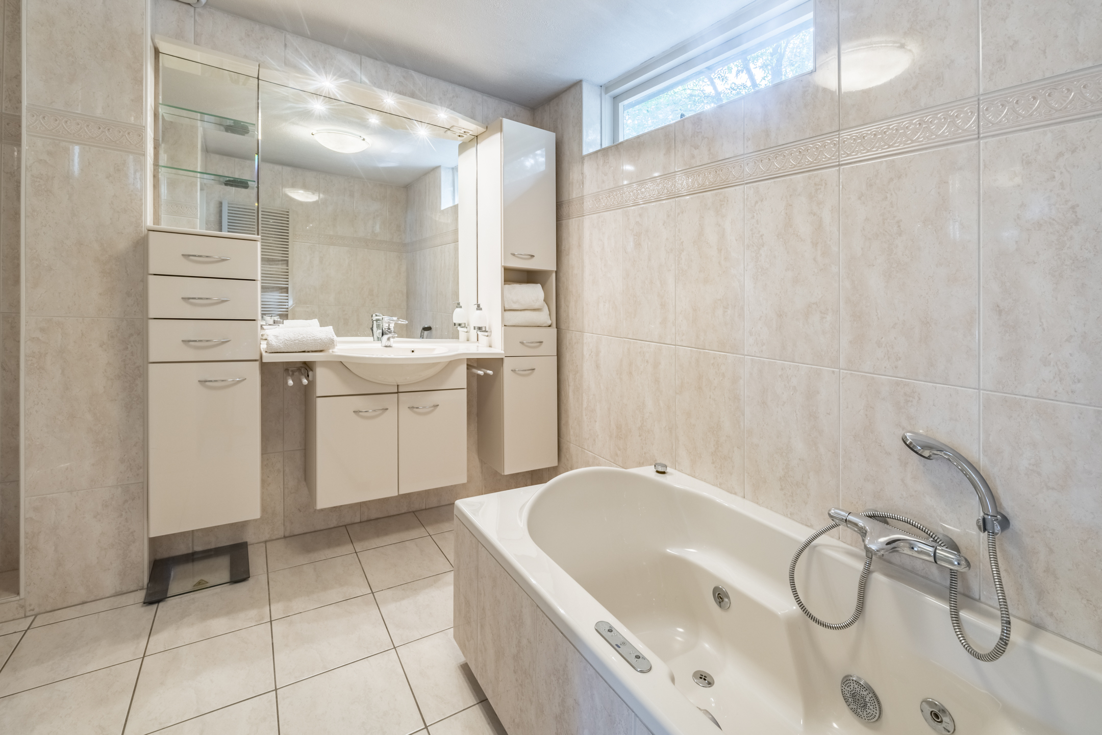 Geheel betegelde badkamer voorzien van een vaste wastafel met meubel, ligbad met whirlpool, aparte douche met thermostaat kraan, vrij hangend toilet en een design radiator.