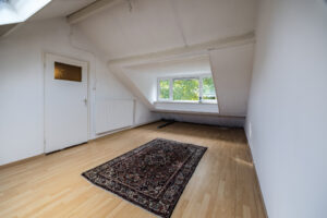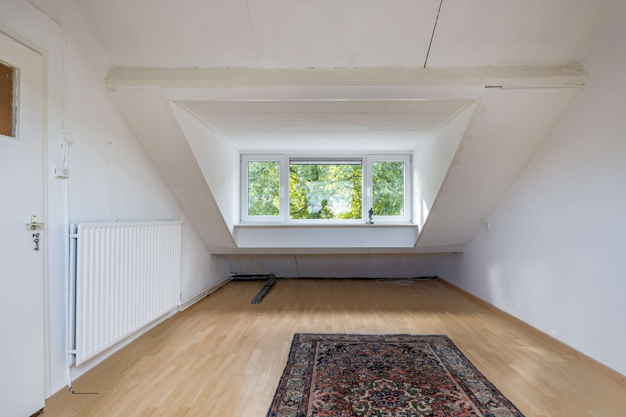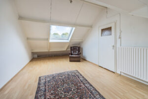 Zolderkamer circa 17m² met laminaatvloer, kunststof dakkapel (circa 2011) aan de voorzijde en een groot dakraam (circa 2022) aan de achterzijde.