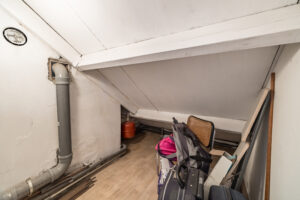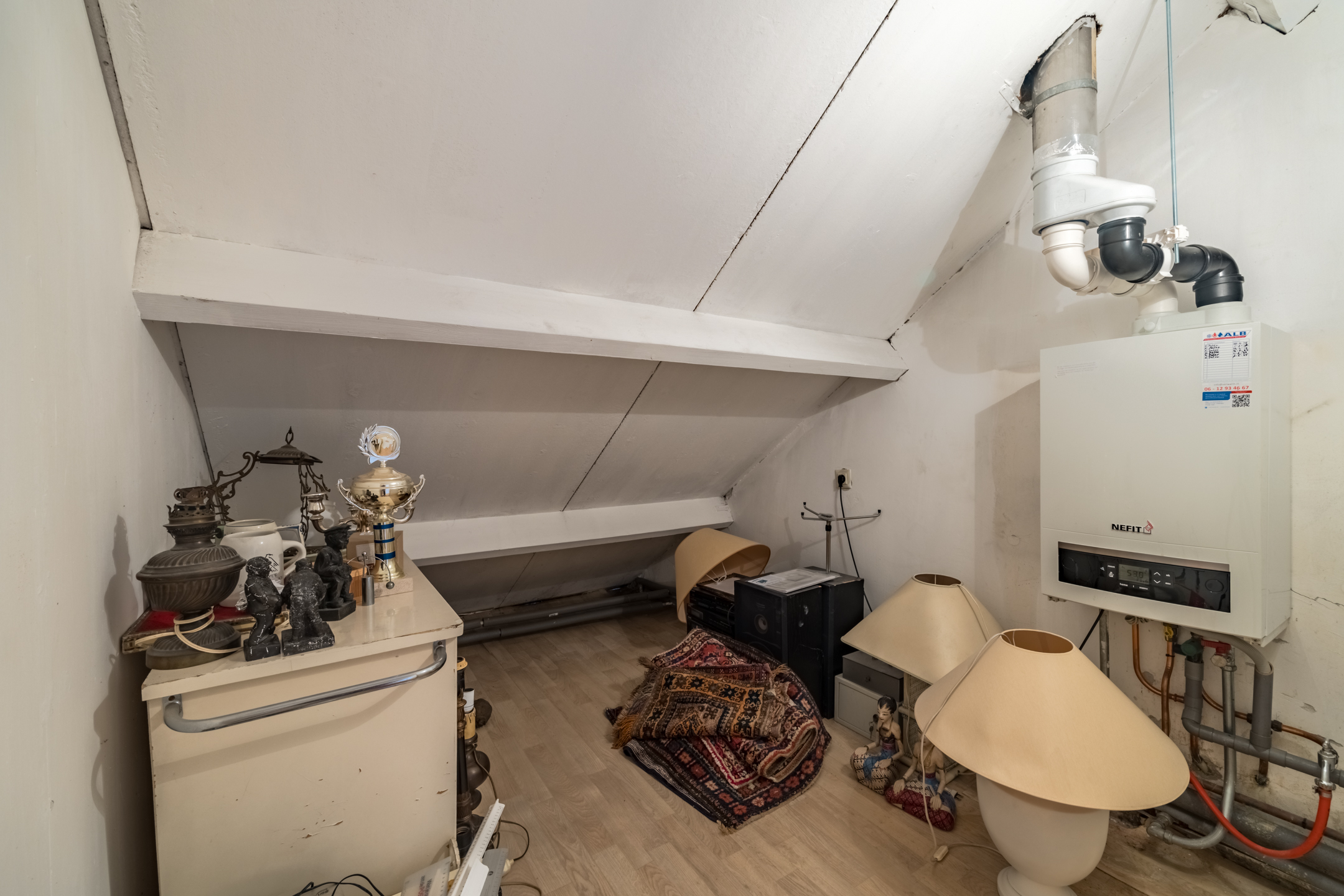 Voorzolder met laminaatvloer en twee vaste kasten. In een vaste kast bevindt zich de c.v. combi ketel en de andere kast biedt volop bergruimte.