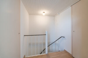 Overloop met laminaatvloer en die toegang geeft tot drie ruime slaapkamers en de badkamer.