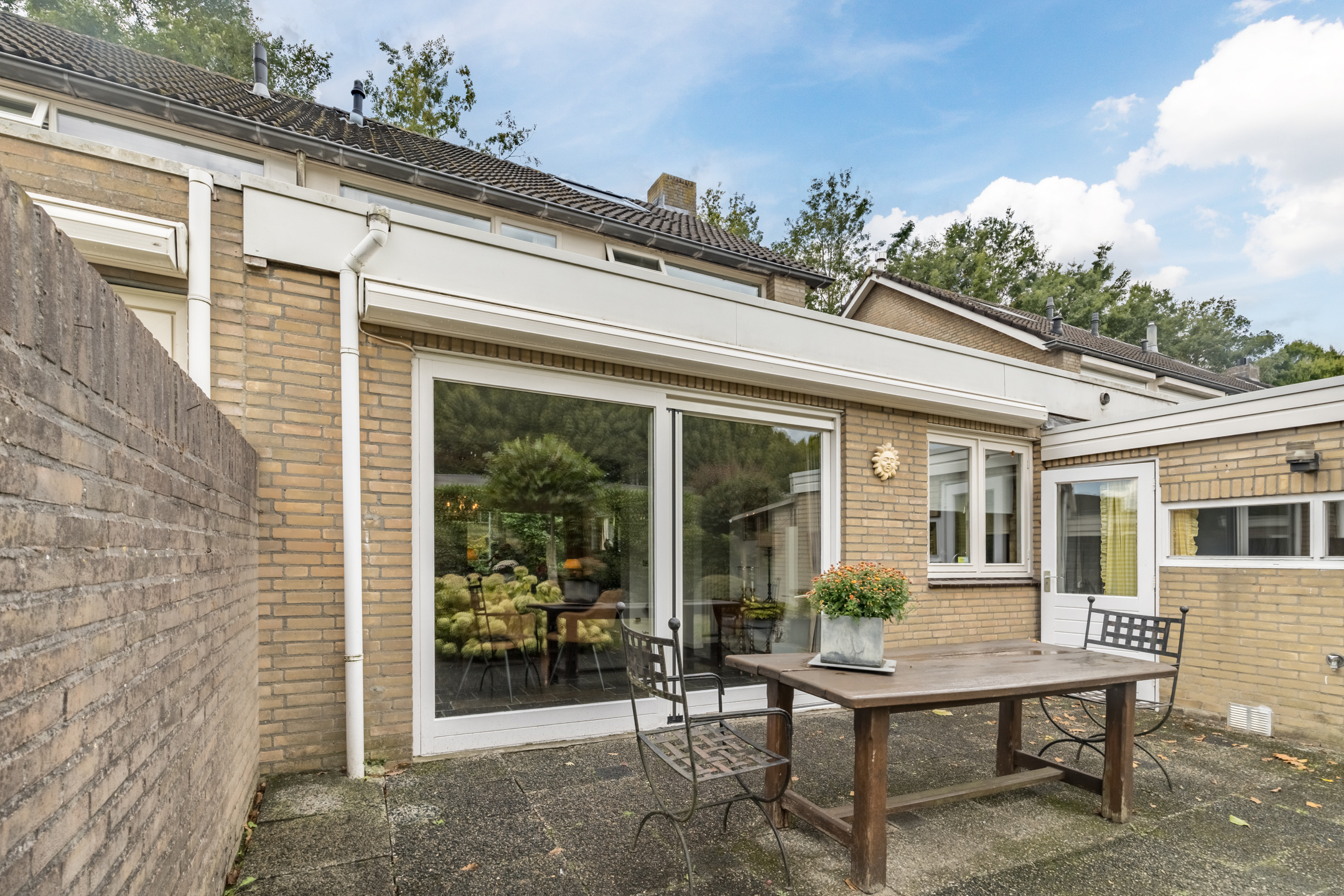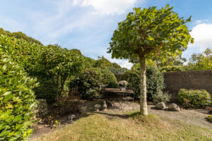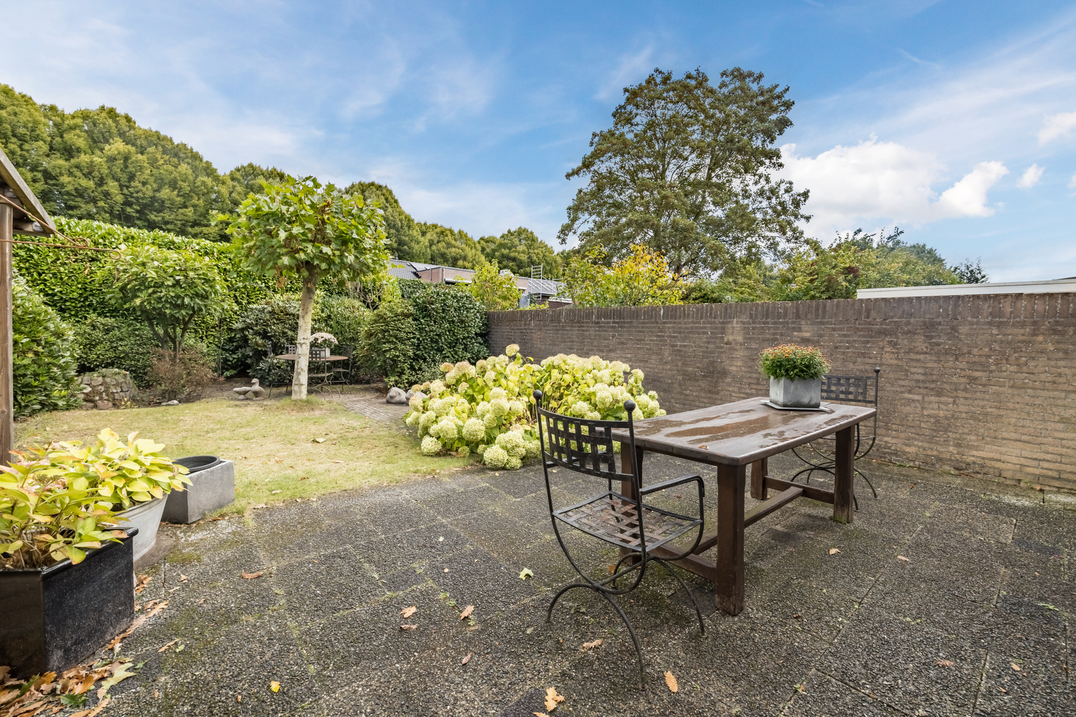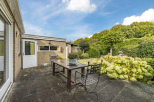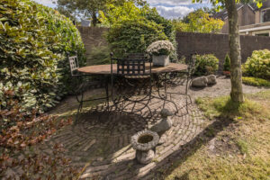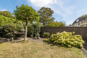 De ruime en groene achtertuin is op het noorden gelegen, maar biedt in de zomer volop zon. De privacy biedende tuin is voorzien van een groot terras, graspartij en diverse plantenborders.