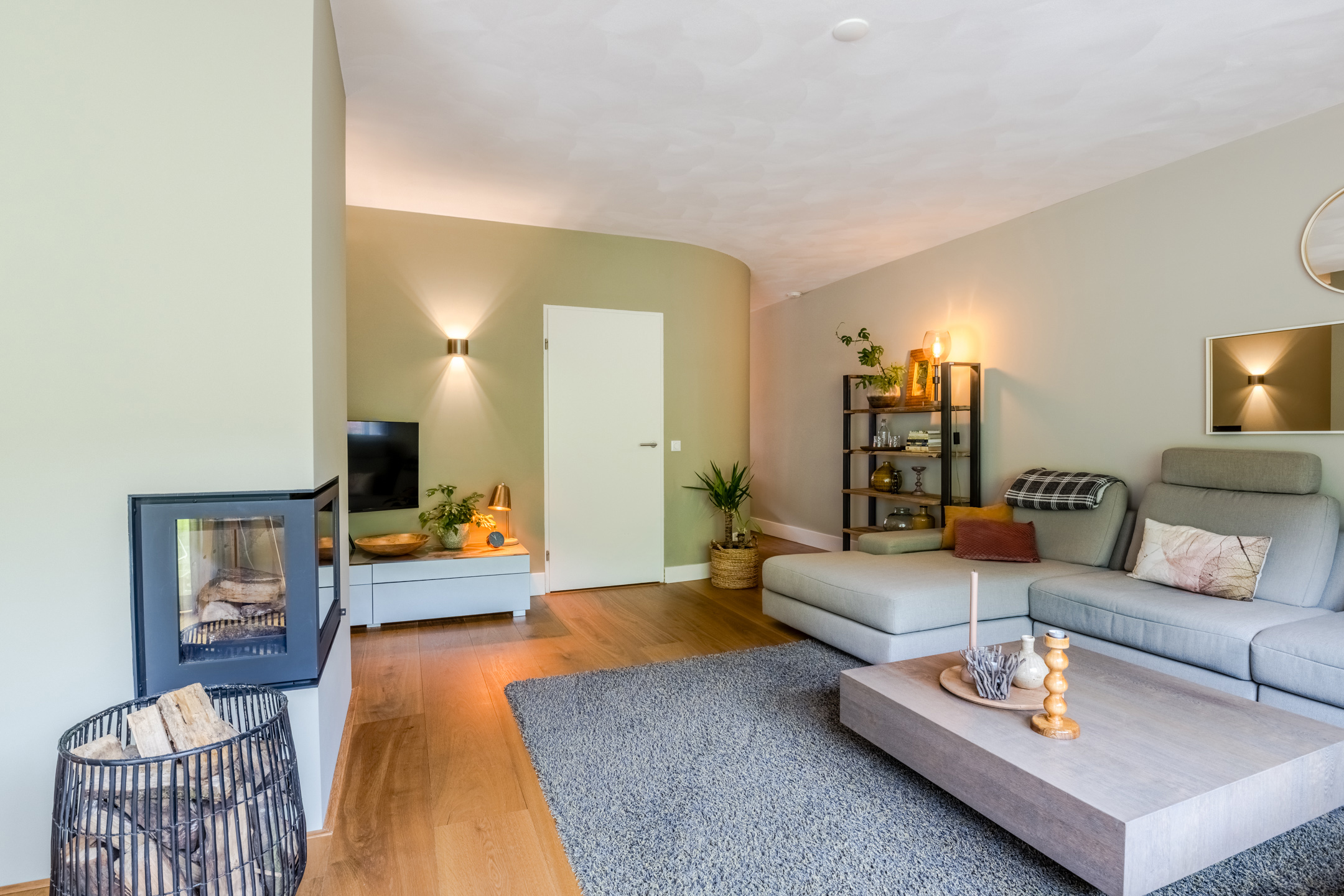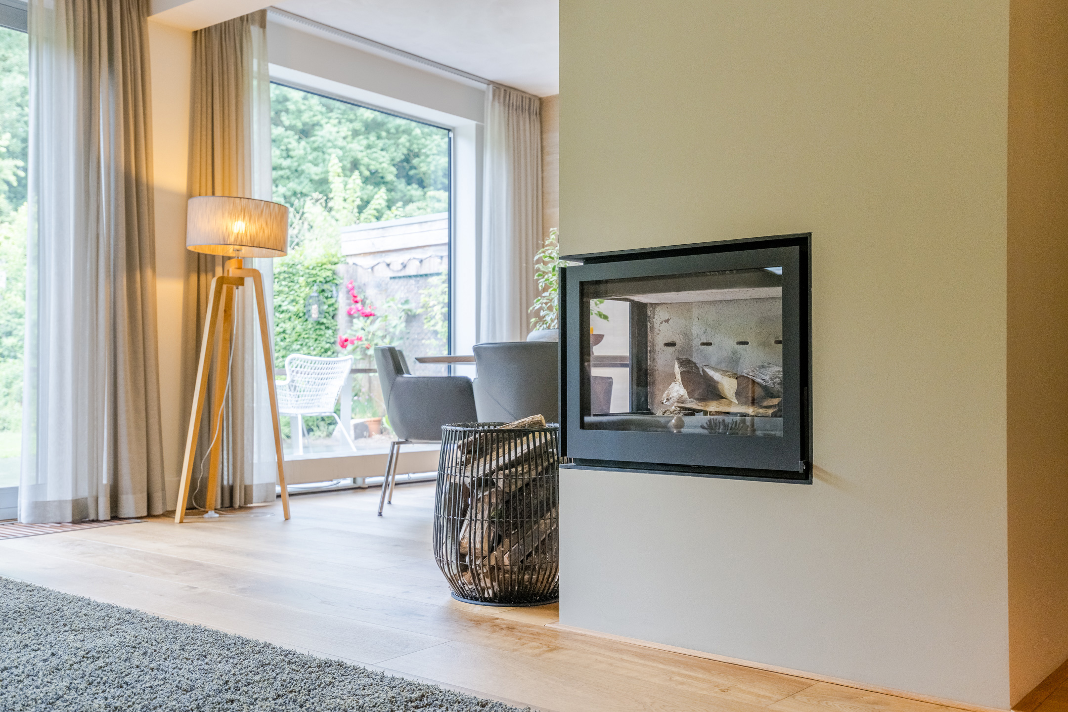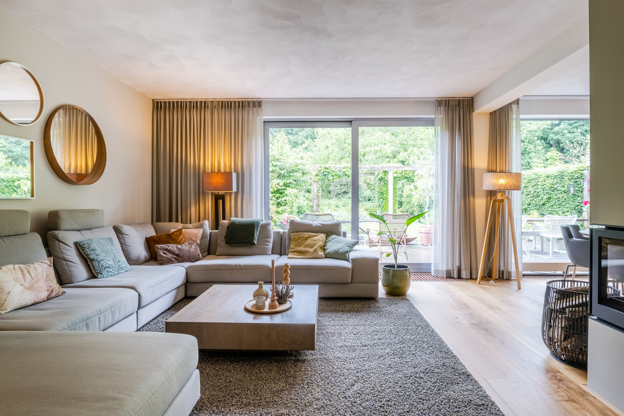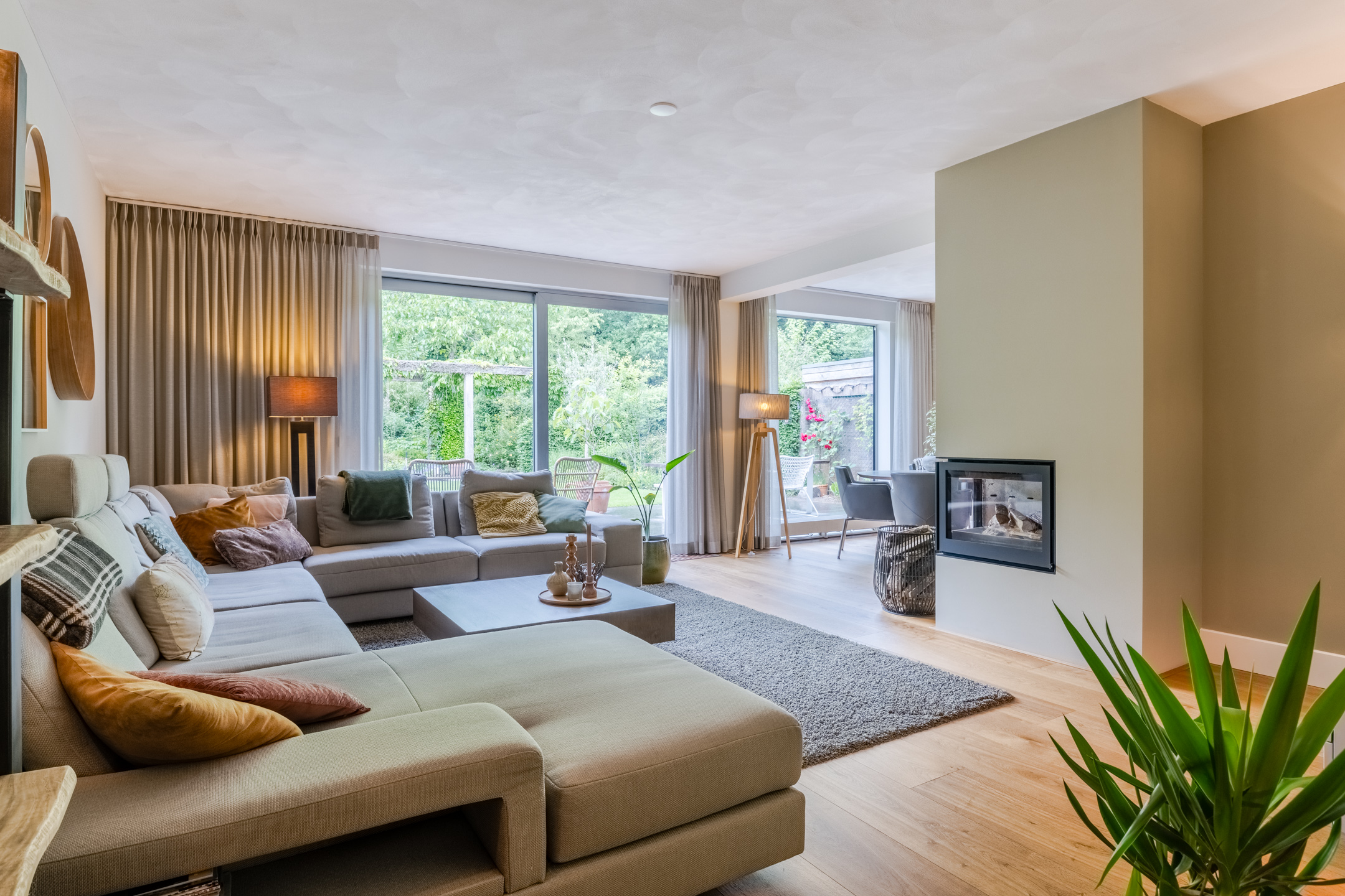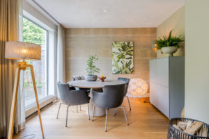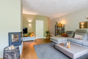 Sfeervolle en tuingerichte woonkamer circa 37m² (exclusief keuken) met eiken vloer, strak stucwerk wandafwerking, schuurwerk plafondafwerking, gezellige houtkachel (Barbas, september 2022) en een schuifpui naar de achtertuin. De vele glaspartijen bieden daarnaast een fraai zicht op de achtertuin.