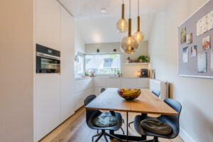 Aan de voorzijde van de woning gelegen woonkeuken circa 11m². In de keuken is een hoog, schuin aflopend plafond aanwezig wat een ruimtelijk gevoel geeft.