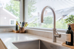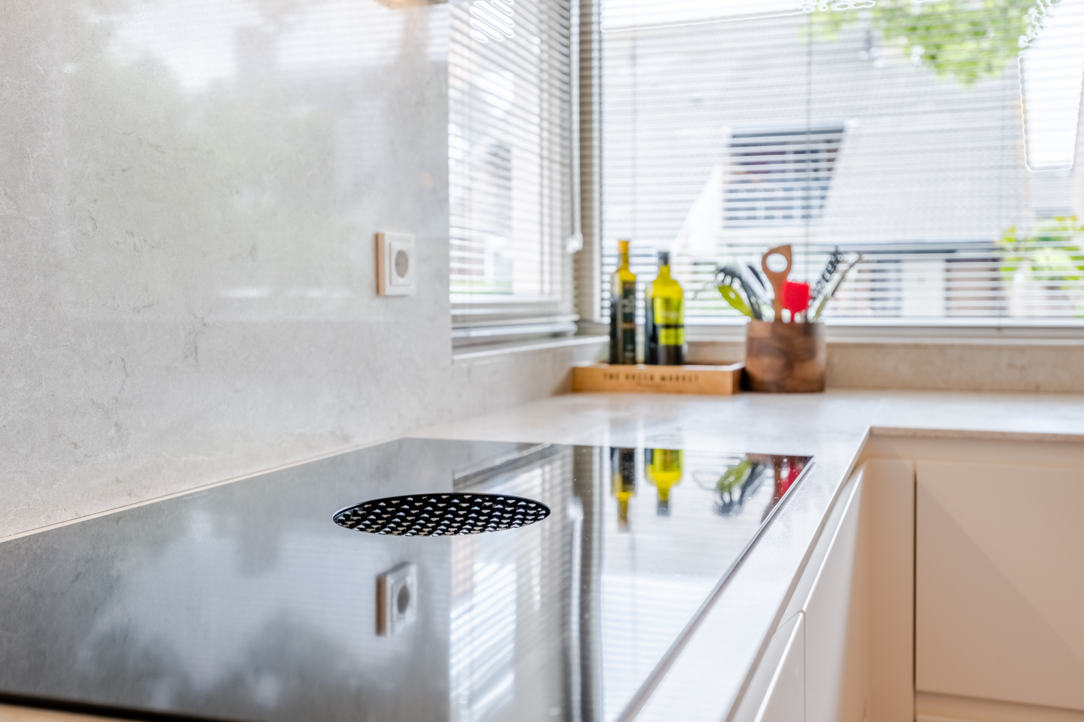 De moderne en luxe keukeninrichting (Frako, 2021) in hoekopstelling is voorzien van een quooker, Bora inductie kookplaat met geïntegreerde afzuiging, grote koelkast (Liebherr), stoomoven (Miele) en een vaatwasser (Atag). In de keuken zijn veel praktische lades aanwezig.