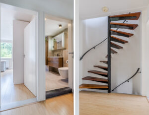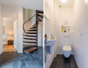 Entree, hal met tegelvloer, speelse ronding in de muur, vernieuwde en uitgebreide meterkast en een moderne toiletruimte.