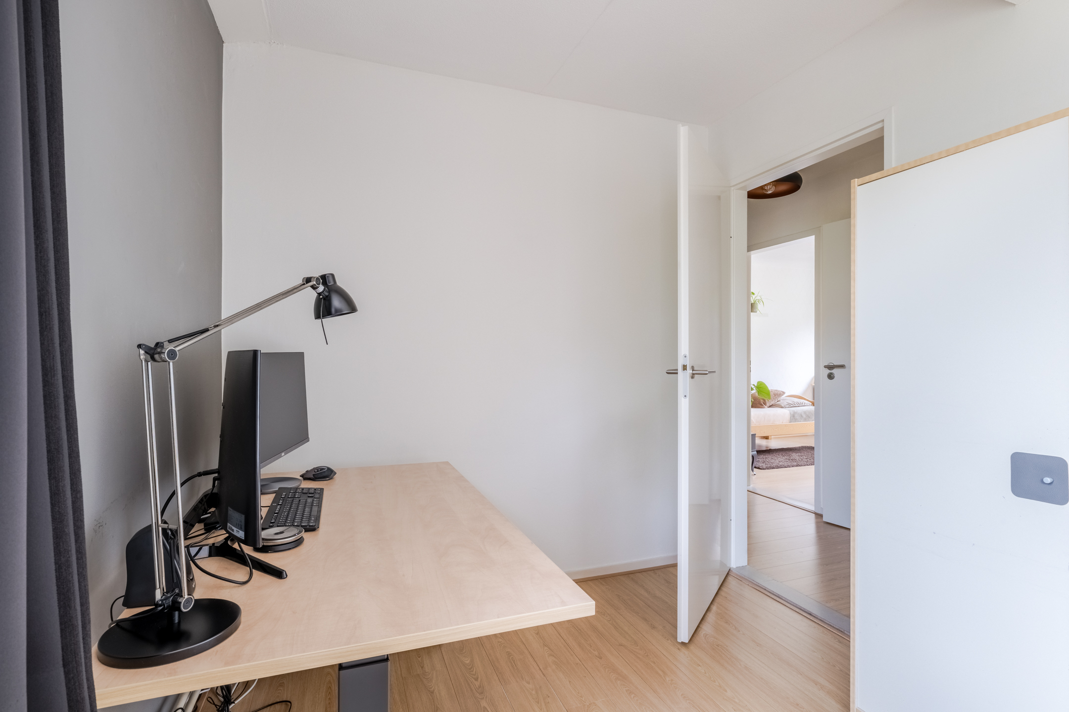 Overloop met laminaatvloer en die toegang geeft tot vier slaapkamers en de badkamer.