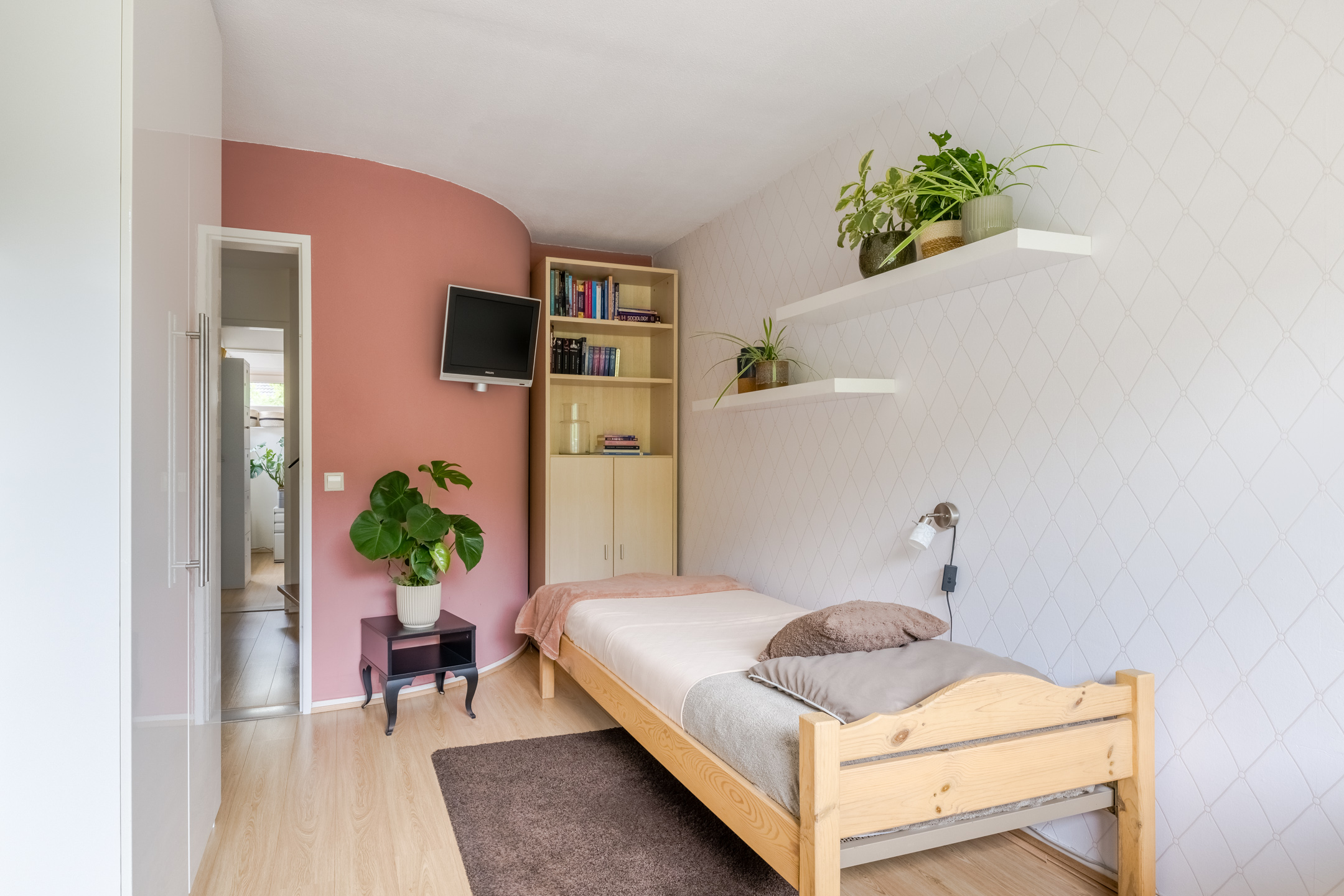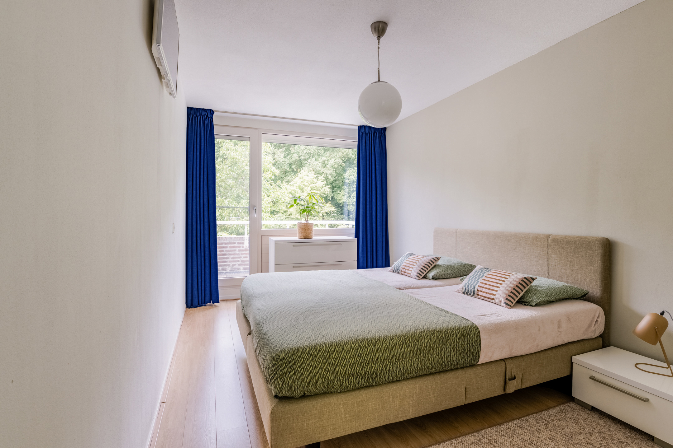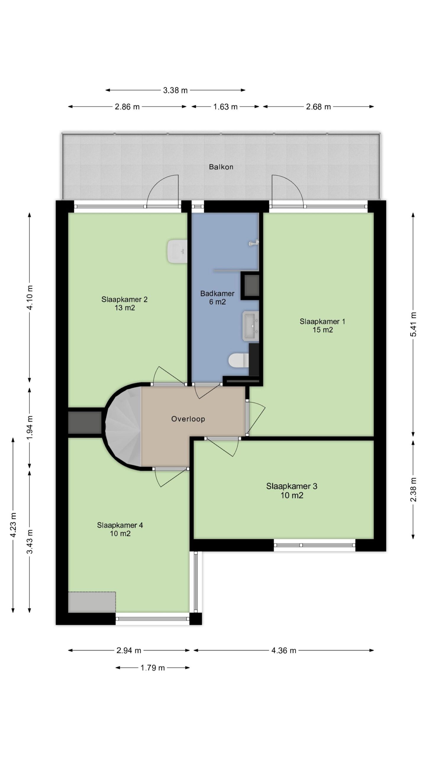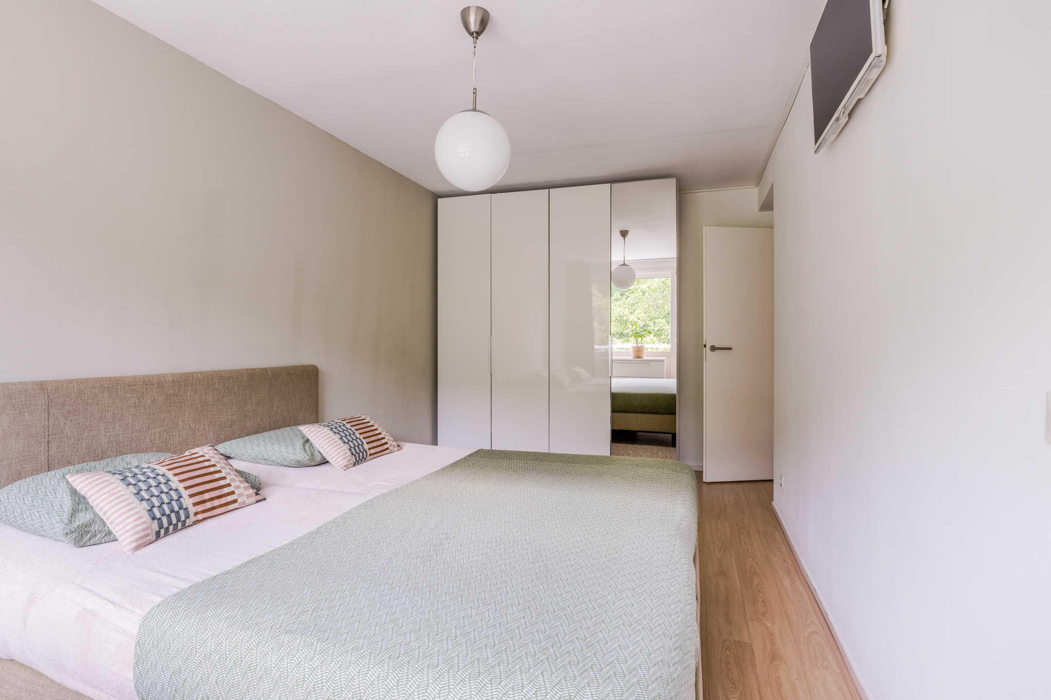 Voorslaapkamer circa 10m² met speelse ronding in de muur, voorslaapkamer circa 10m² met zonneluifel, achterslaapkamer circa 15m² met rolluik en toegang tot het balkon en een achterslaapkamer circa 13m² met speelse ronding in de muur, vaste wastafel en toegang tot het balkon. Alle slaapkamers zijn voorzien van een laminaatvloer en stucwerk wandafwerking.