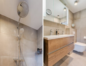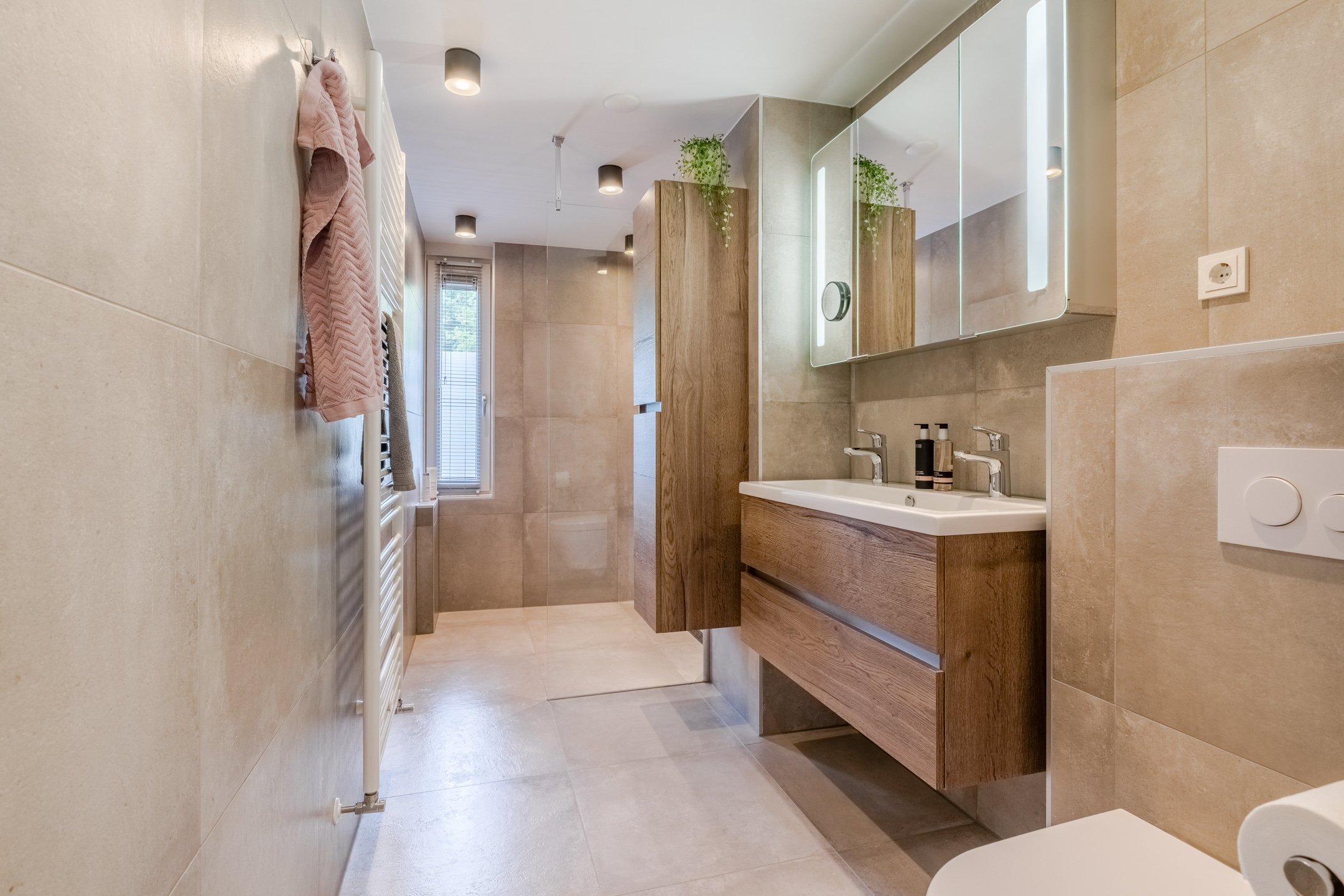 Luxe en moderne badkamer (2019) voorzien van een dubbele vaste wastafel met meubel en een spiegelkast, grote inloopdouche met regendouche en thermostaat kraan, vrij hangend toilet en een design radiator. De badkamer is daarnaast voorzien van stucwerk plafondafwerking.