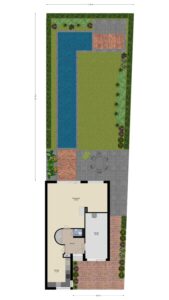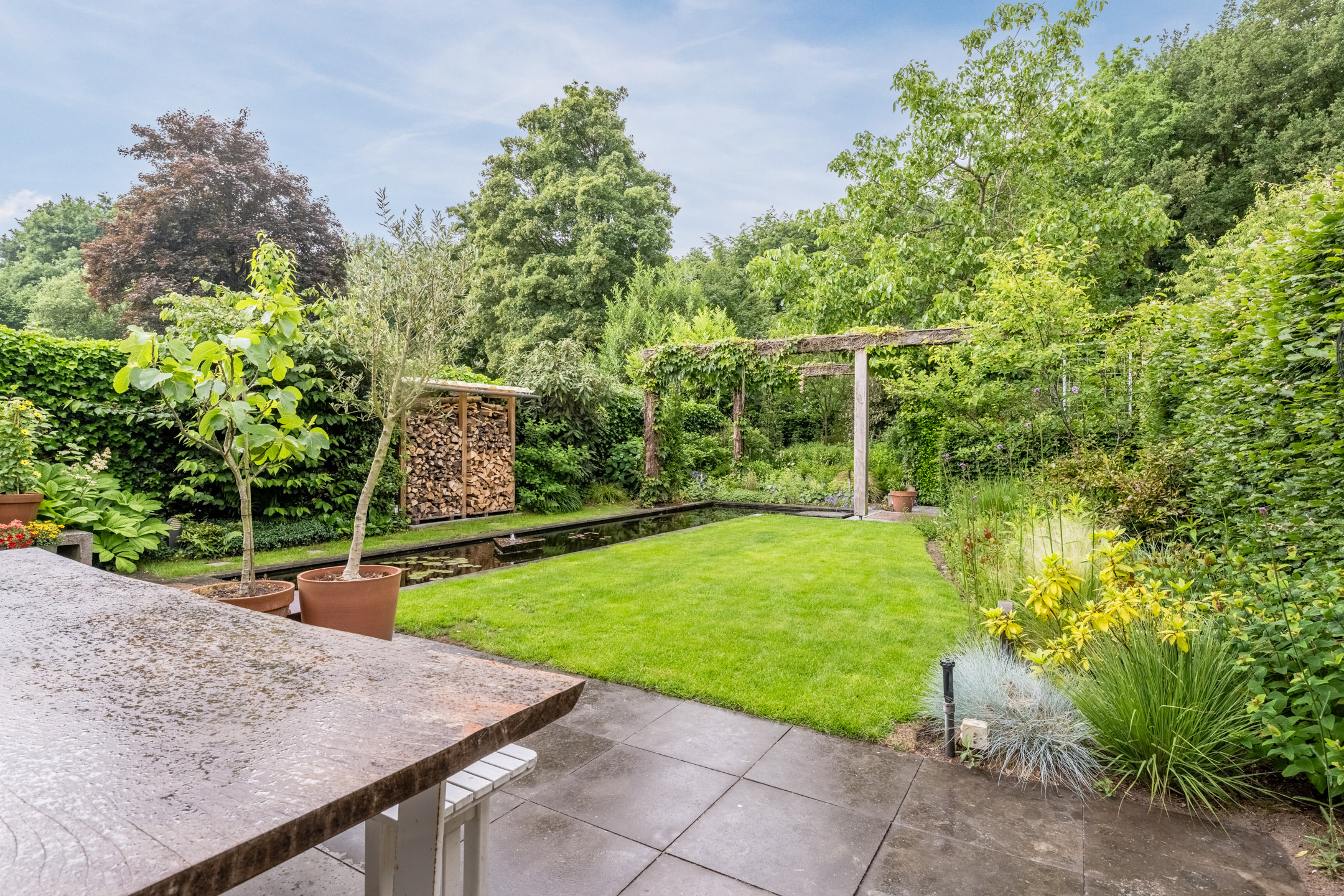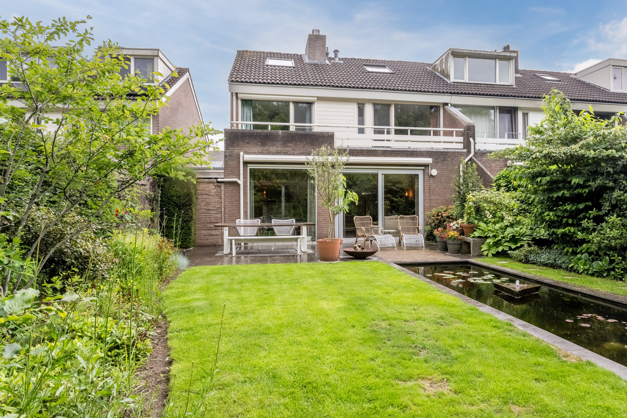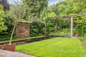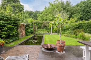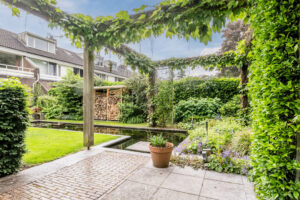 Diepe, fraai aangelegde en vrij gelegen achtertuin op het zonnige westen. De achtertuin is voorzien van een groot terras, graspartij, diverse borders, vijverpartij, overkapping voor houtopslag en een achterom. Door de vrije ligging biedt de tuin volop privacy.