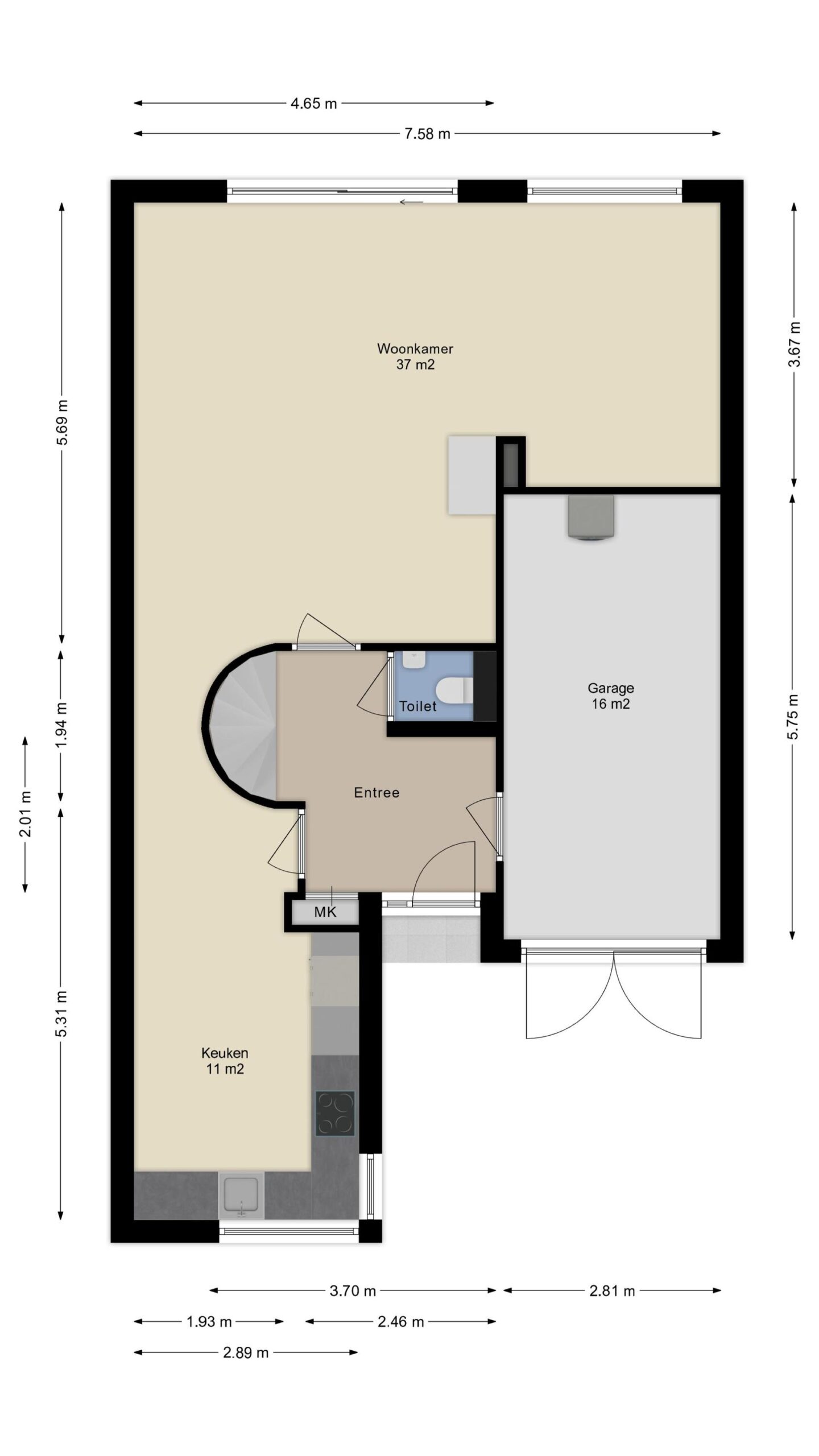 Inpandig bereikbare garage circa 16m² met twee openslaande deuren naar de oprit en de aansluitingen voor de wasapparatuur.
