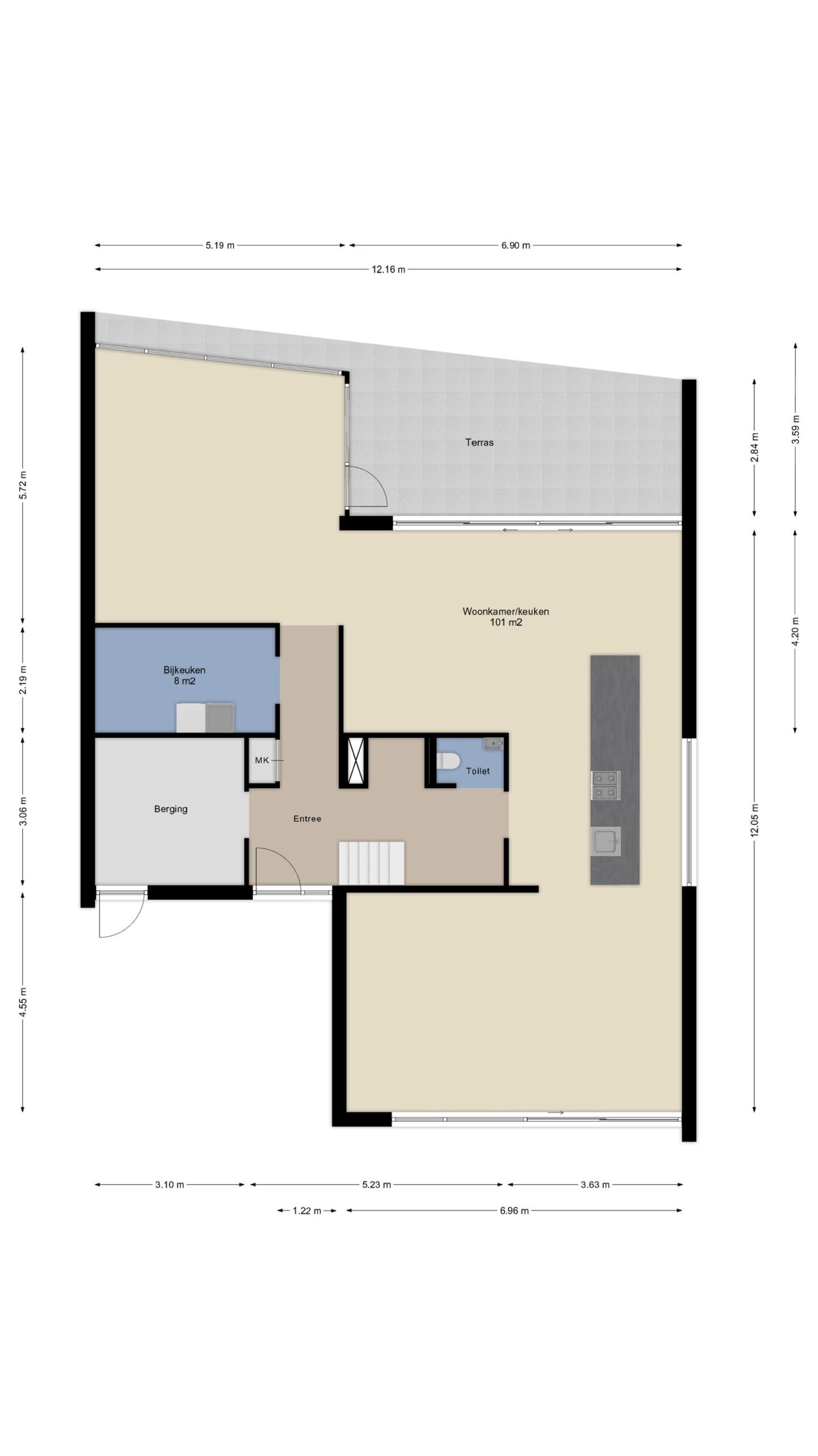 Entree, hal met de meterkast, inpandig bereikbare berging (voor onder andere de fietsen)/ technische ruimte, toiletruimte en de garderobe hoek. Er bevindt zich tevens een praktische bijkeuken met de aansluitingen voor de wasapparatuur en extra berging-/ provisieruimte en de trapopgang naar de eerste verdieping.
