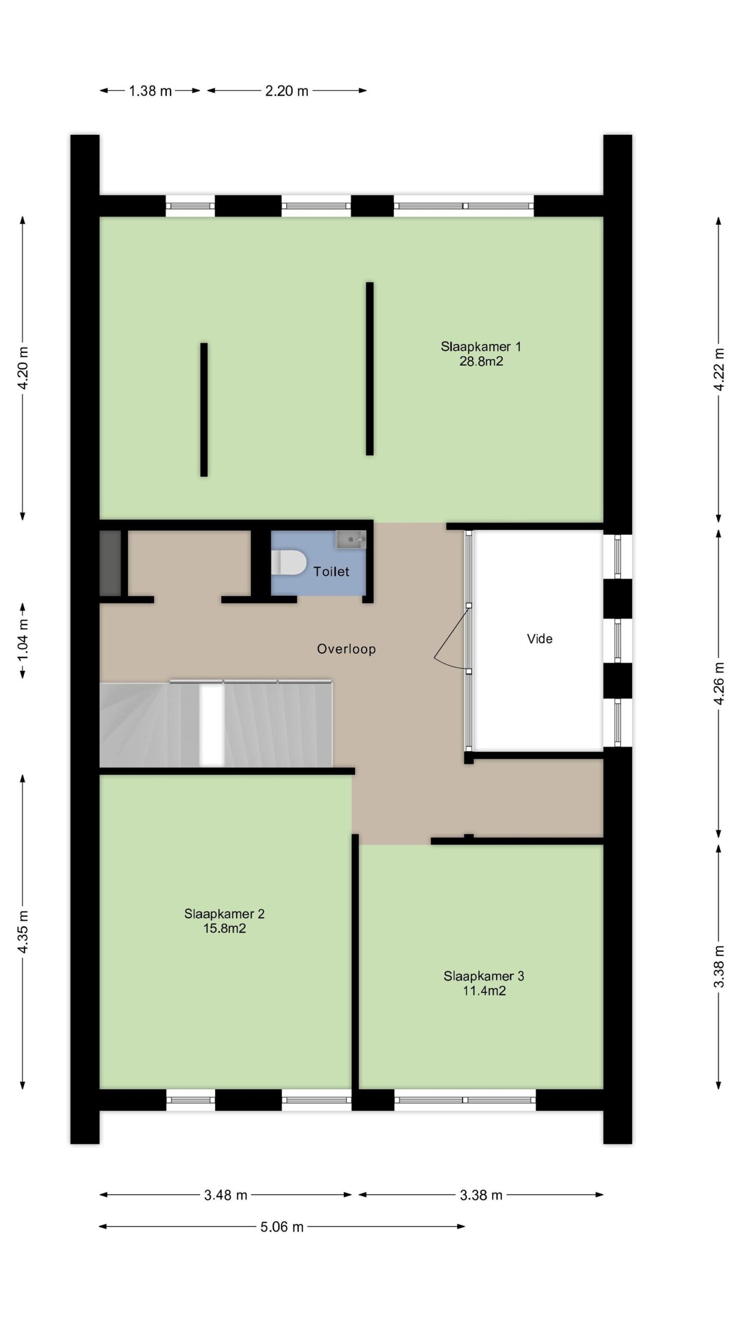 Ruime overloop met separate toiletruimte, fraaie vide en die toegang geeft tot drie slaapkamers.