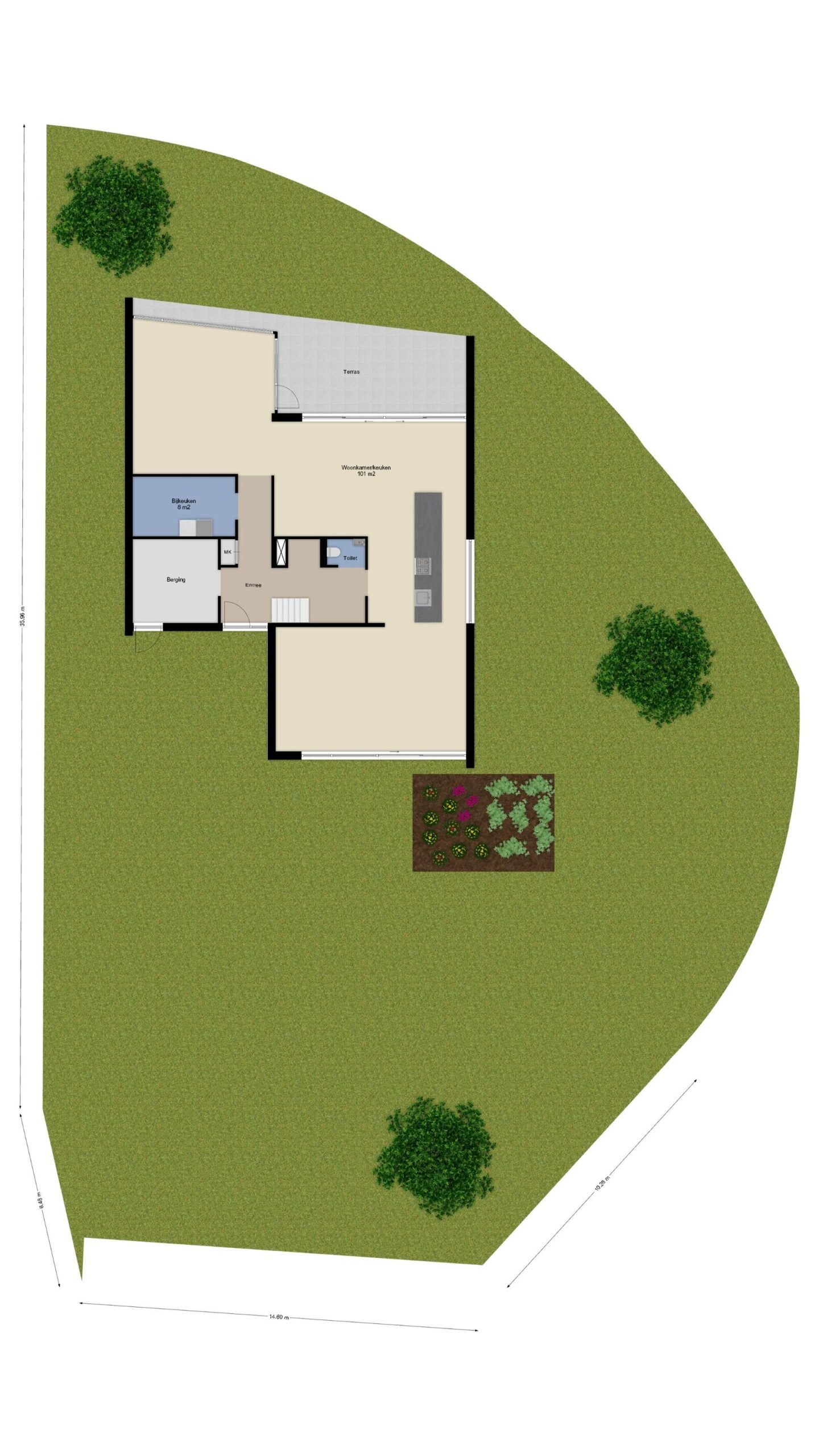 - Grenzend aan de privé tuin is er een aandeel in de aangrenzende collectieve natuurtuin/ vloedtuin met daarin een eigen vlonderterras.