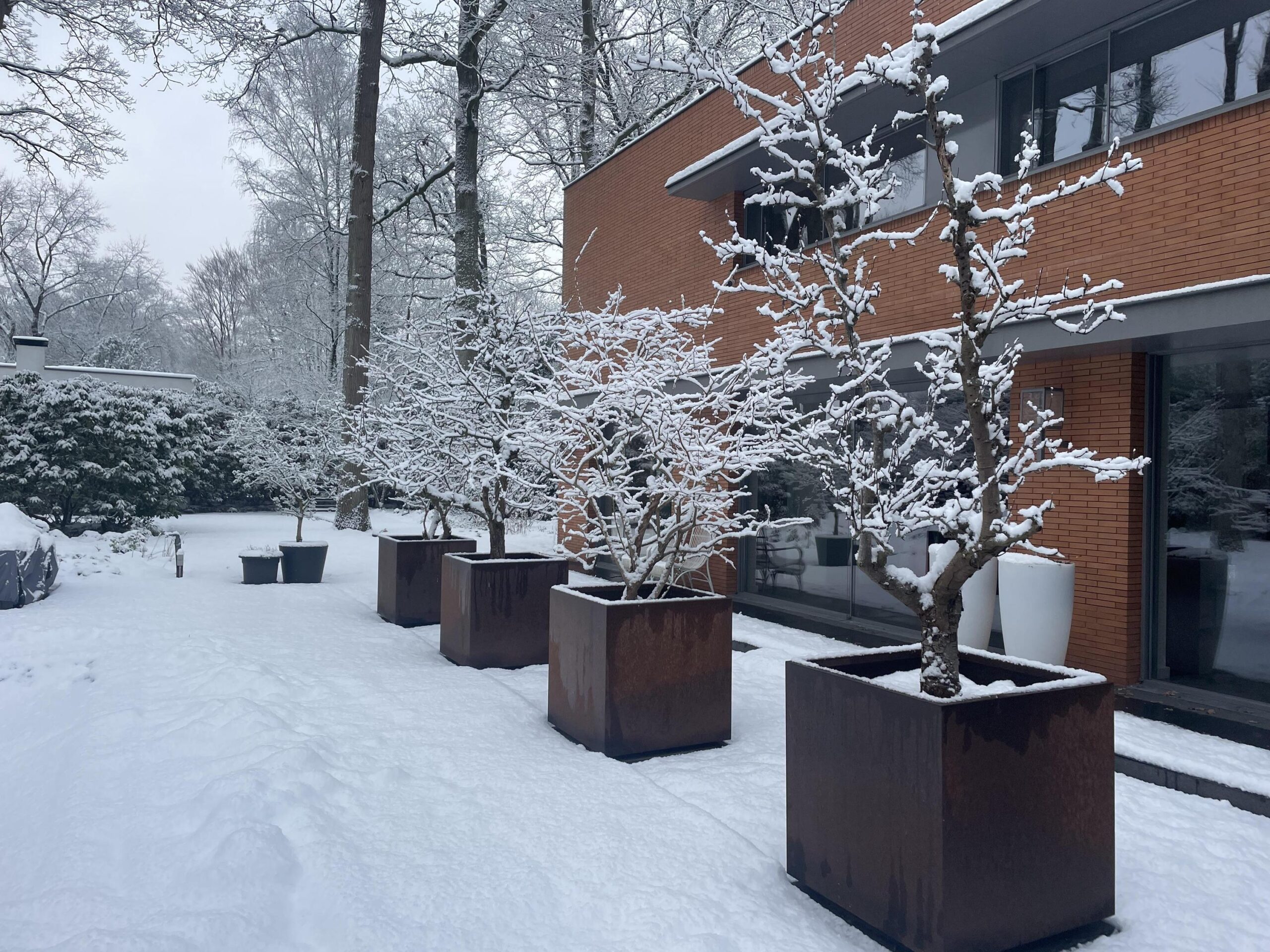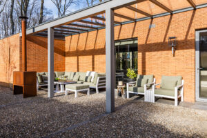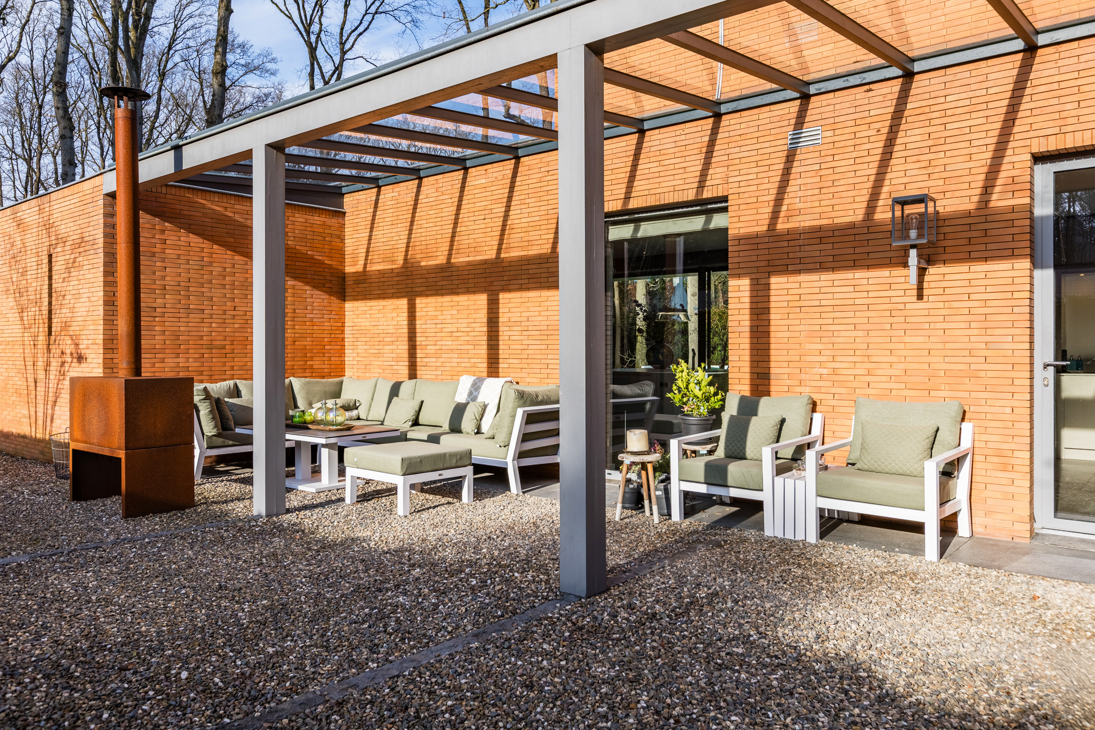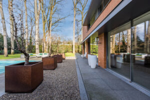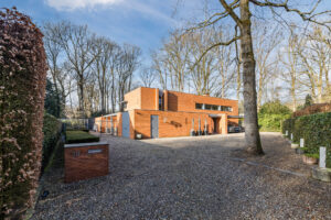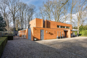 De oranje strengperssteen met een minimale voeg, fijne aluminium kozijnen met overwegend glas (minimal windows) die een panoramisch zicht geven, strakke en moderne lijnen, harmonische verhoudingen met prettige ruimtes maken deze villa tot een unieke en moderne villa die perfect past in zijn bosrijke omgeving.