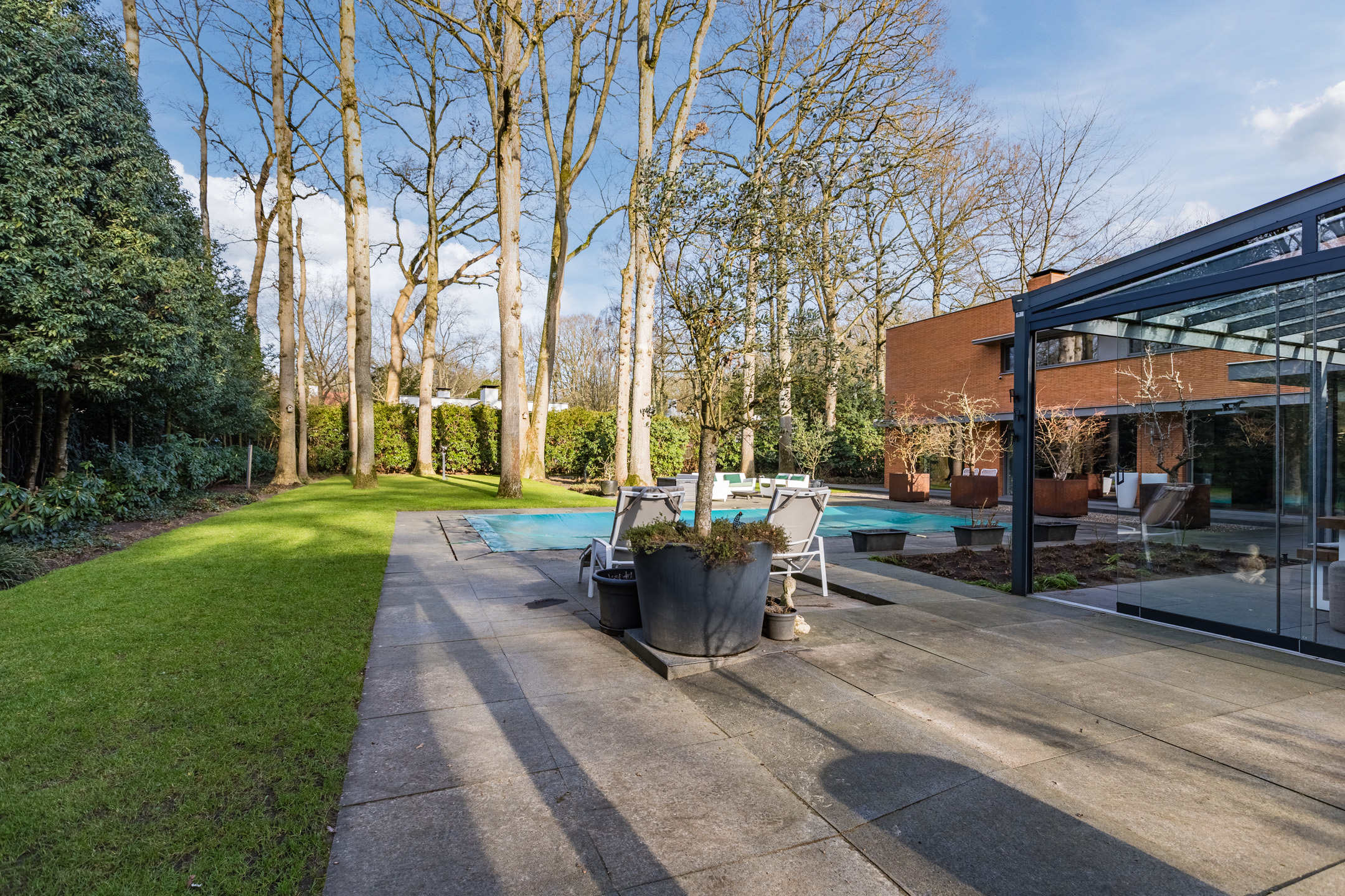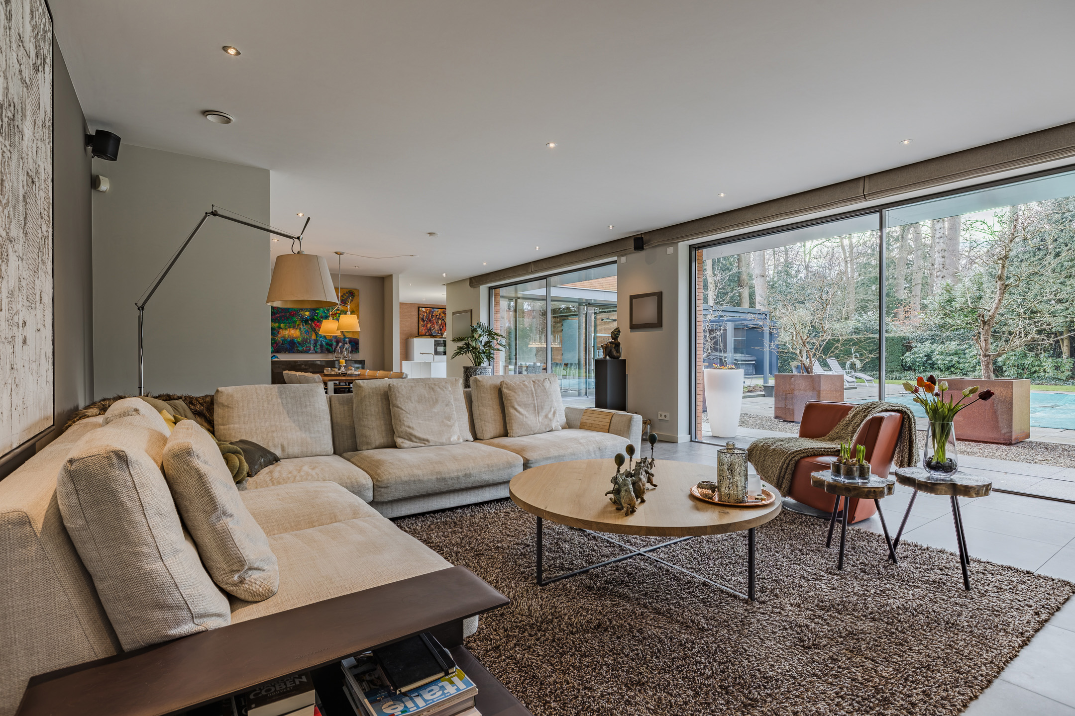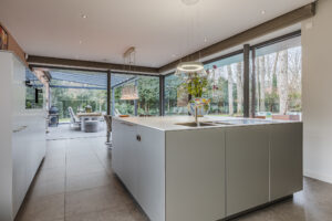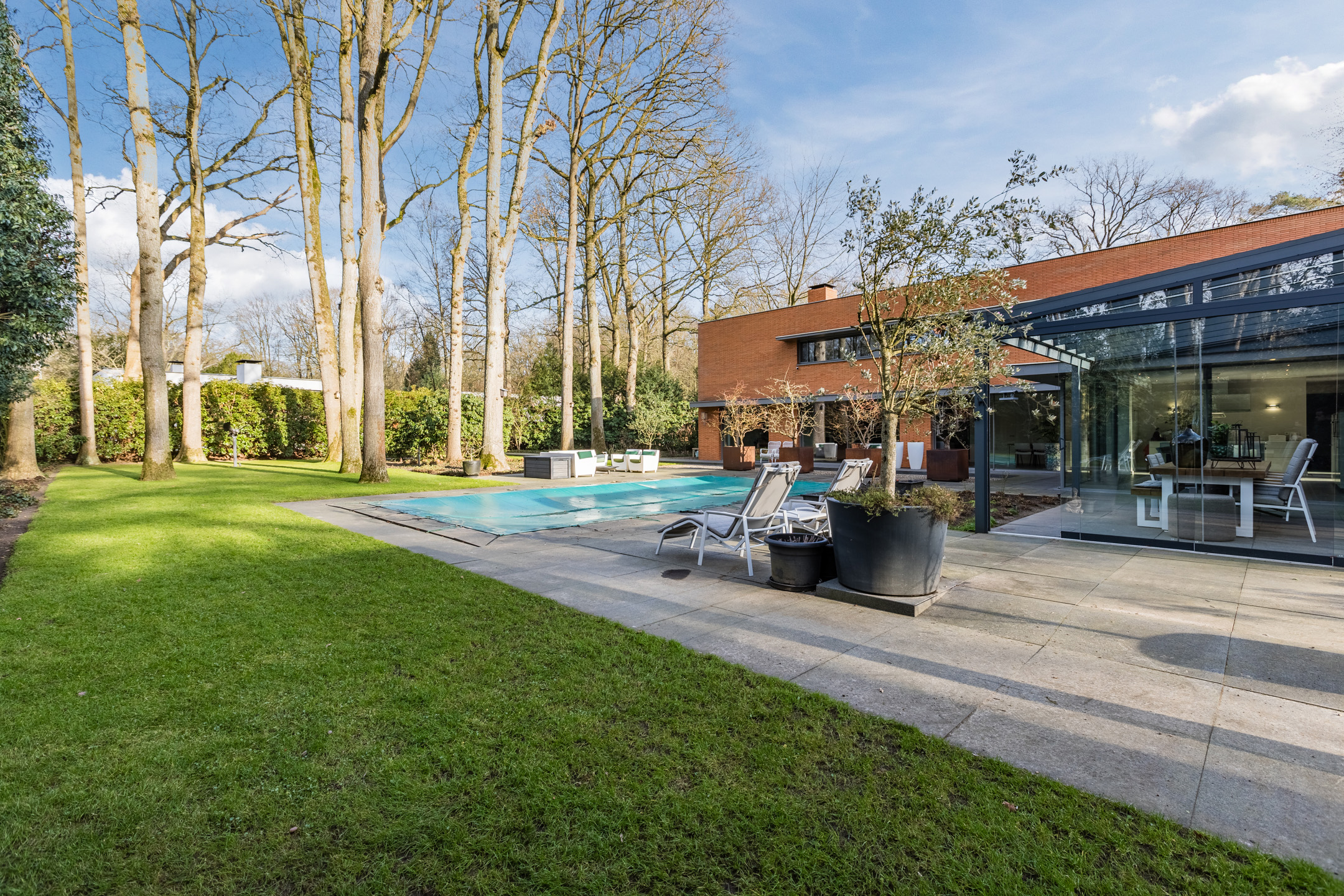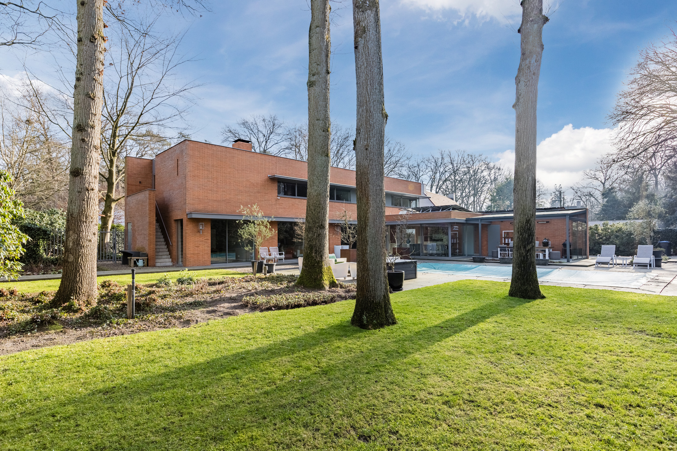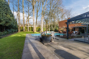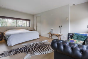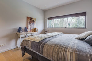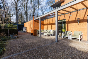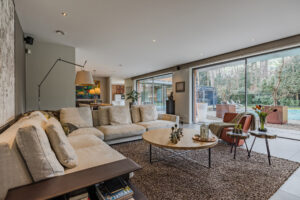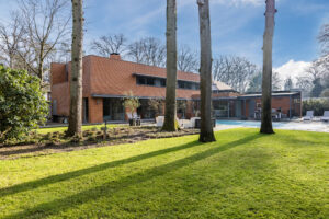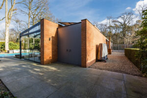 Achter de enigszins gesloten voorgevel schuilt een bijzondere villa die aan de achterzijde uit veel glaspartijen bestaat, waardoor de leefruimtes en slaapkamers overgaan in de tuin en bos.