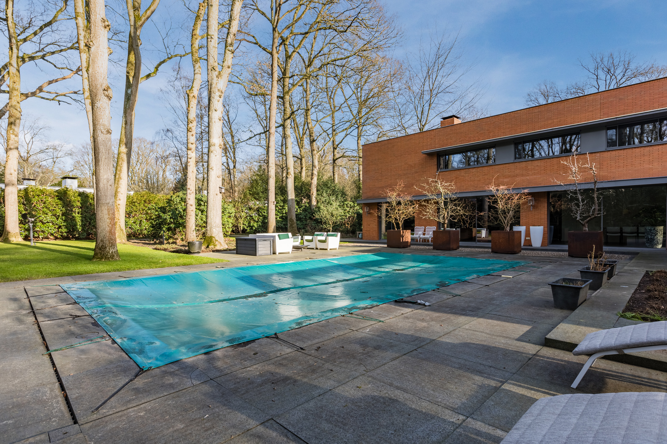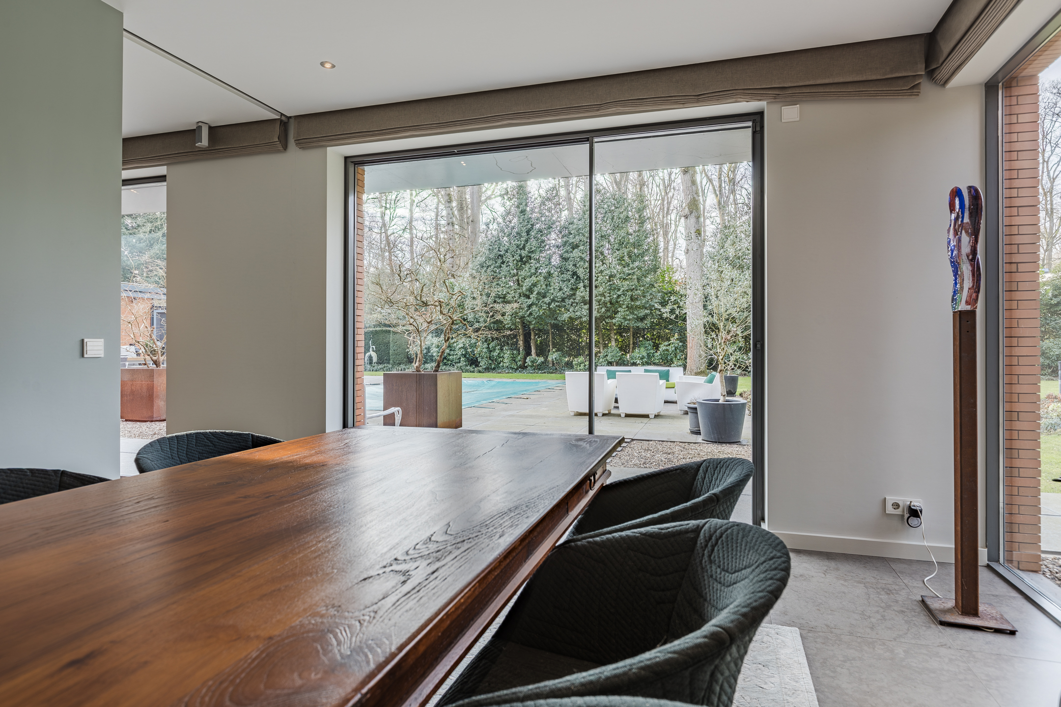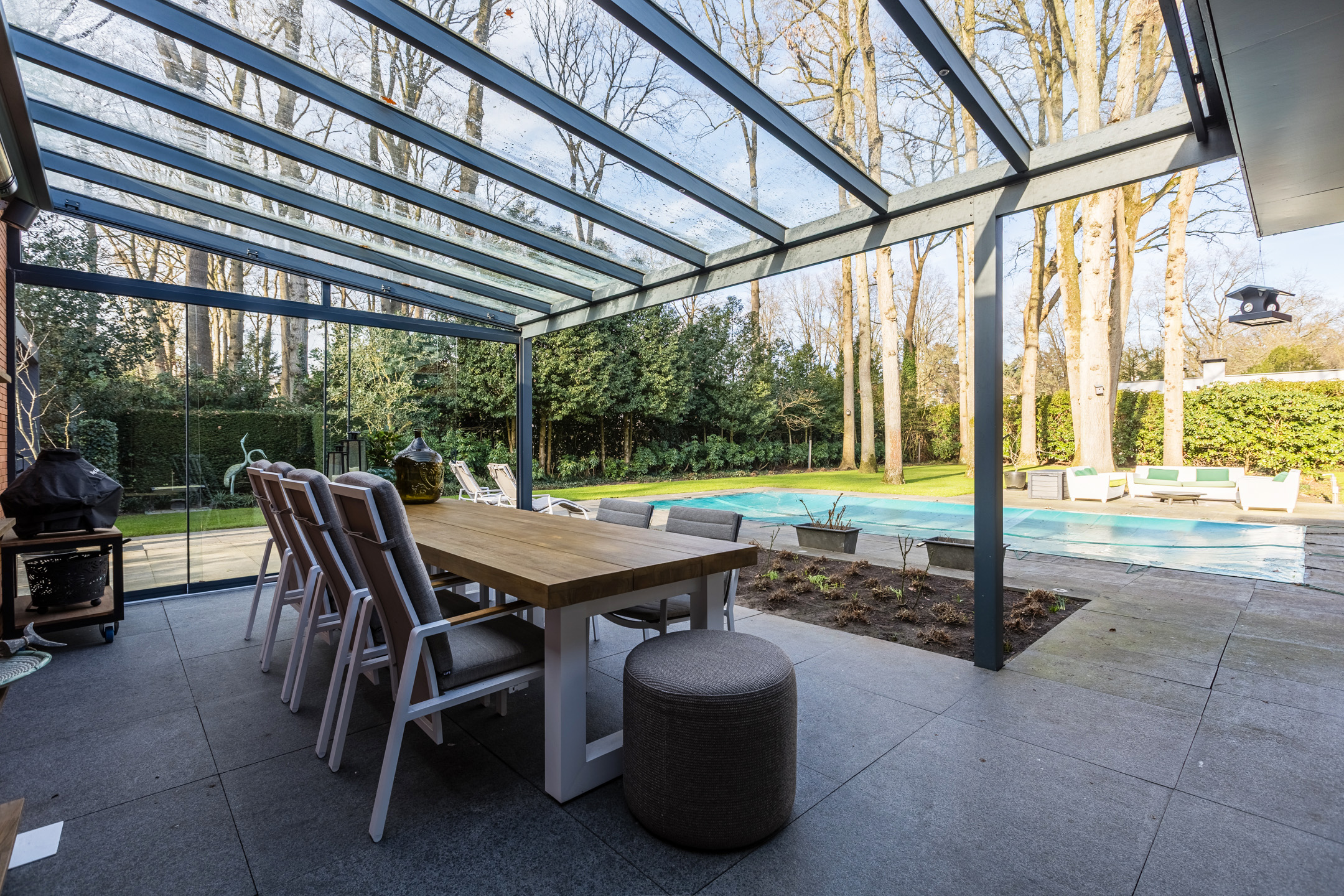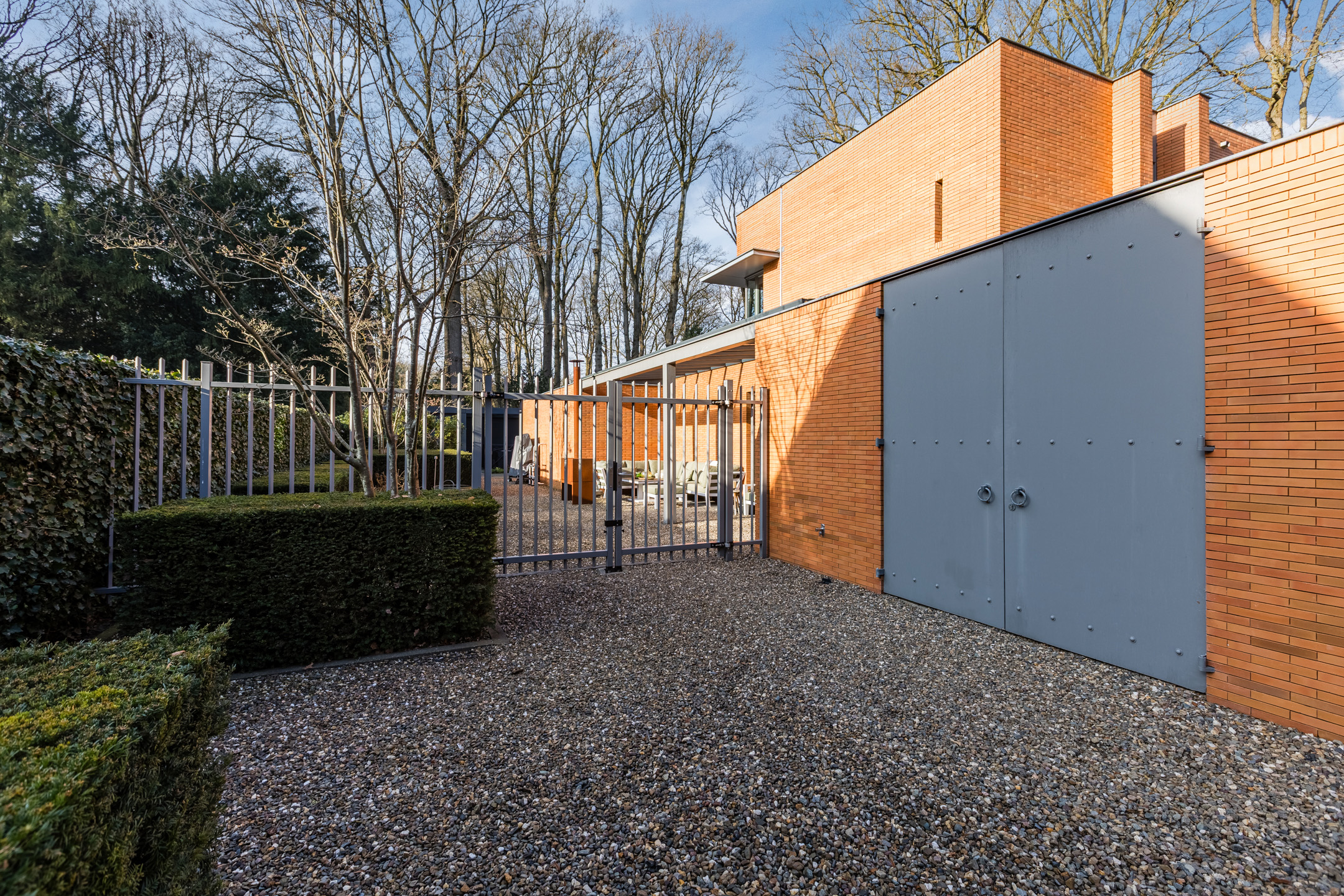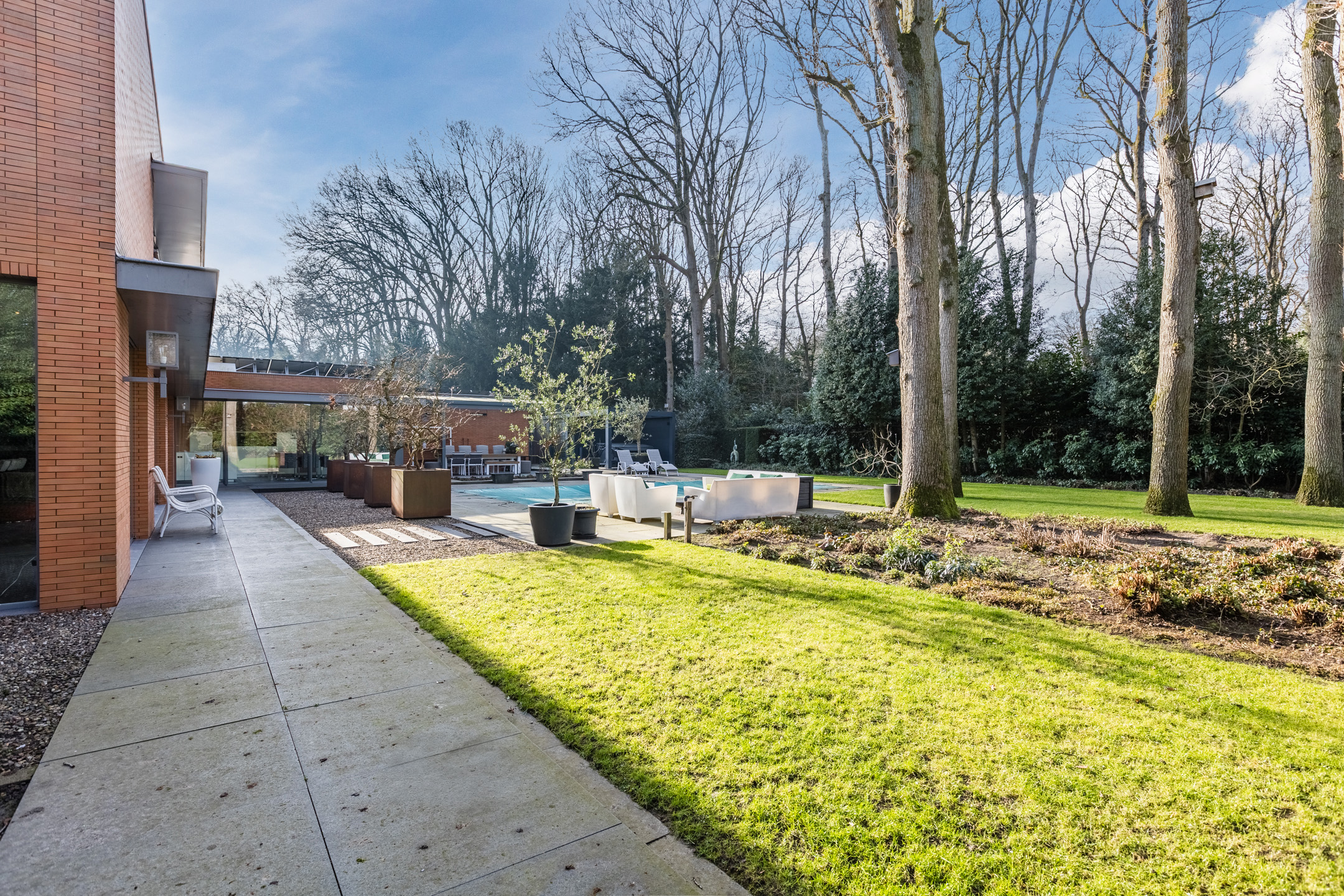 Achter de enigszins gesloten voorgevel schuilt een bijzondere villa die aan de achterzijde uit veel glaspartijen bestaat, waardoor de leefruimtes en slaapkamers overgaan in de tuin en bos.