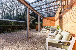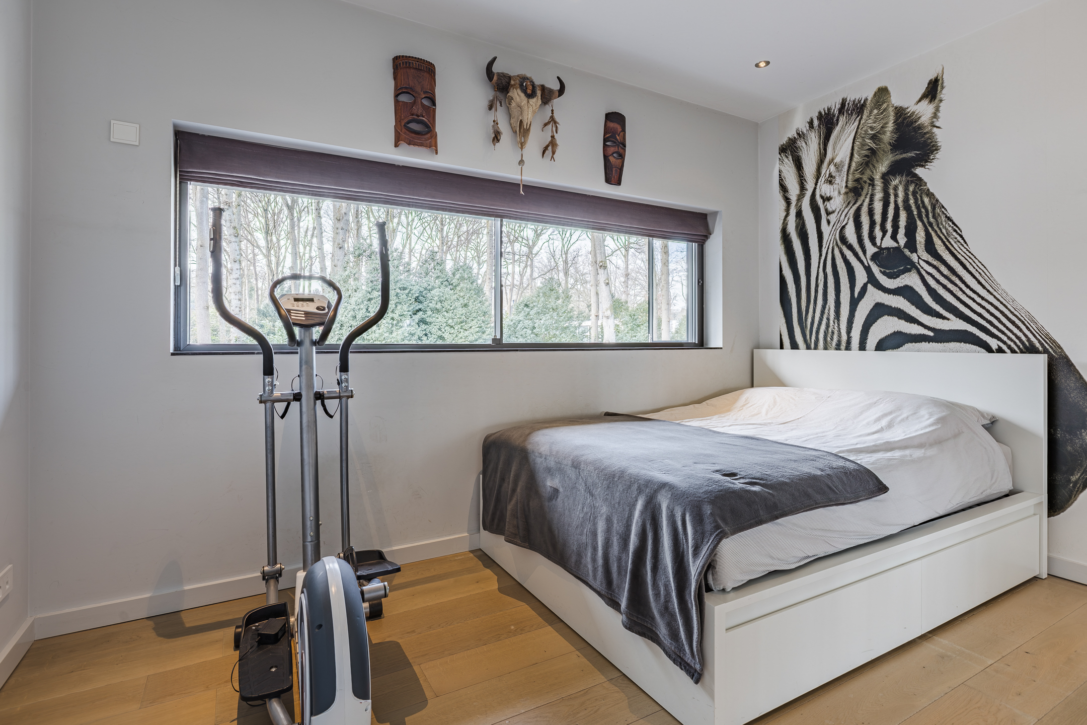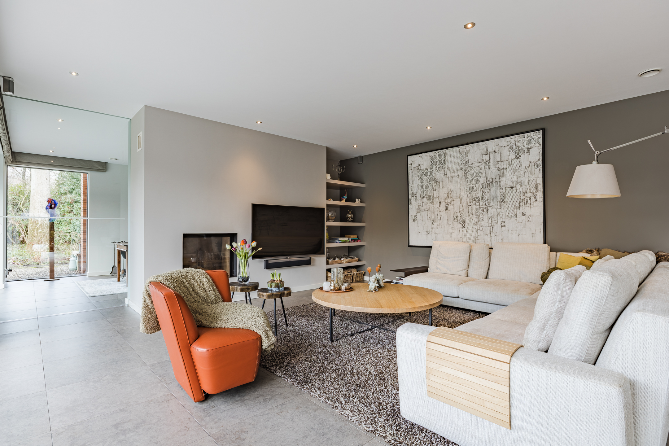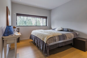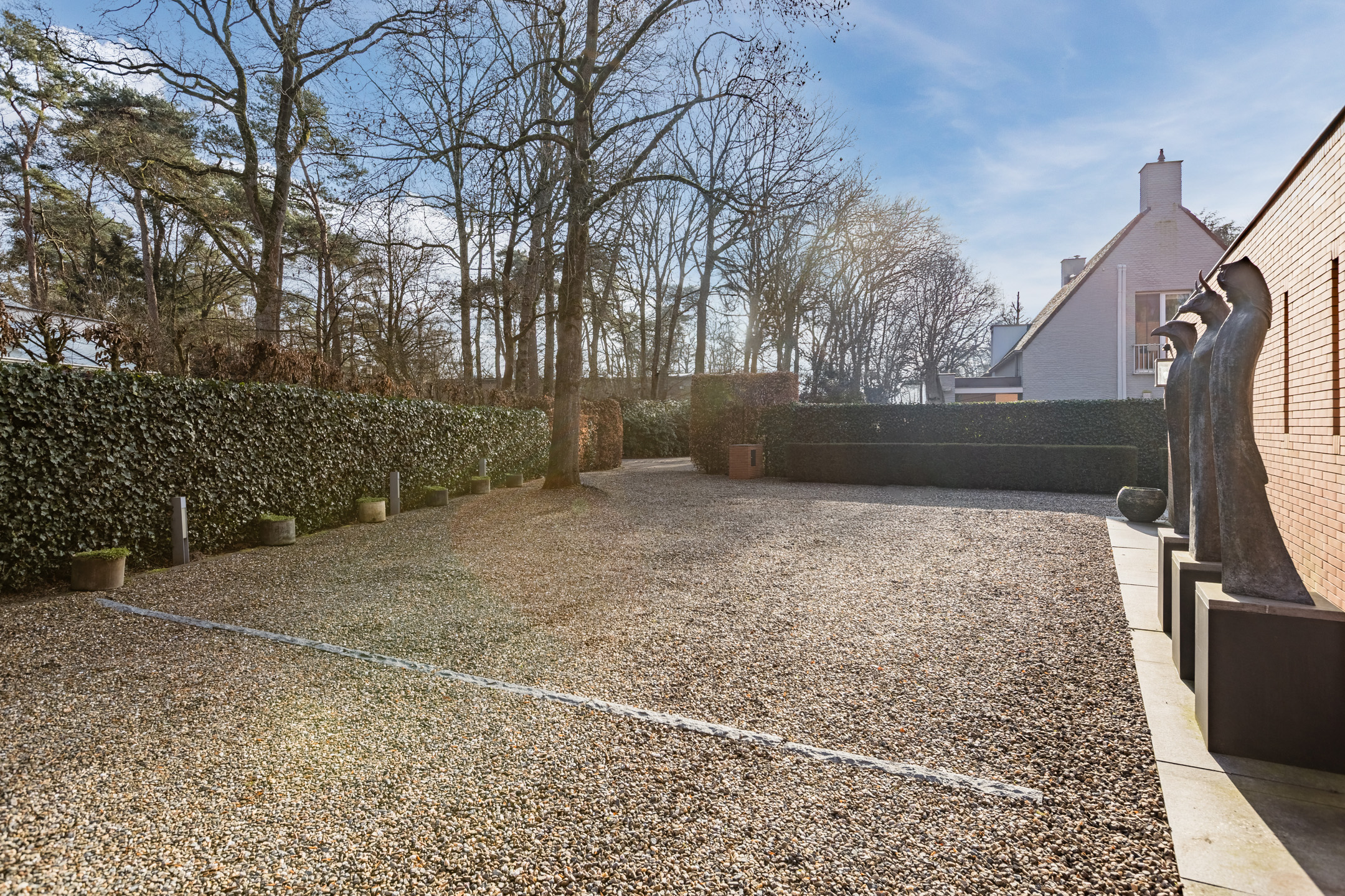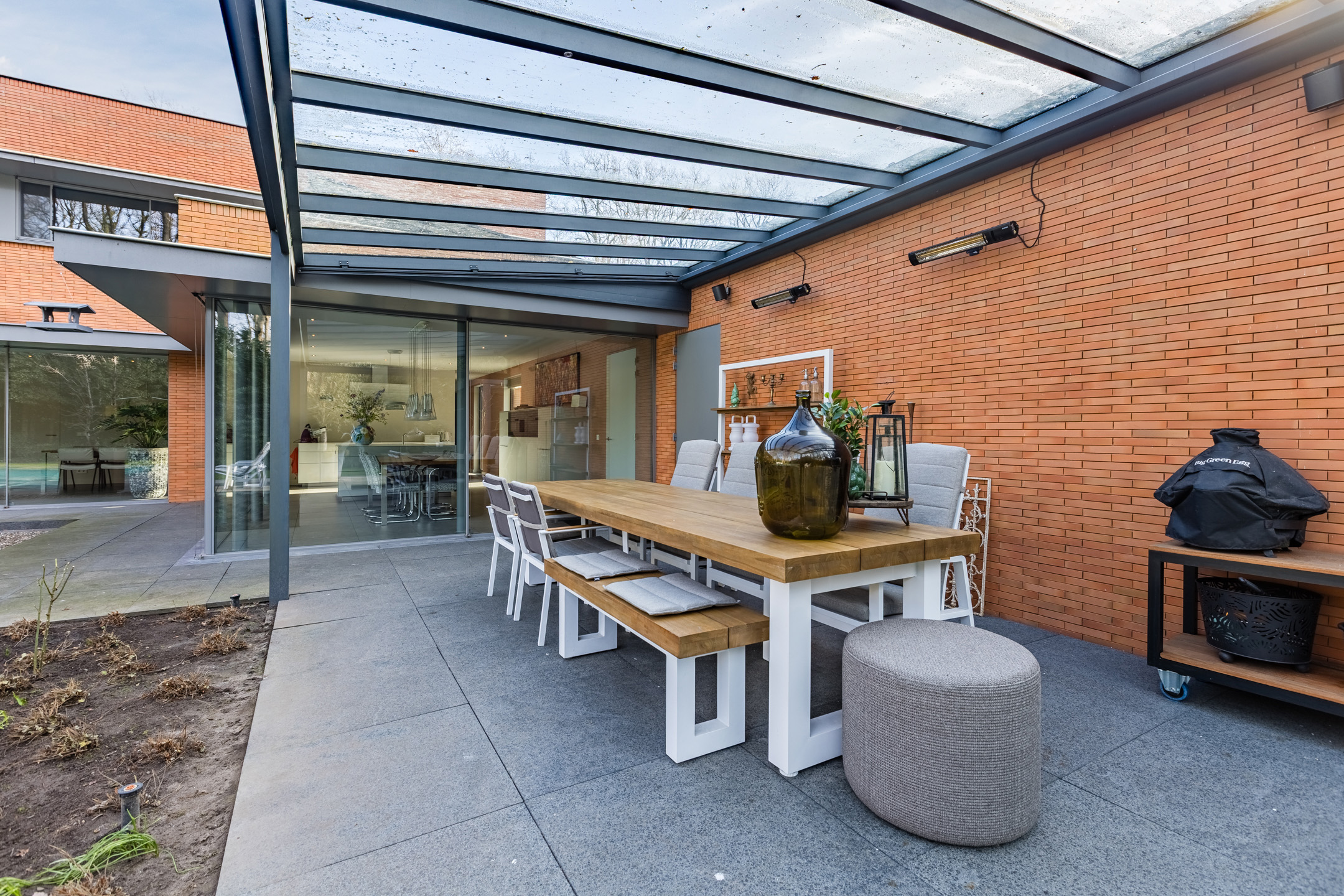 Achter de enigszins gesloten voorgevel schuilt een bijzondere villa die aan de achterzijde uit veel glaspartijen bestaat, waardoor de leefruimtes en slaapkamers overgaan in de tuin en bos.