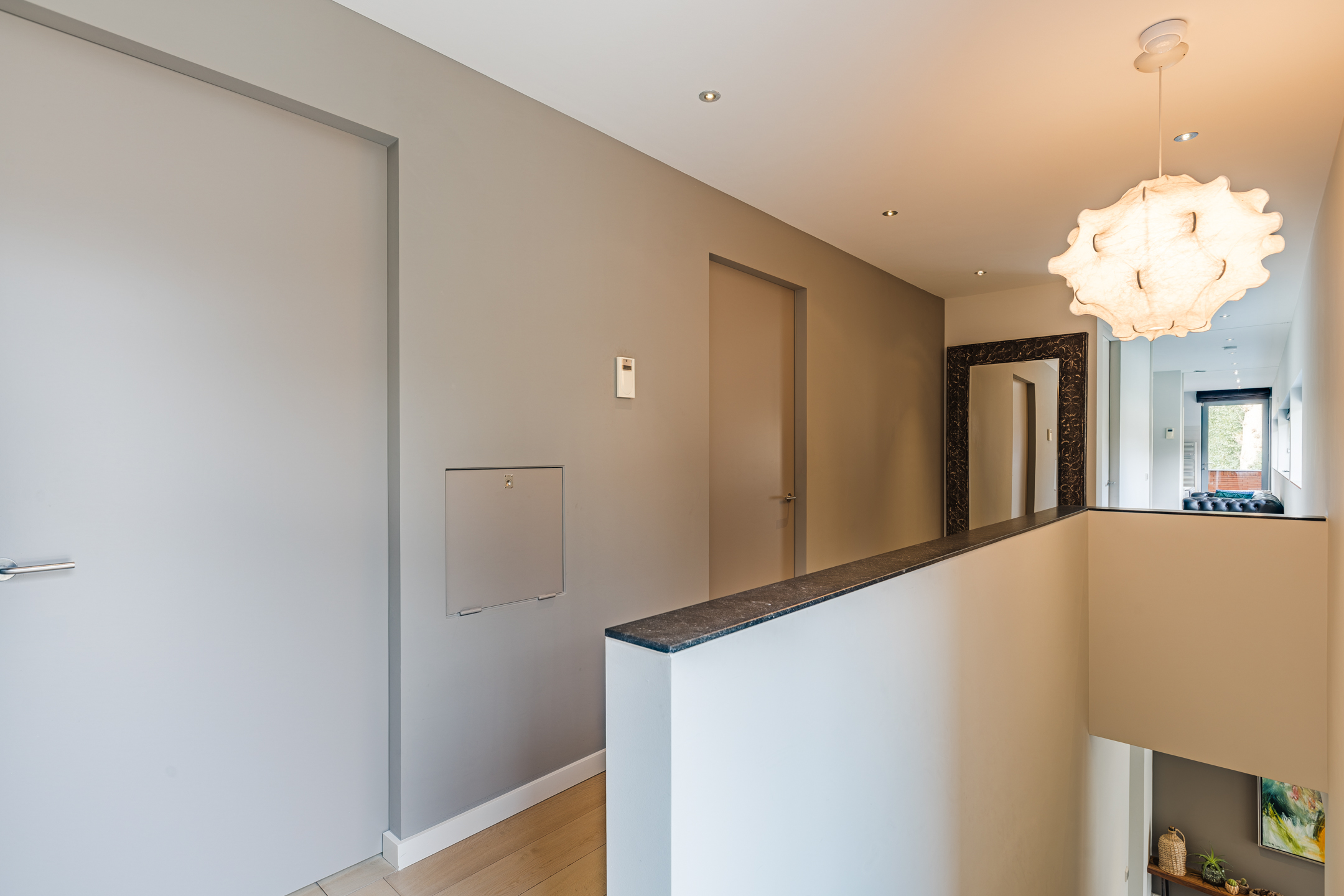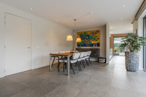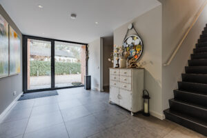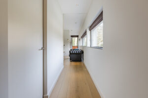 De hal geeft toegang tot de living, garage en trapopgang naar de verdieping. De trap is uitgevoerd in geperst staal, wat een bijzondere en strakke uitstraling geeft.