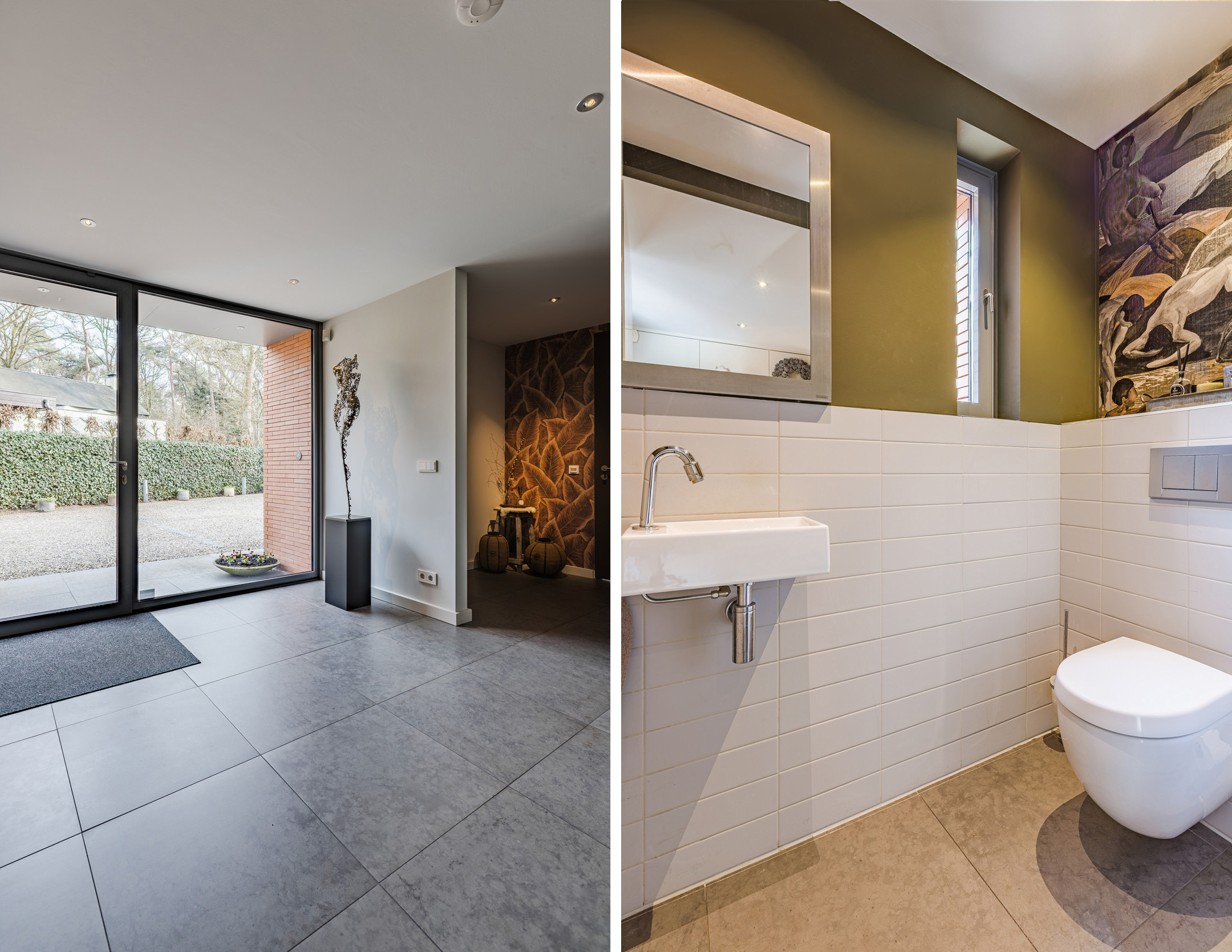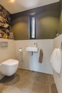 Overdekte entree, prachtige hal met garderobe hoek, zeer uitgebreide meterkast en een luxe toiletruimte voorzien van een vrij hangend toilet met fontein.