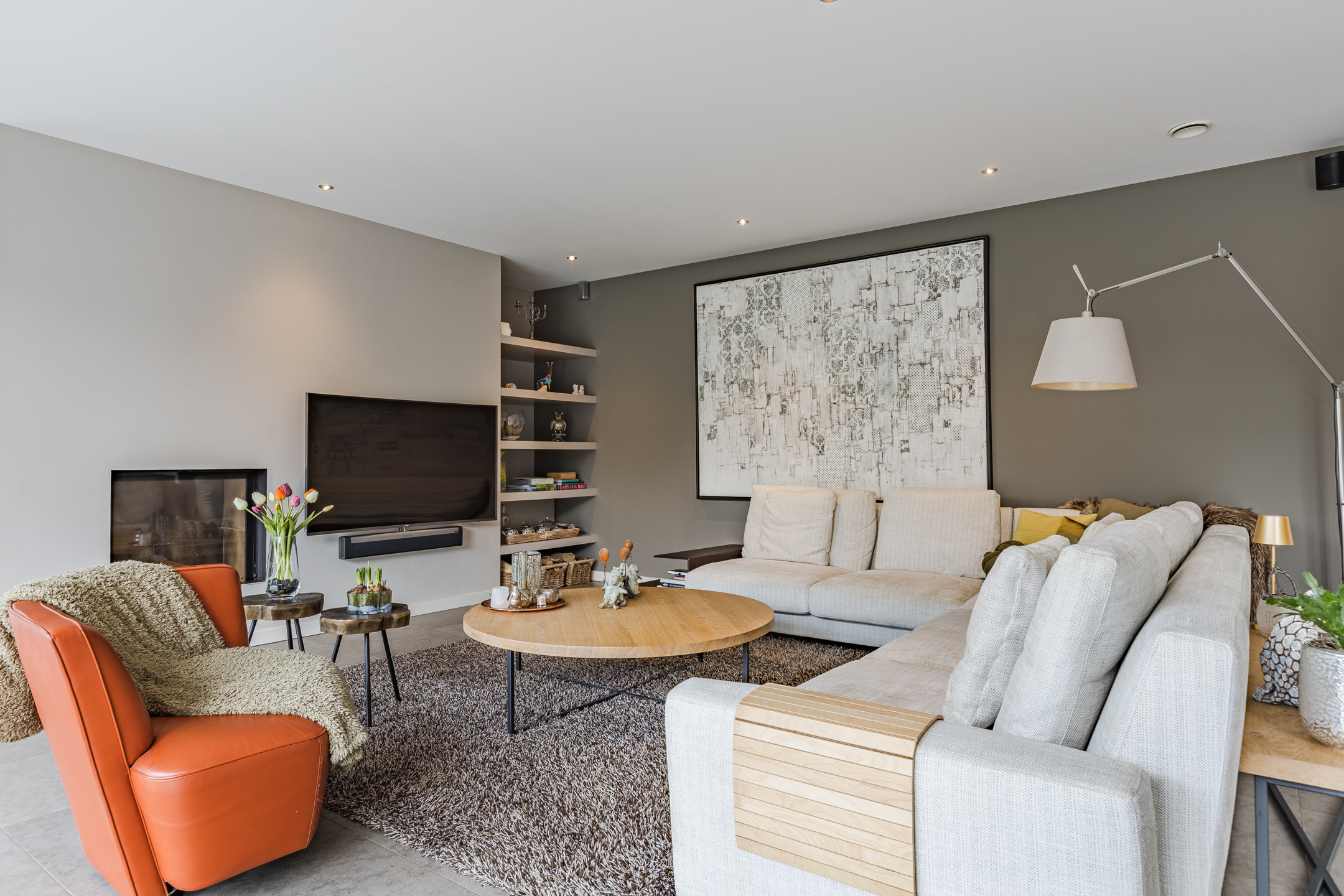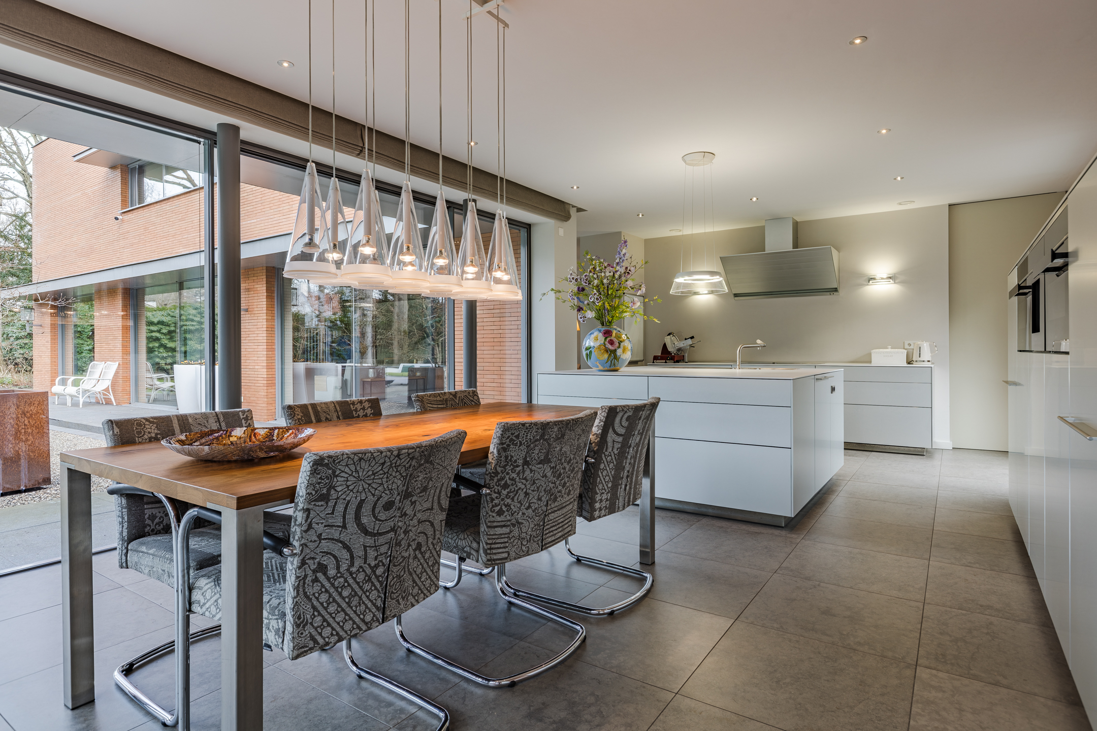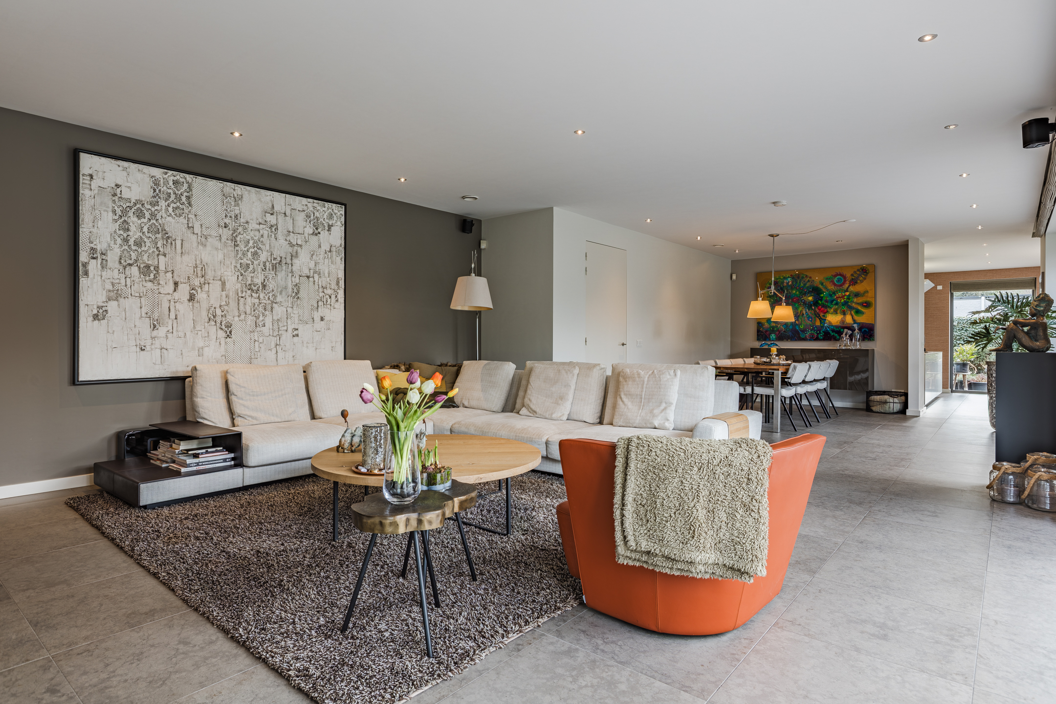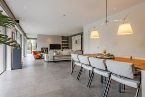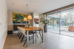 De prachtige tuingerichte living biedt door de vele glaspartijen een adembenemend uitzicht op de achtertuin. De living van circa 54m² (exclusief keuken) is bij het zitgedeelte voorzien van een strakke houtkachel.
