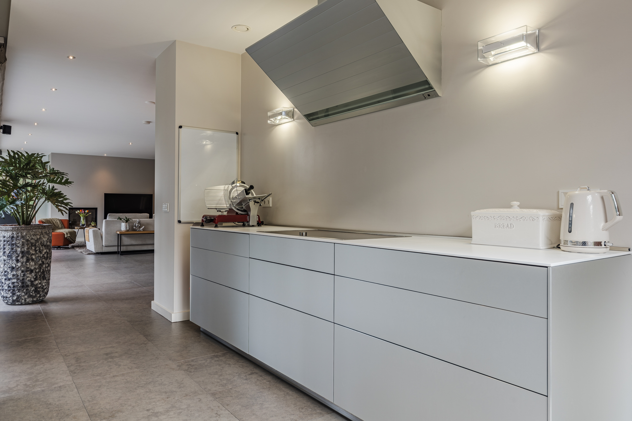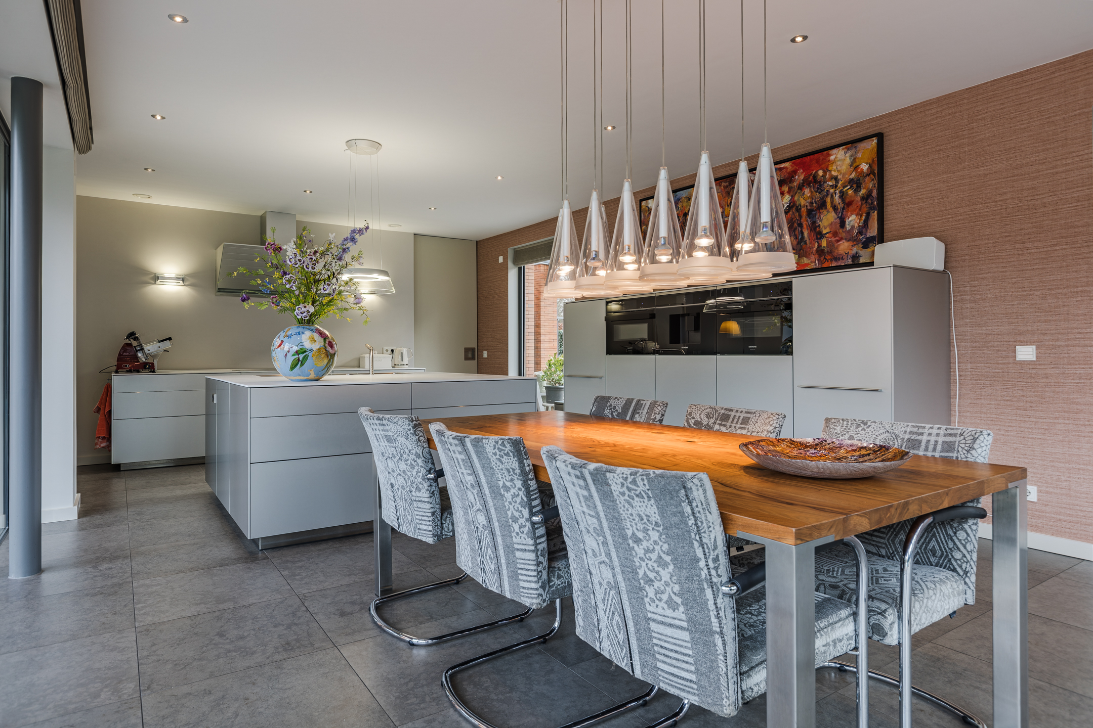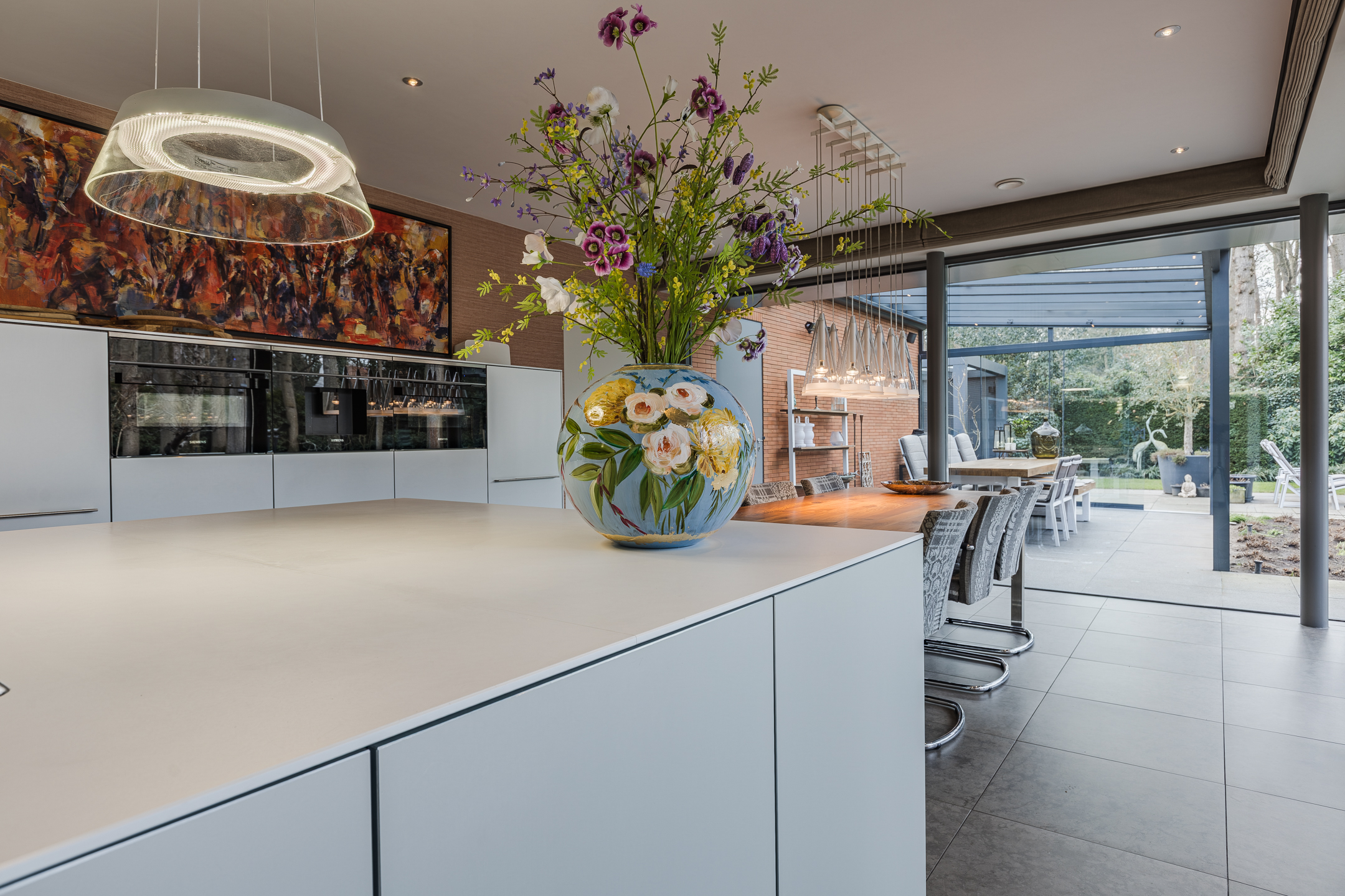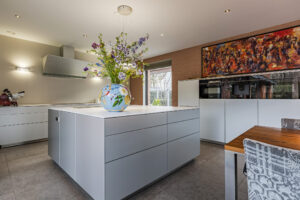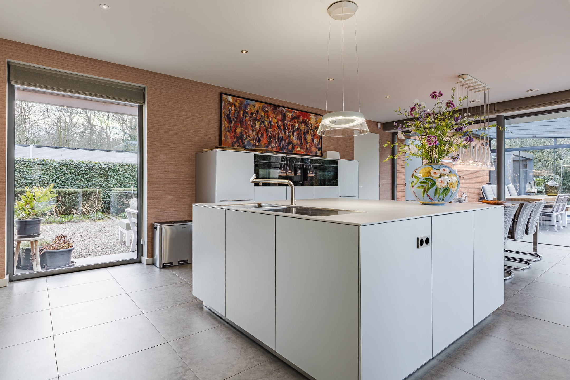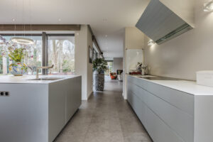 De moderne en luxe keuken van circa 35m² is zeer uitgebreid en bestaat uit een groot spoeleiland en een wandmeubel. De keukeninrichting is voorzien van een inductie kookplaat, afzuigkap, koelkast, combi oven, stoom oven, geïntegreerde koffie machine en een vaatwasser.