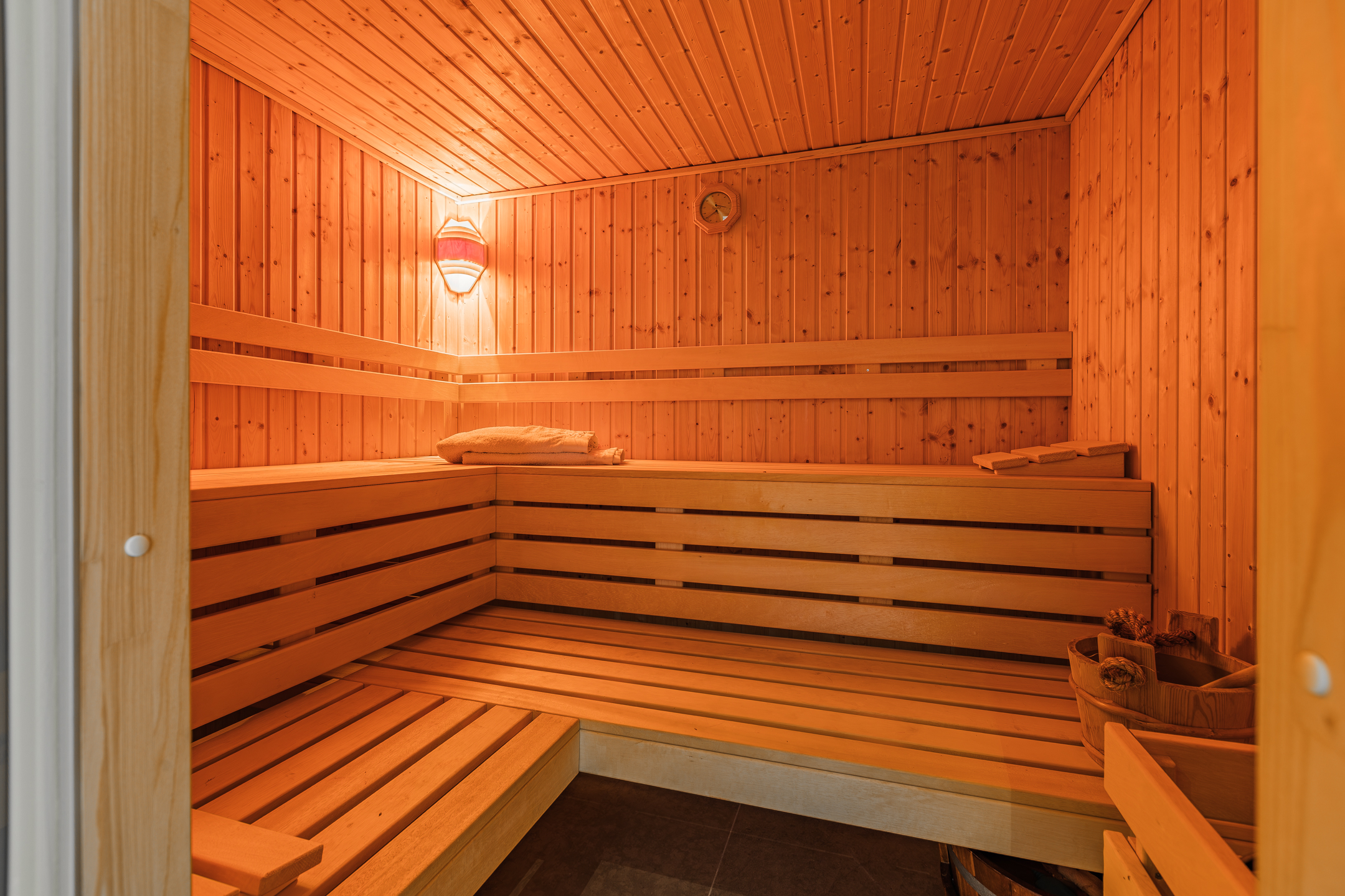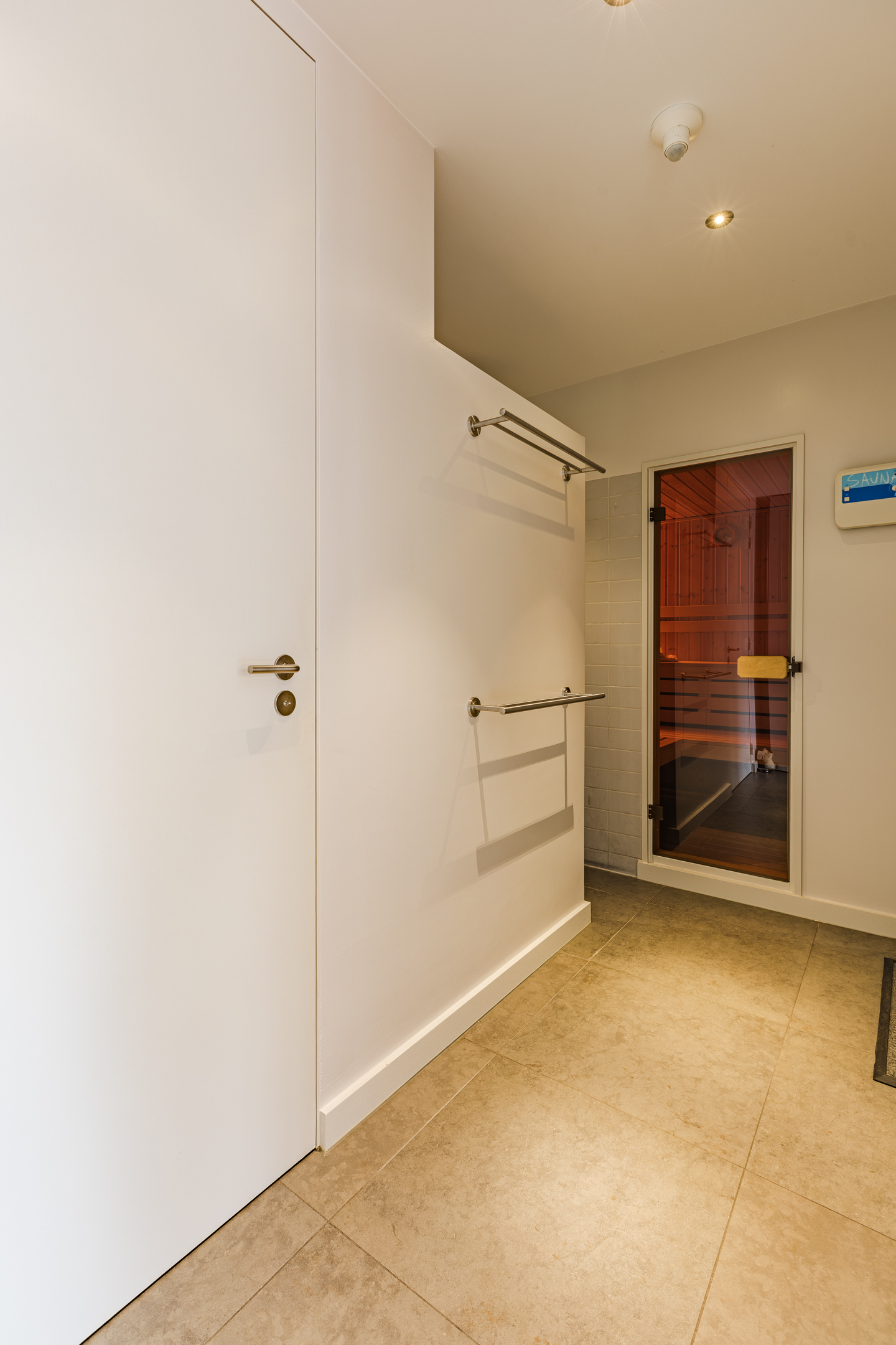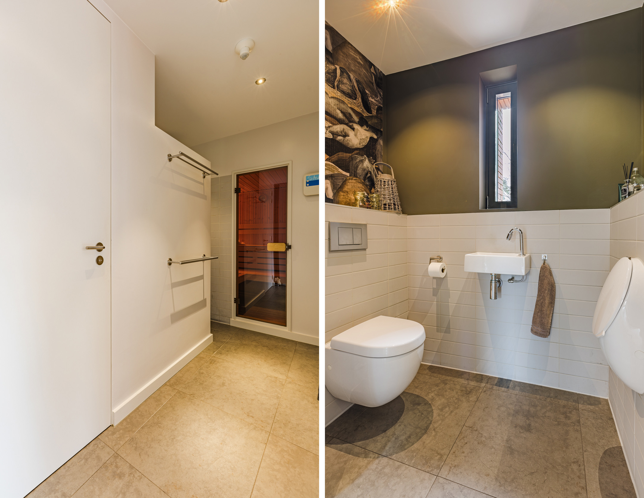 Aan de achterzijde van de villa bevindt zich een aparte doucheruimte met dubbele inloopdouche, modern toilet, urinoir en een sauna. Deze ruimte is direct vanuit de achtertuin te bereiken, handig voor of na het zwemmen.