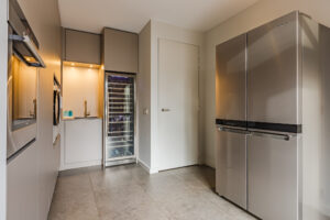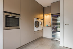 Bijkeuken met een praktische vaste kastenwand voor extra provisie-/ bergruimte, oven en een klimaatkast. Hier bevinden zich tevens de aansluitingen voor de wasapparatuur.