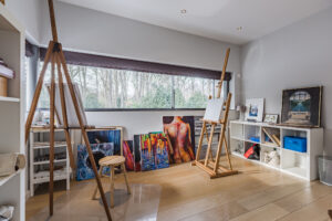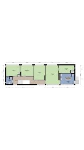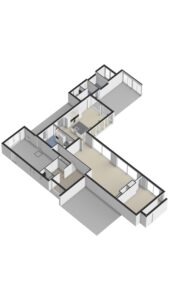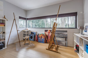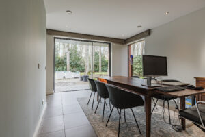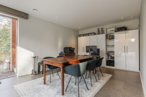 Aansluitend is middels een schuifdeur een kantoor/ speelkamer circa 21m² te bereiken. De vele glaspartijen geven tevens een adembenemend uitzicht op de achtertuin en middels een schuifpui is er toegang tot de achtertuin.