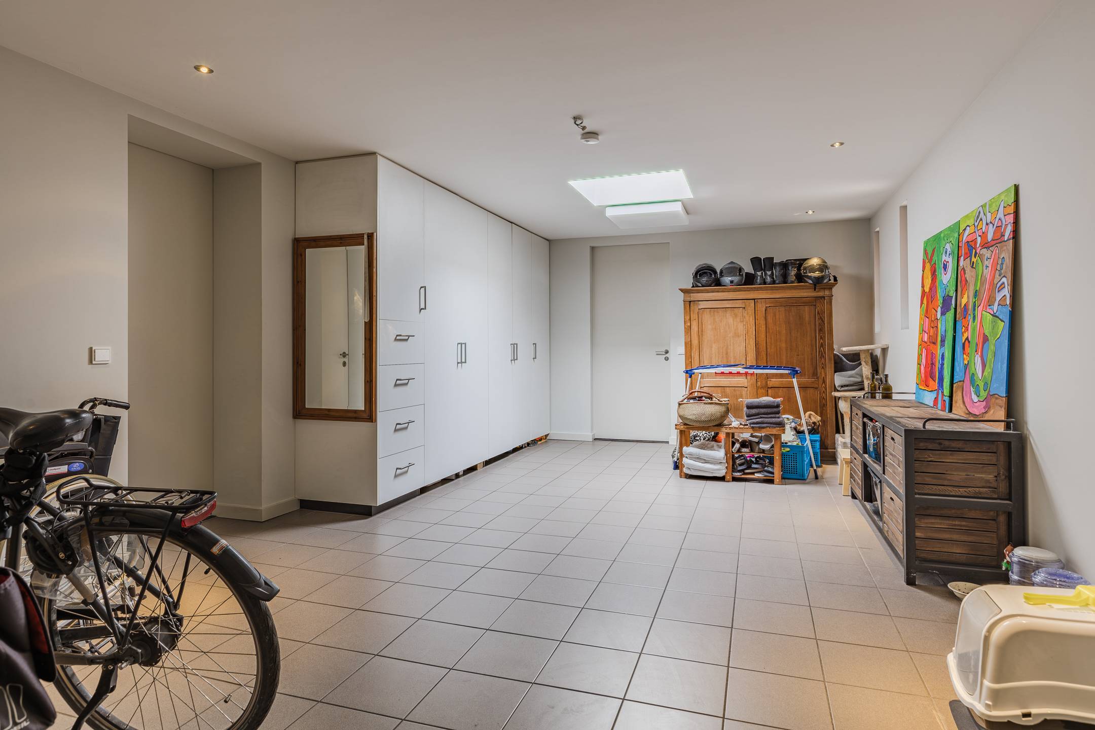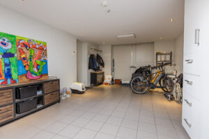 Inpandig bereikbare garage circa 31m² met twee openslaande deuren en een loopdeur, lichtkoepel, tegelvloer, stortbak, diverse praktische ingebouwde kasten en een 2e WTW-unit.