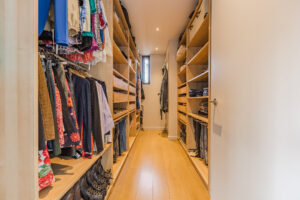 Ruime inloopgarderobe met aansluitend een vaste kast met de opstelplaats van de WTW-unit.