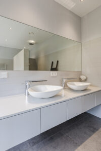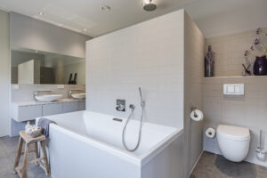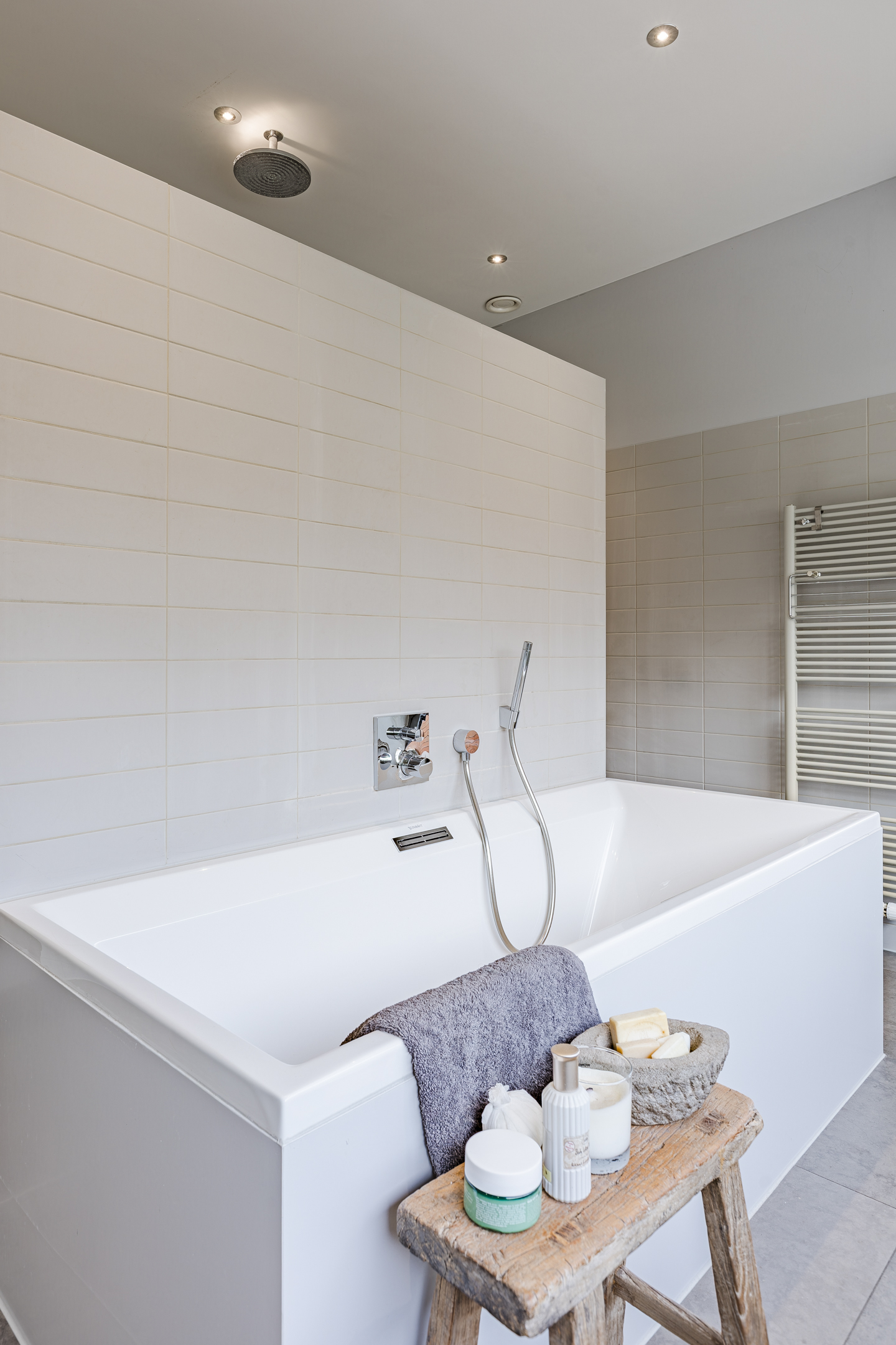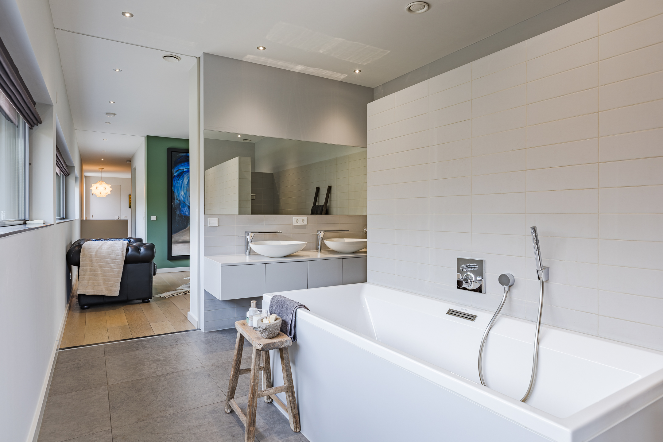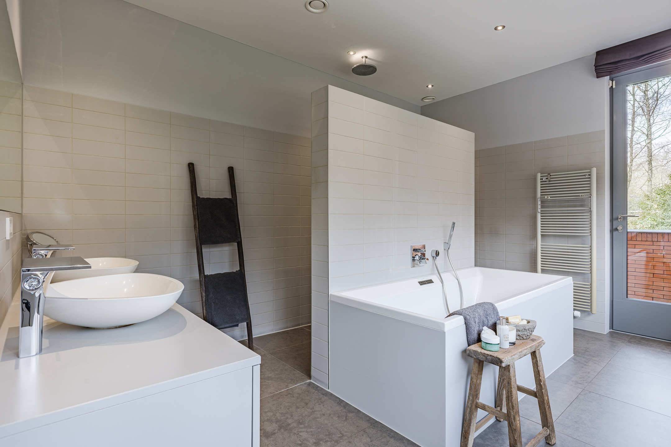 Luxe badkamer voorzien van twee waskommen met meubel, ligbad, inloopdouche met regendouche en inbouw kranen, vrij hangend toilet en een design radiator.
