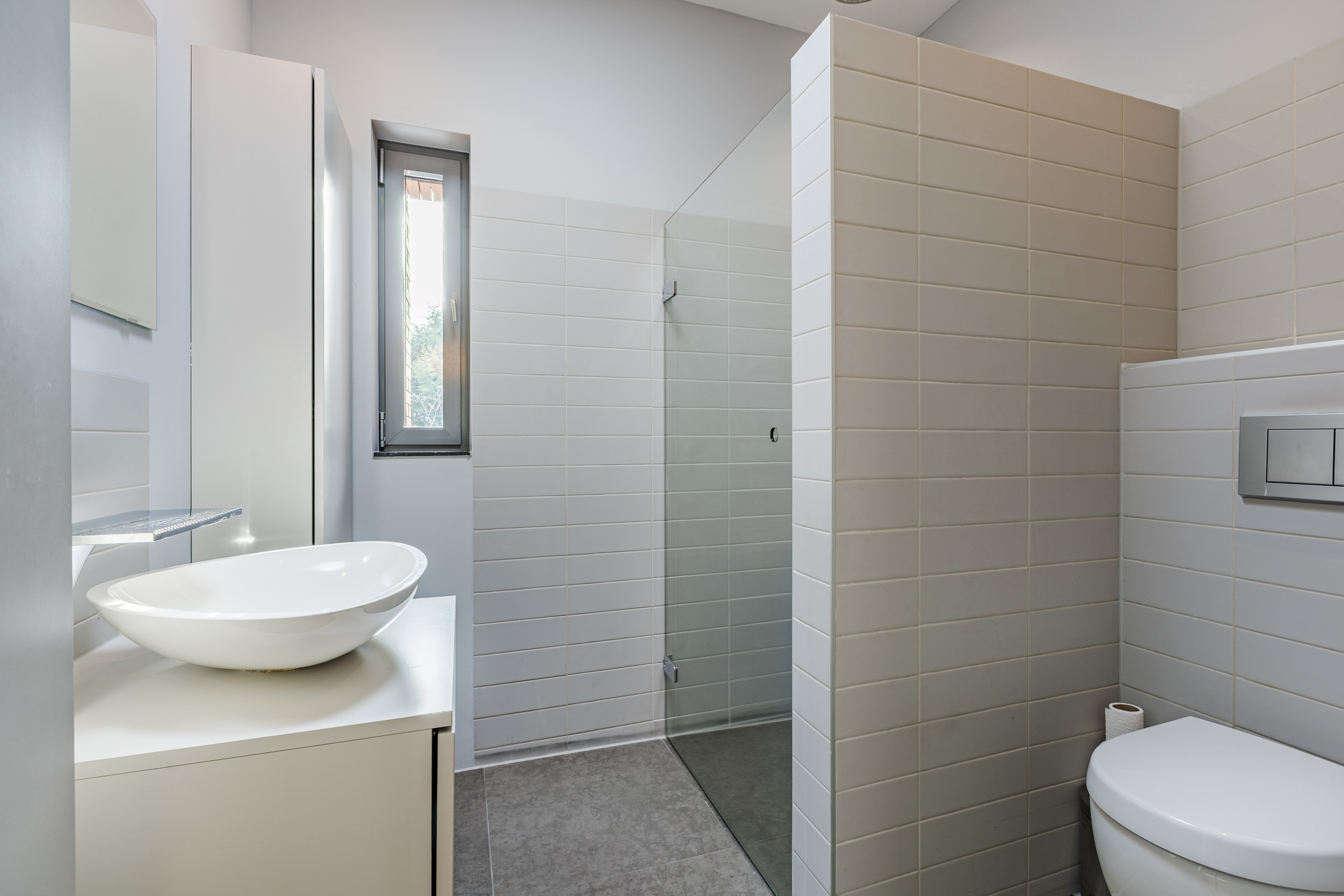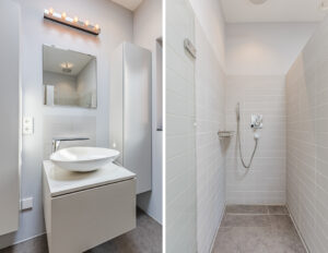 Tweede badkamer voorzien van een vaste wastafel met meubel, inloopdouche met inbouwkranen en een vrij hangend toilet. In de badkamer is daarnaast een lichtkoepel aanwezig voor een prettige lichtinval.