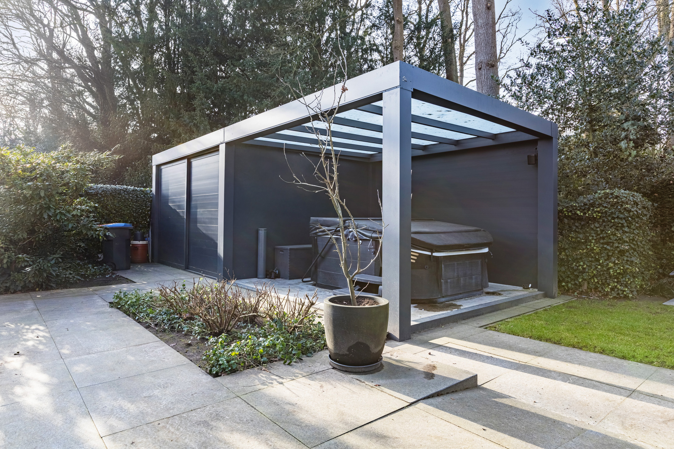 Er is een aparte berging voor de fietsen/ tuingerei met een derde overkapping, welke op dit moment wordt gebruikt voor een jacuzzi.