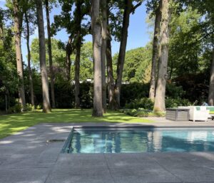 De achtertuin is op het zonnige westen gelegen en van alle gemakken voorzien, zoals een zwembad, drie overkappingen, berging en diverse terrassen. Naast een garage en een carport voor drie auto’s is er parkeergelegenheid voor meerdere auto’s op eigen terrein.
