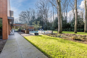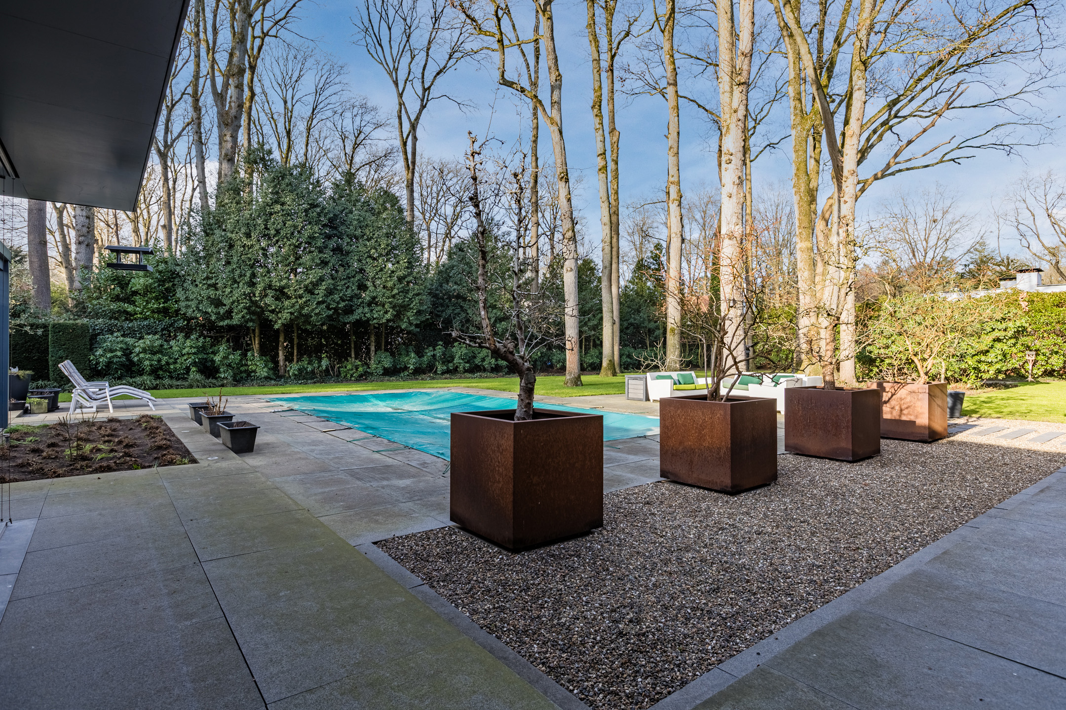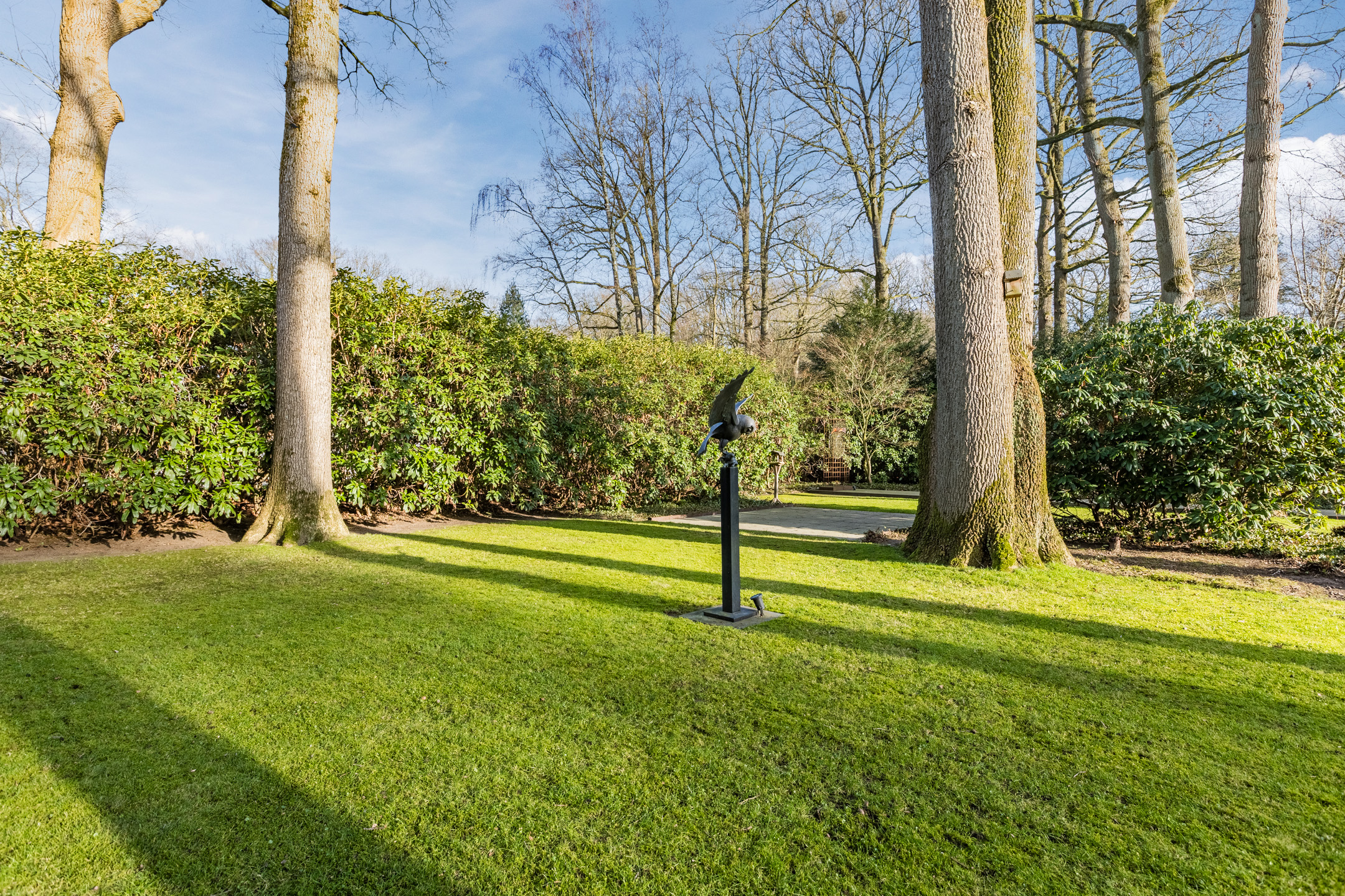 De royale en privacy biedende achtertuin is op het zonnige westen gelegen. De onder architectuur aangelegde tuin is omringd door groen, prachtige monumentale bomen en er is een beregeningssysteem aanwezig. Het geheel is omheind.