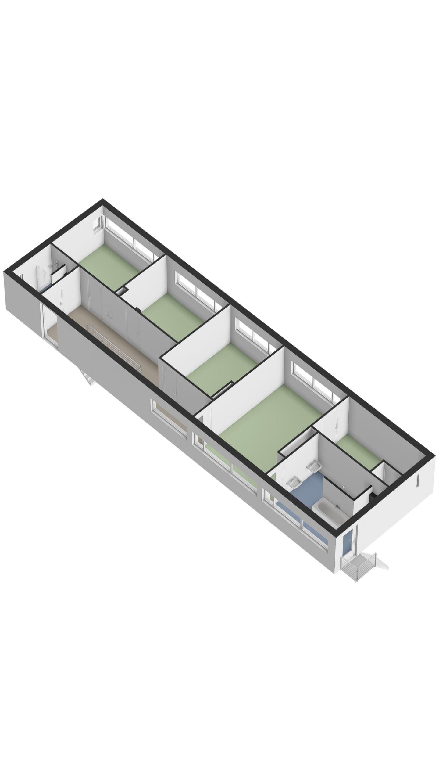 Via een trapopgang vanuit de tuin is de badkamer middels een deur te bereiken, wat ideaal is na het tuinieren of na het zwemmen.