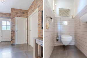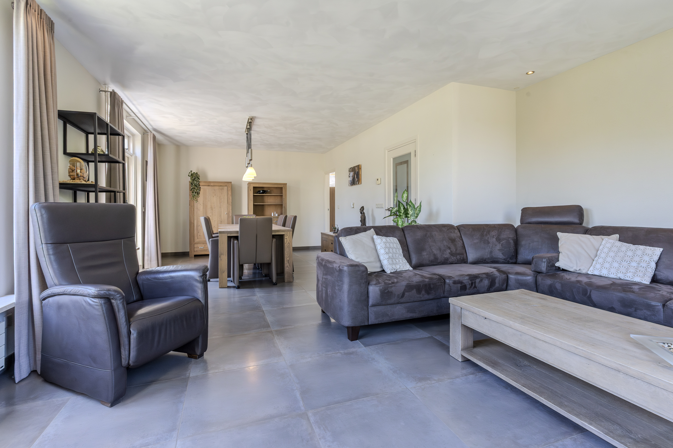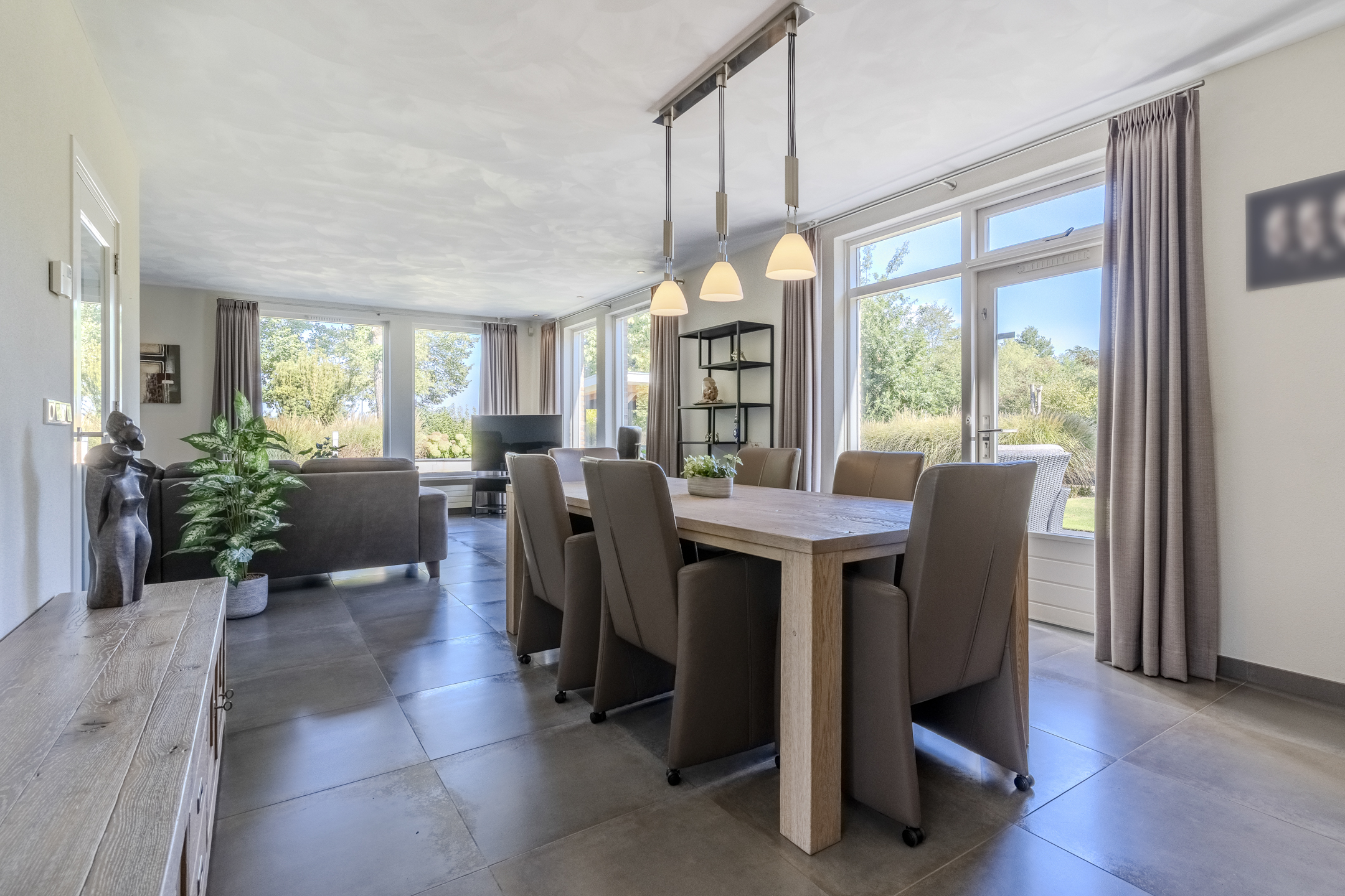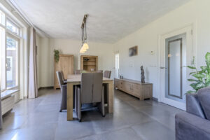 De begane grond is grotendeels voorzien van dezelfde doorlopende, prachtige tegelvloer voorzien van vloerverwarming.