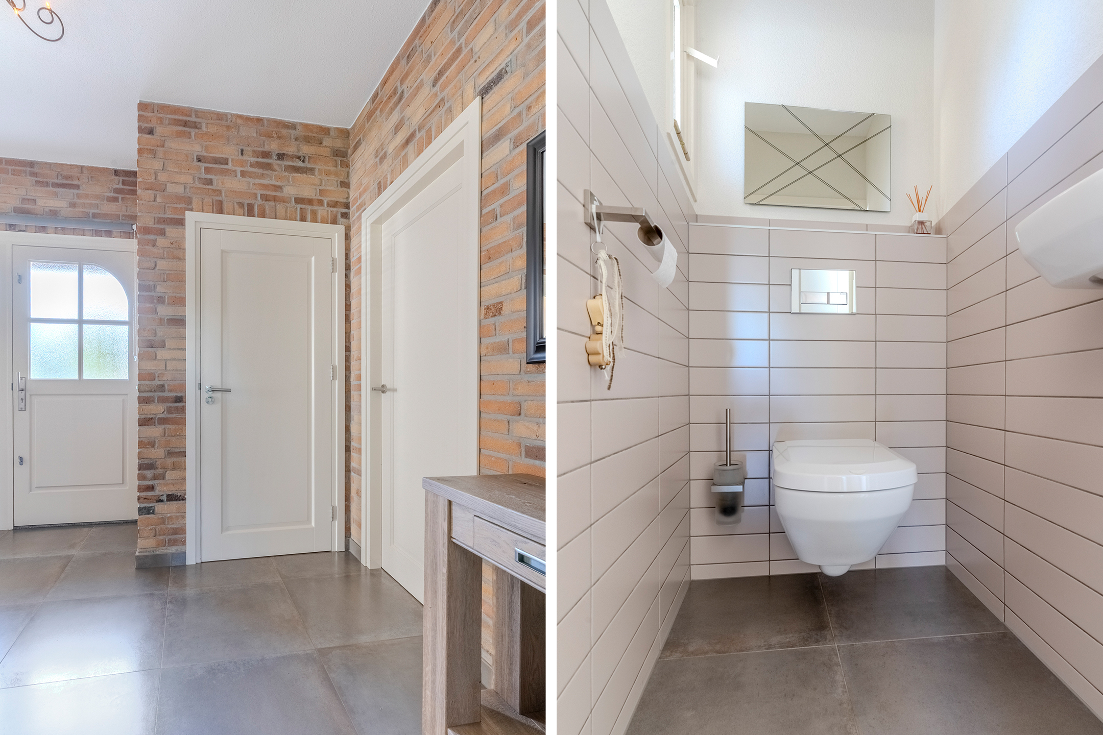 Overdekte entree, hal met uitgebreide meterkast, praktische trapkast en een moderne toiletruimte (2010) voorzien van een vrij hangend toilet met fontein.