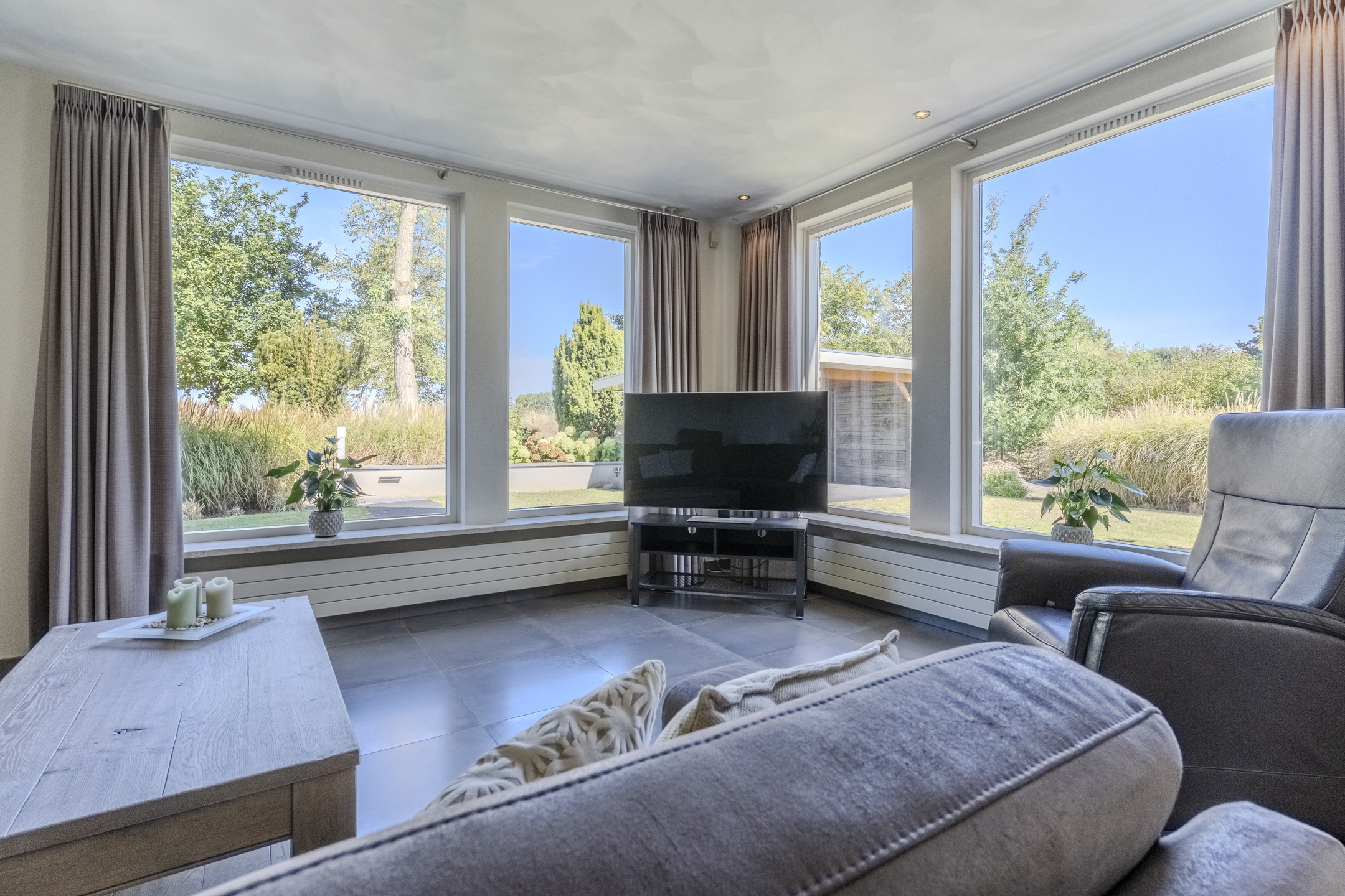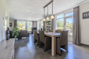 Sfeervolle en tuingerichte woonkamer circa 39m² (exclusief keuken) met spachtelputz wandafwerking, schuurwerk plafondafwerking met inbouwspots en een deur naar de achtertuin. De vele raampartijen zorgen voor veel lichtinval en een fraai zicht op de achtertuin.