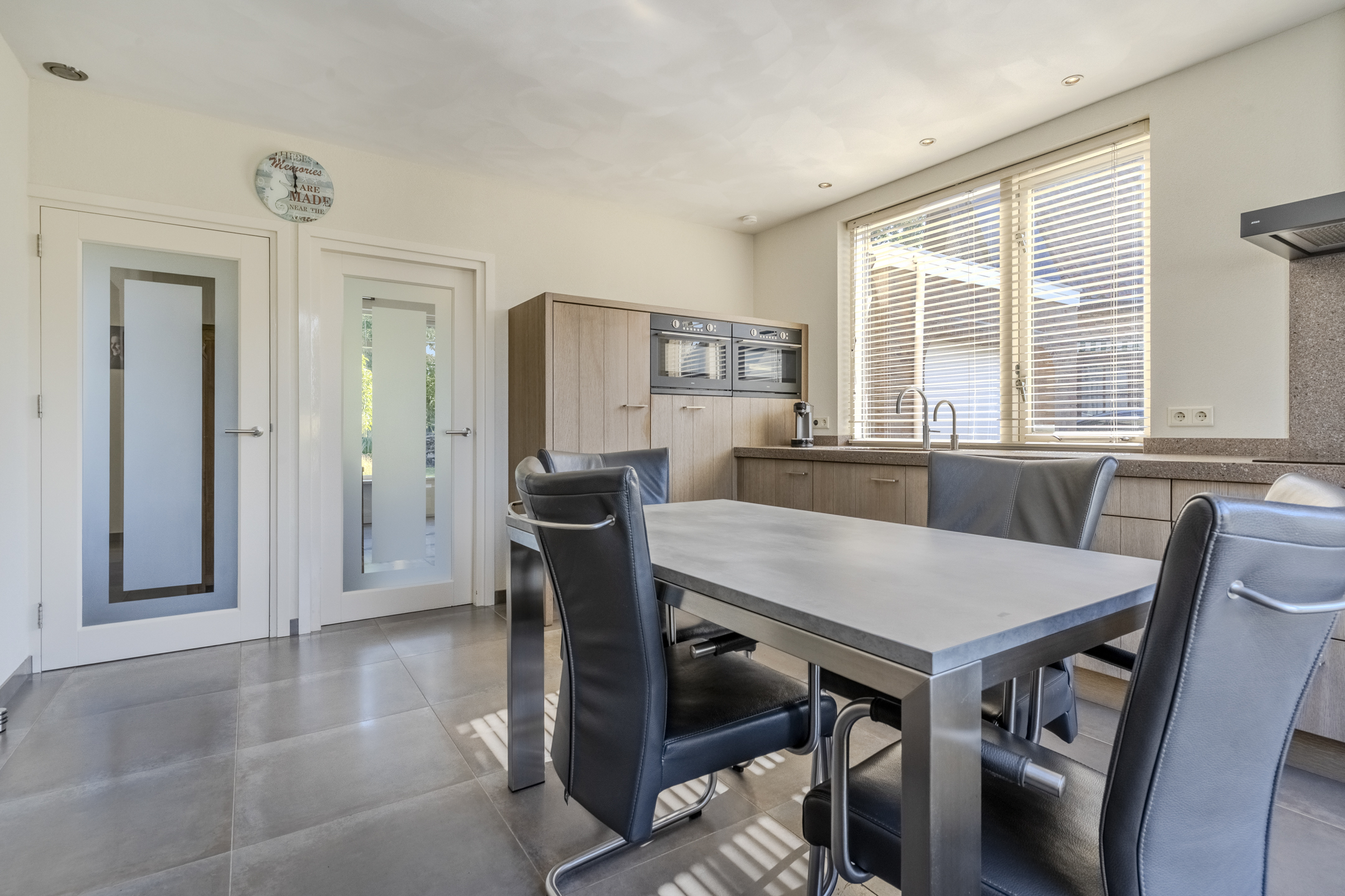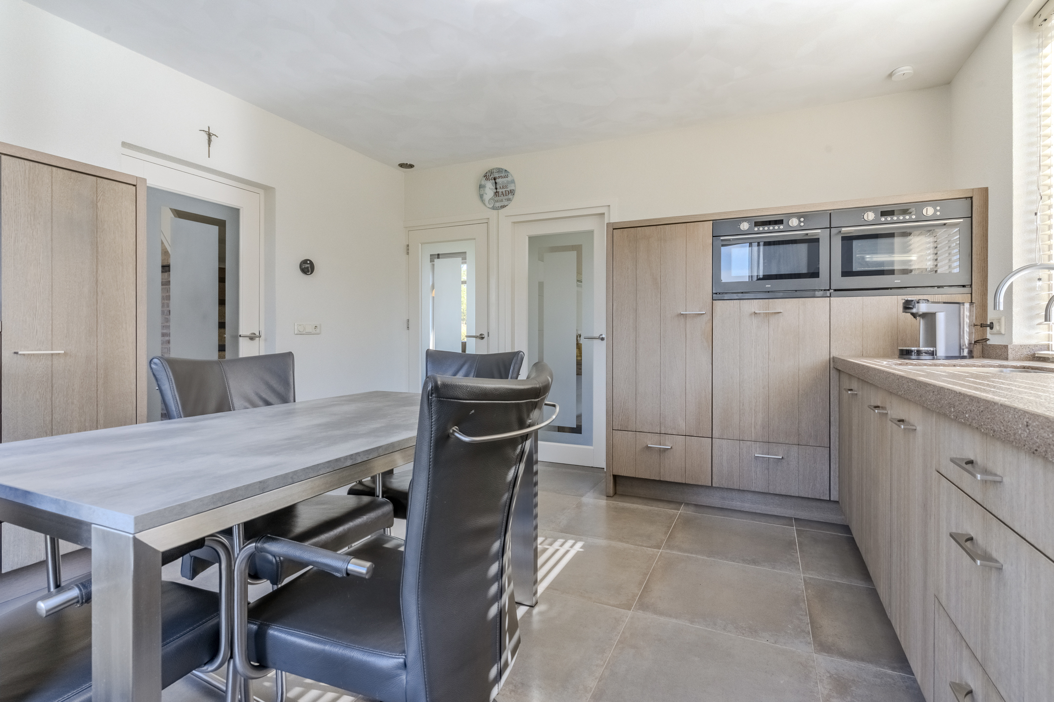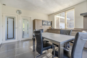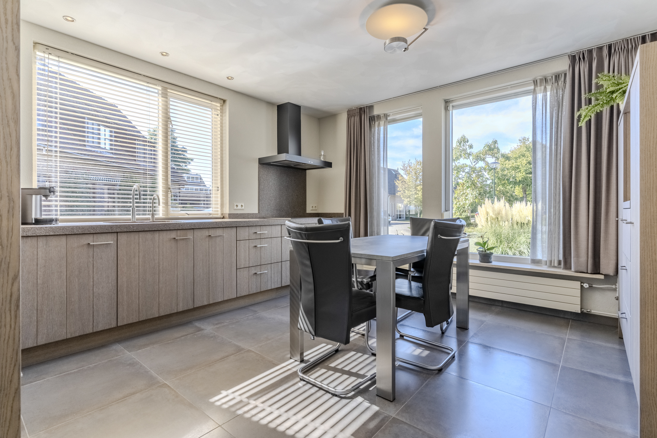 Aan de voorzijde van de woning gelegen woonkeuken circa 17m² voorzien van schuurwerk plafondafwerking met inbouwspots en een luxe en moderne keukeninrichting (Frako, 2010) bestaande uit een keukeninrichting in hoekopstelling met een wandmeubel. De grote raampartijen geven een fraai zicht op het straatbeeld.
