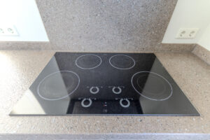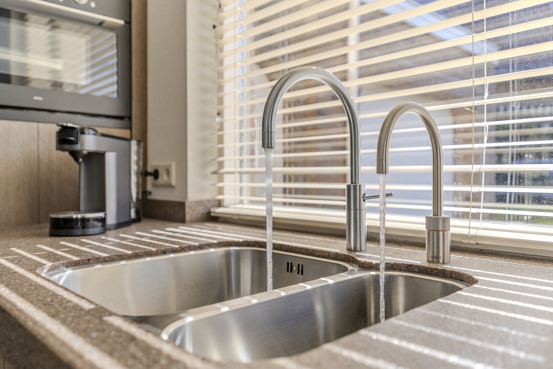 De keukeninrichting is voorzien van een kwartscomposiet blad, quooker, inductie kookplaat, afzuigkap, koelkast, stoomoven, combi magnetron en een vaatwasser (op hoogte).