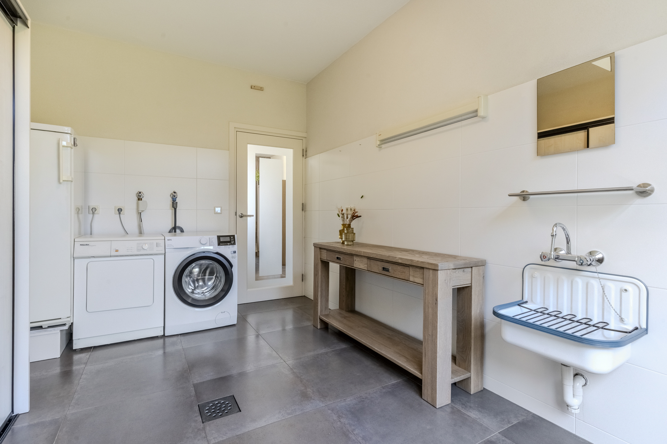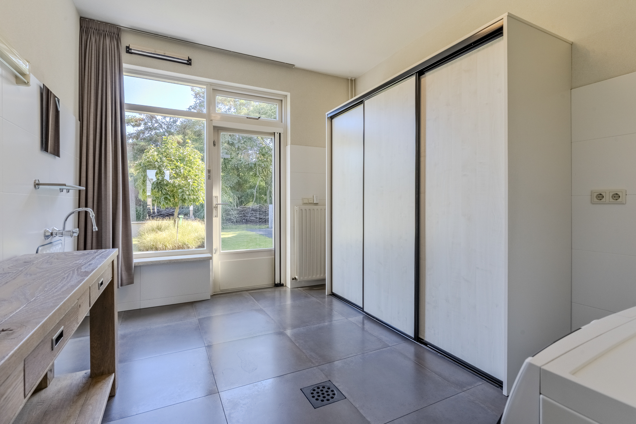 Ruime en praktische bijkeuken circa 12m² met een vaste kastenwand, de aansluitingen voor de wasapparatuur, stortbak en een deur naar de achtertuin.